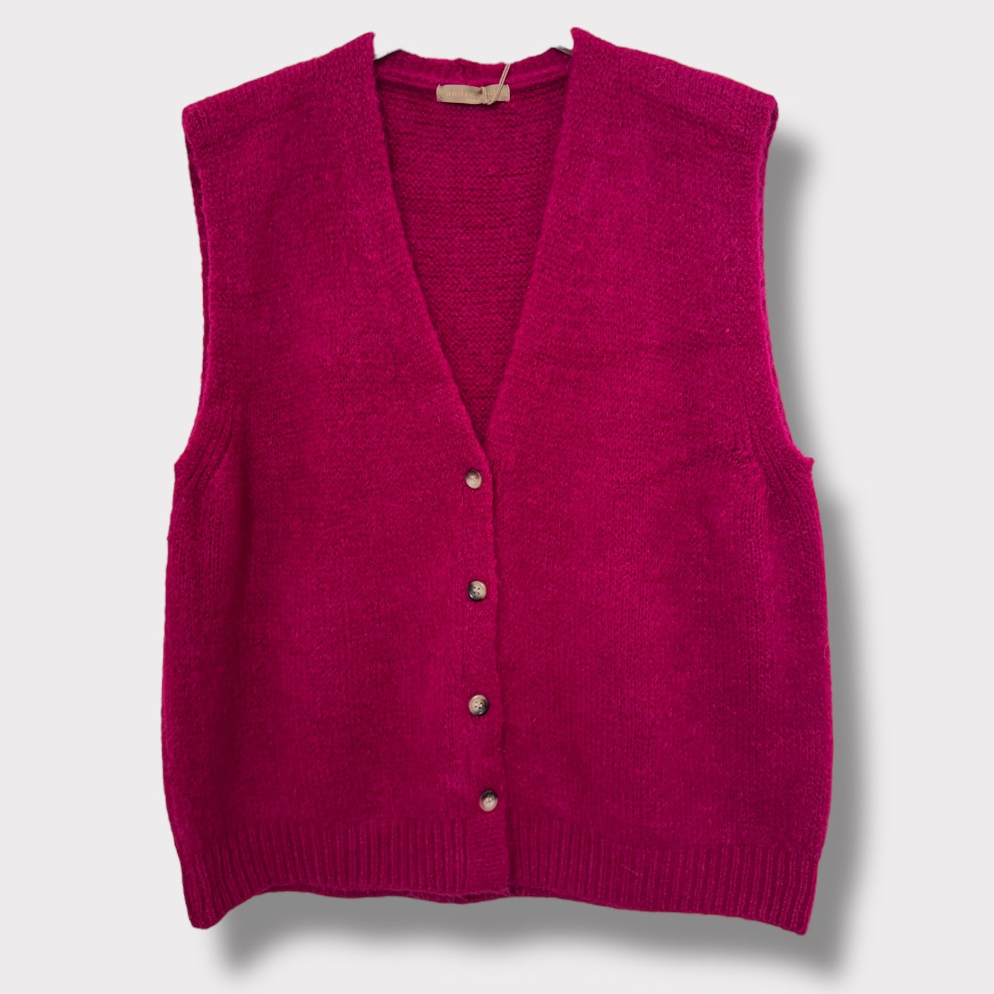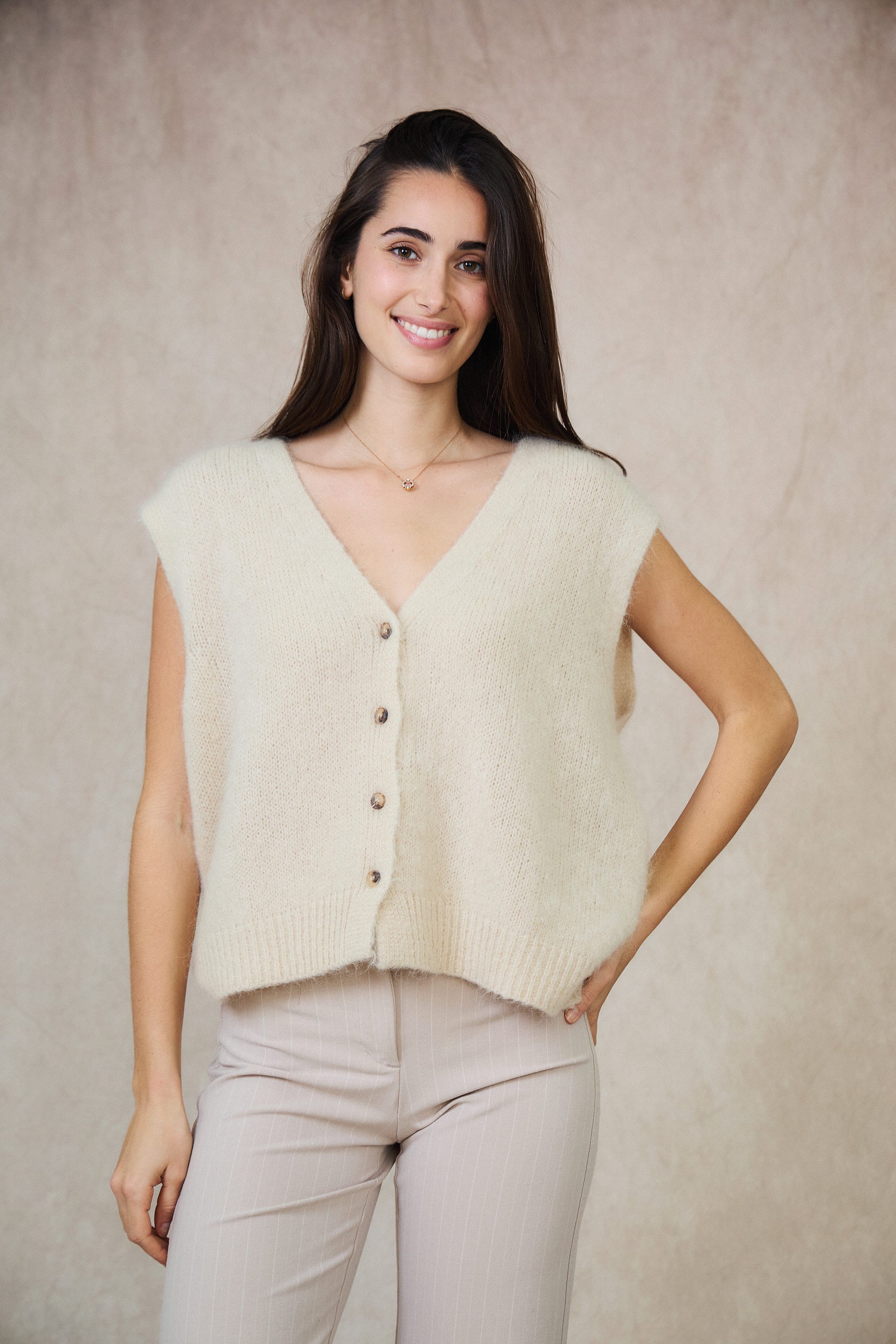 Disponible en taille unique (convient du 36 au 42 environ), ce gilet est proposé en plusieurs coloris pour s’adapter à tous les styles. Ses boutons discrets et sa maille moelleuse en font un vêtement à la fois cosy et chic, idéal à superposer sur une chemise ou un tee-shirt.