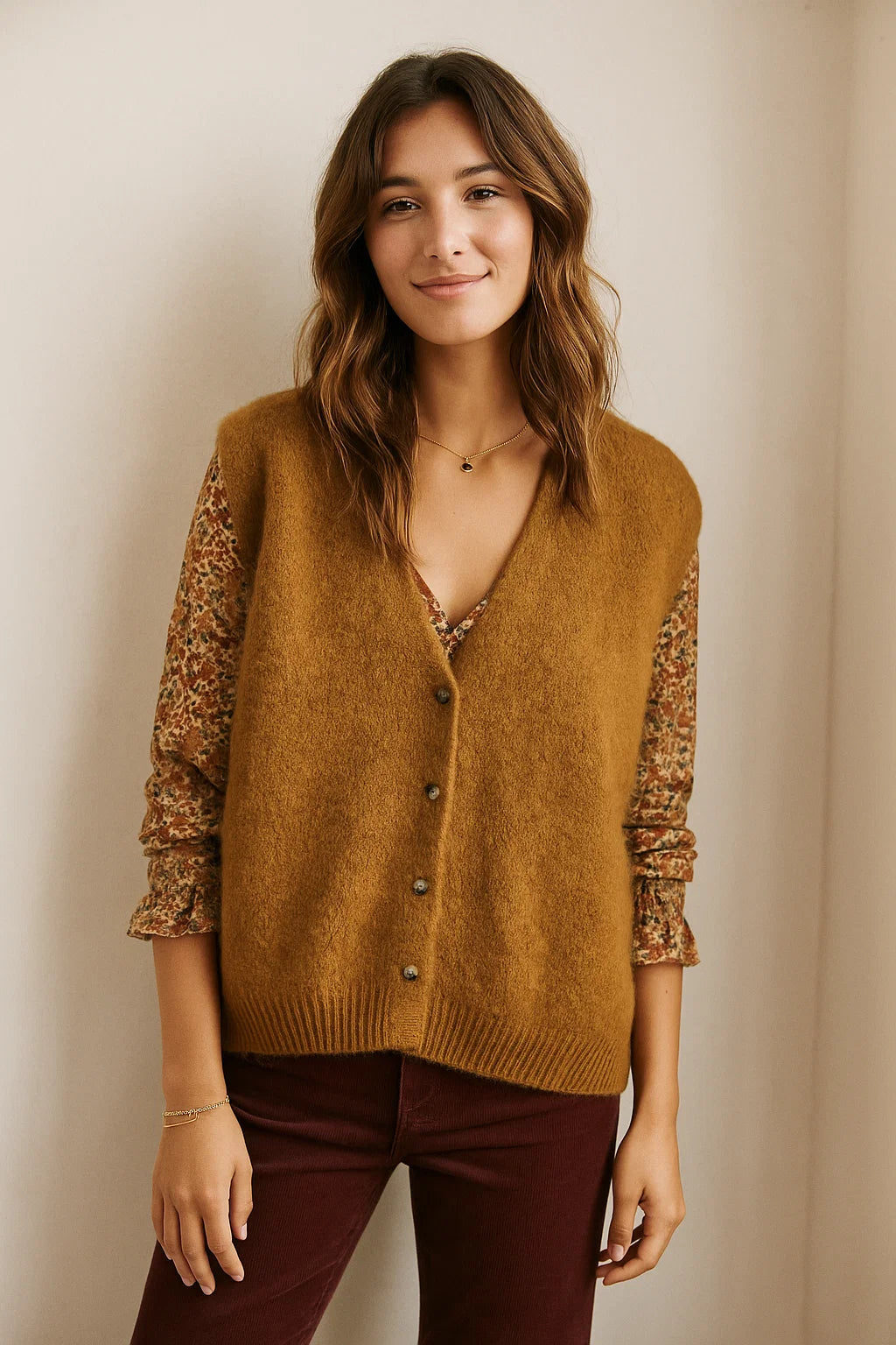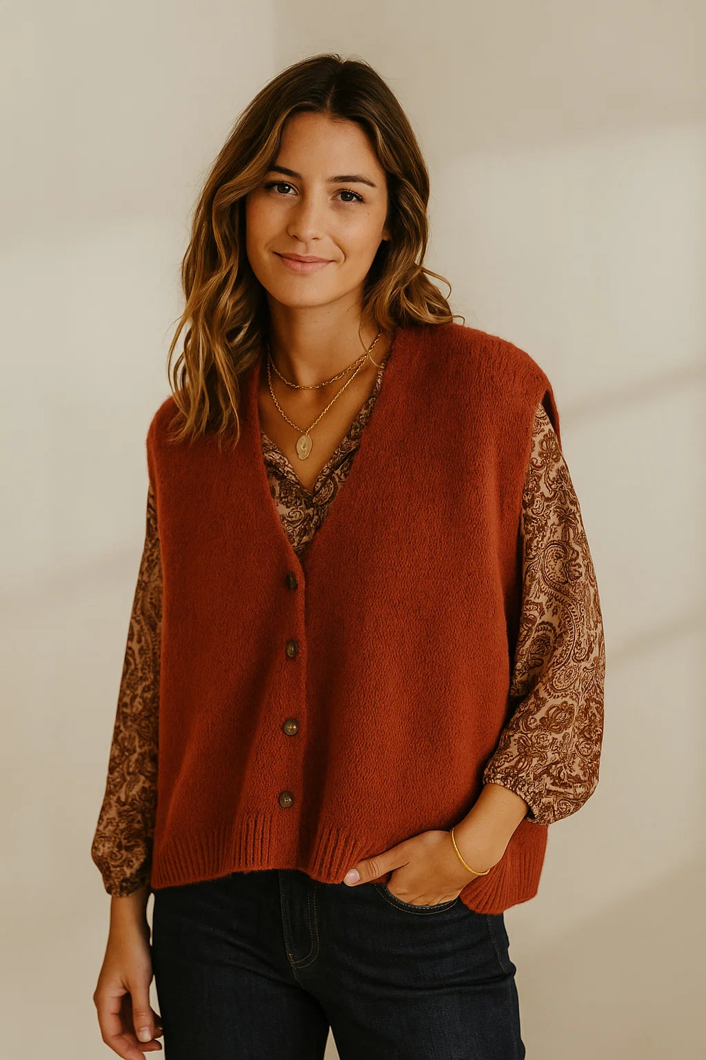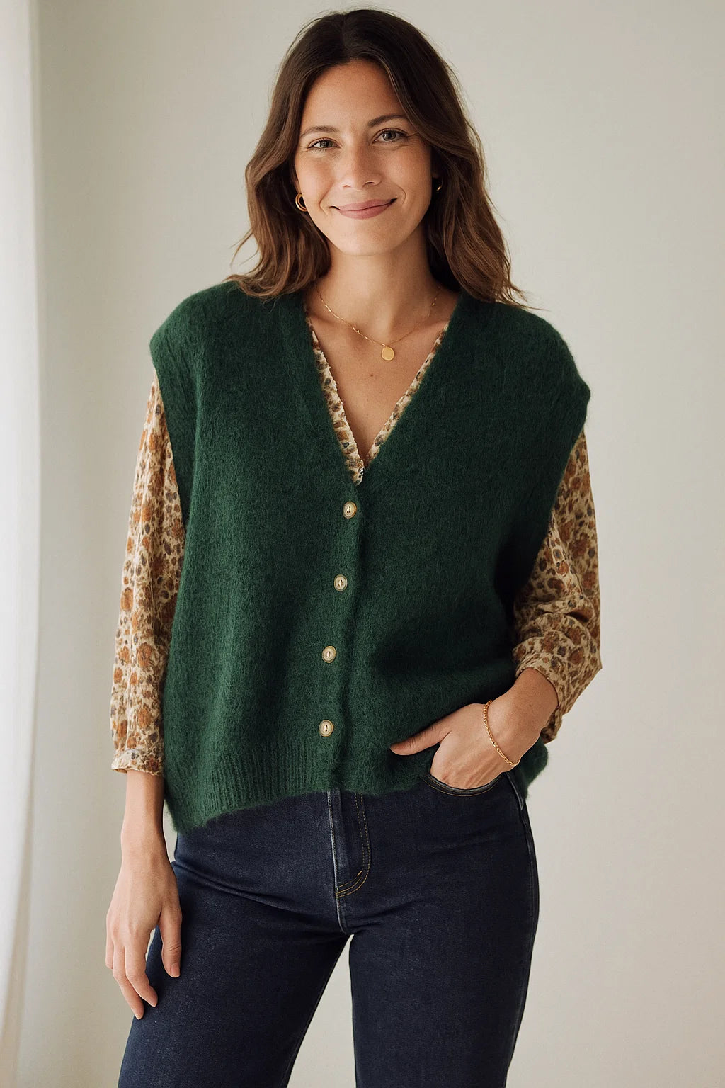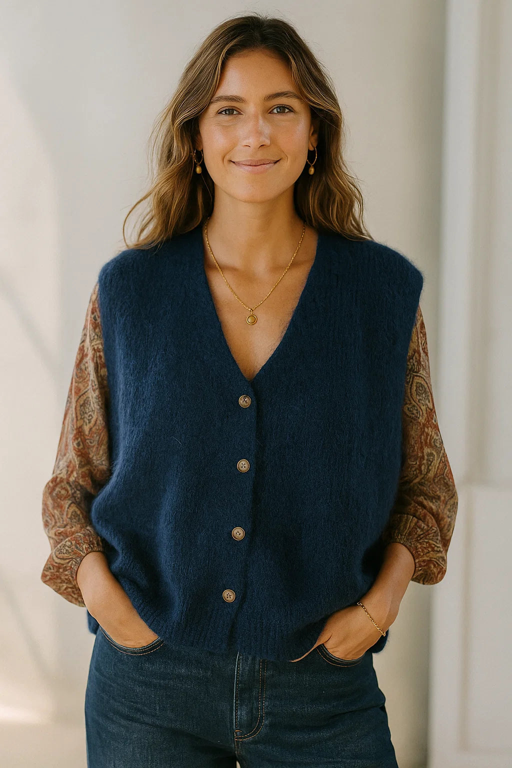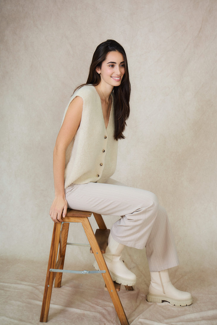Ce gilet se porte aussi bien avec un jean brut de notre collection pantalons pour un look casual, qu’avec une robe fluide de notre sélection robes pour une allure plus romantique.