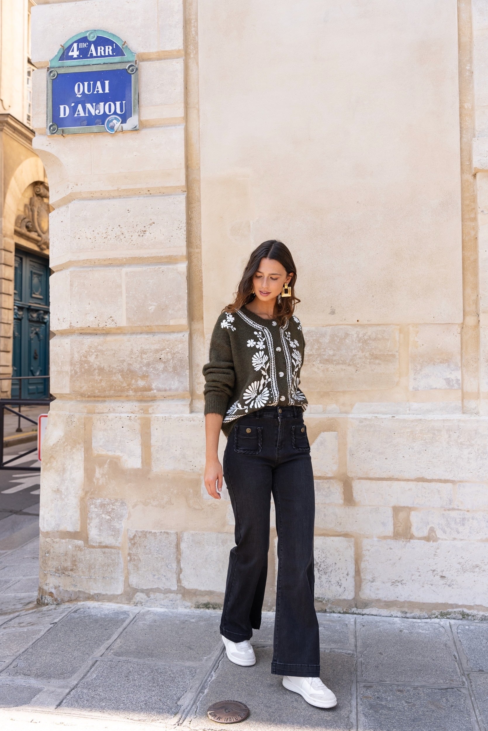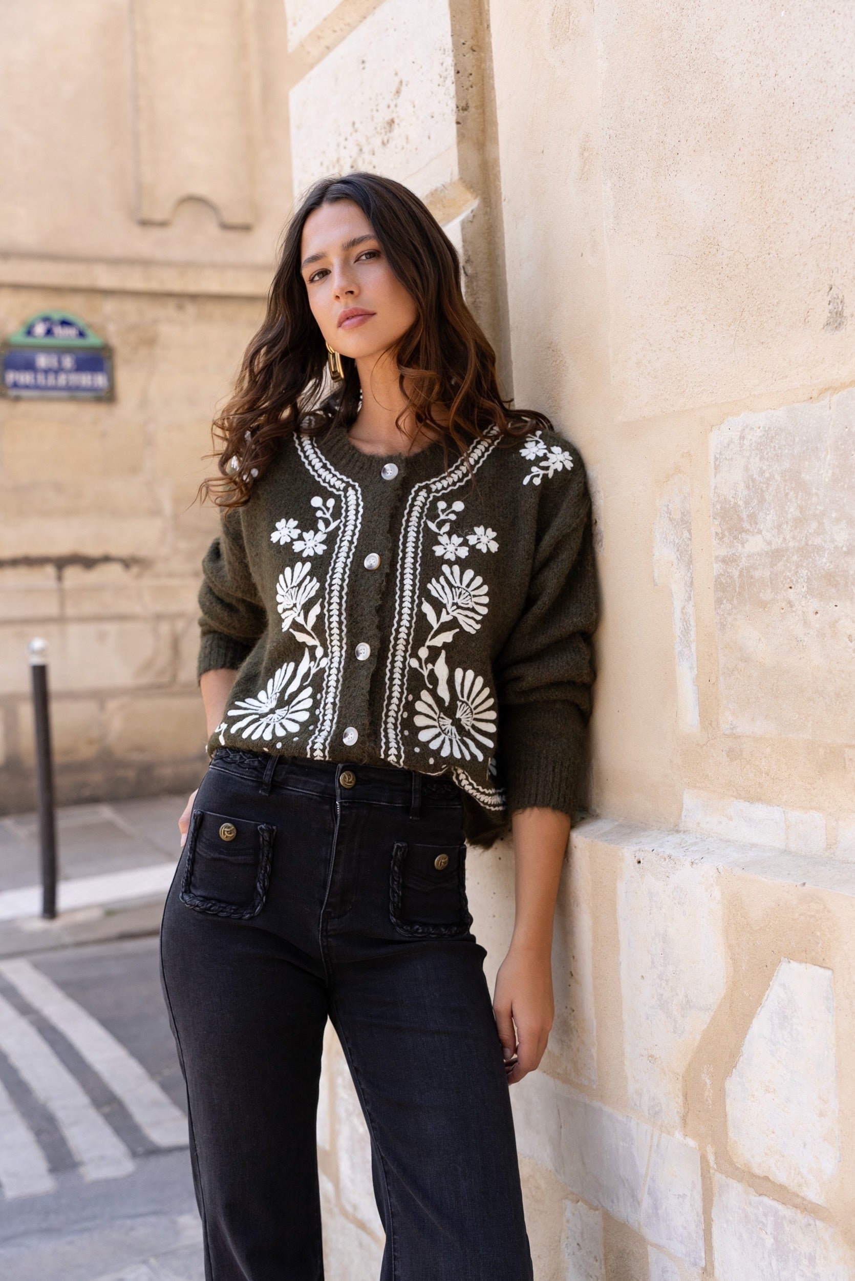 Avec son coloris vert forêt profond et ses broderies florales ivoire, ce gilet offre une allure unique et pleine de caractère. Le boutonnage sur le devant et la coupe légèrement ample en font une pièce facile à porter, au quotidien comme en sortie.