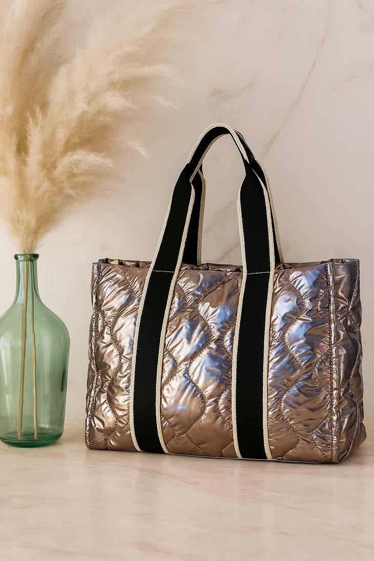 Ce sac cabas matelassé métallisé est une pièce forte qui conjugue look sportswear chic et fonctionnalité. Avec son effet doudoune brillant, son toucher moelleux et ses anses contrastées noires et beiges, il revisite le cabas classique dans une version plus moderne, urbaine et assumée.