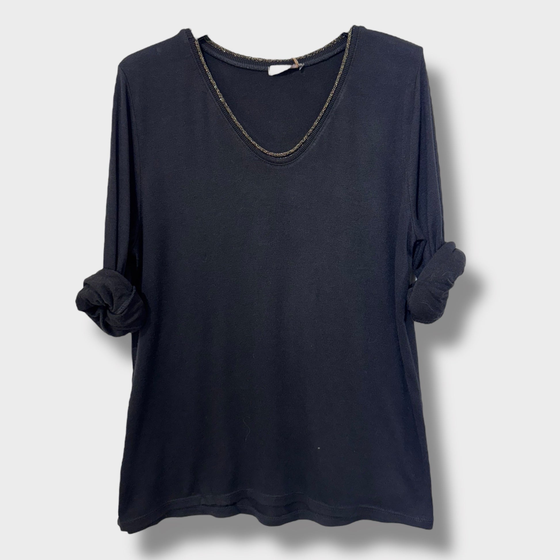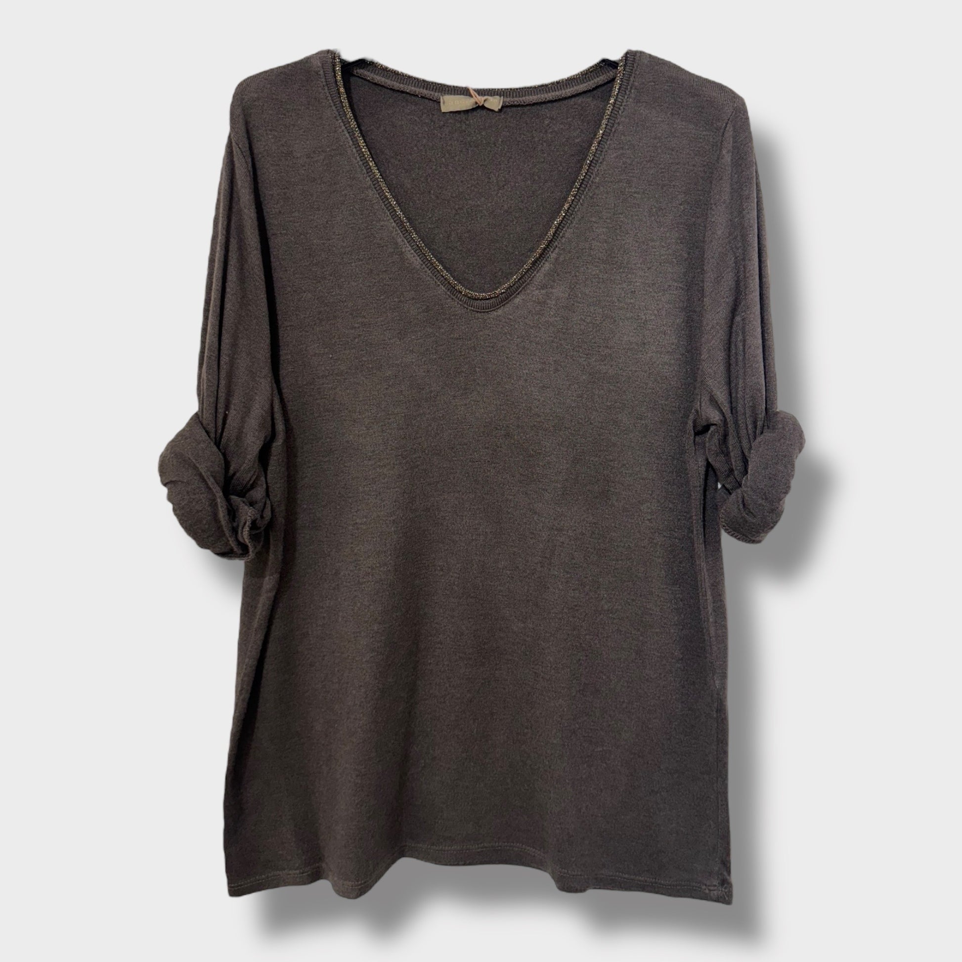 Avec son col V délicatement souligné, ce haut met en valeur la silhouette tout en gardant une allure sobre et élégante. Ses manches longues et sa coupe légèrement ample en font une pièce confortable, facile à porter en toute saison.