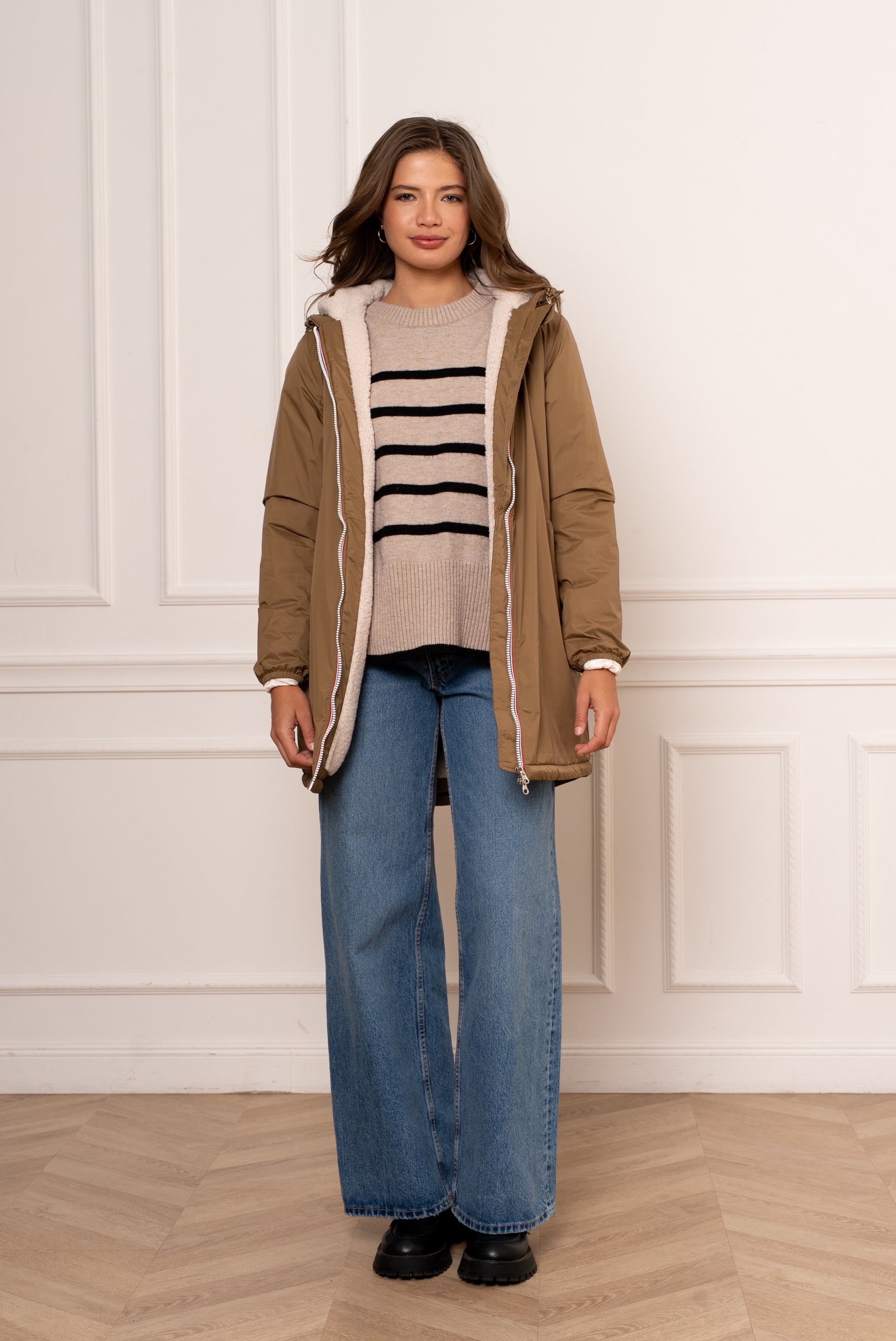Sa coupe droite légèrement ample permet de le superposer facilement sur un pull ou un gilet. L’intérieur entièrement fourré en Sherpa offre une chaleur enveloppante, tandis que la capuche et les poches zippées assurent une protection optimale contre le vent et la pluie.