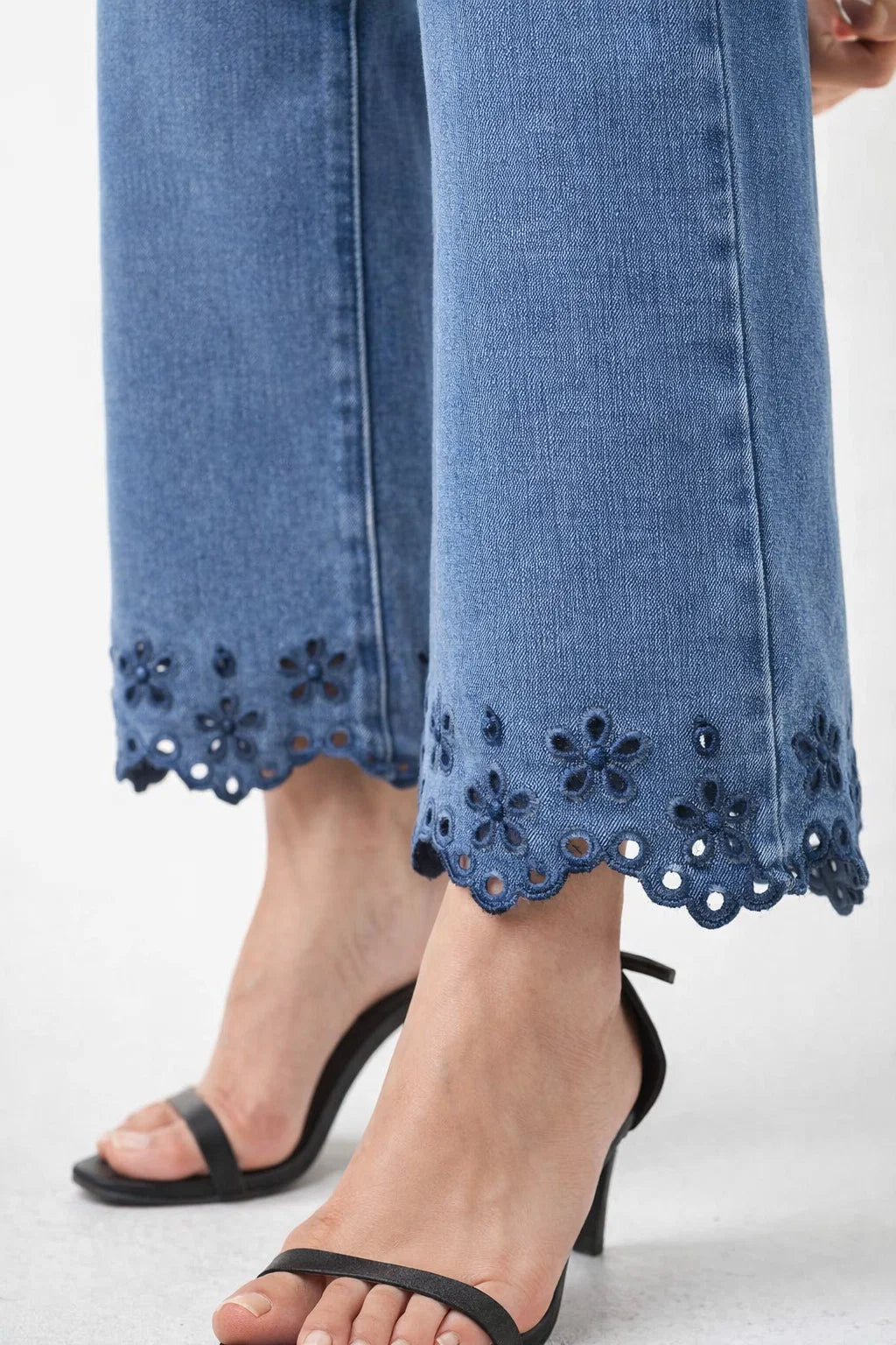 Sa coupe large allonge la silhouette et apporte une allure moderne et structurée. La taille haute souligne délicatement la taille pour mettre en valeur vos formes sans comprimer. Son véritable atout : le bas de jambe délicatement festonné et orné de détails ajourés façon broderie, qui apporte une touche bohème subtile et élégante.
