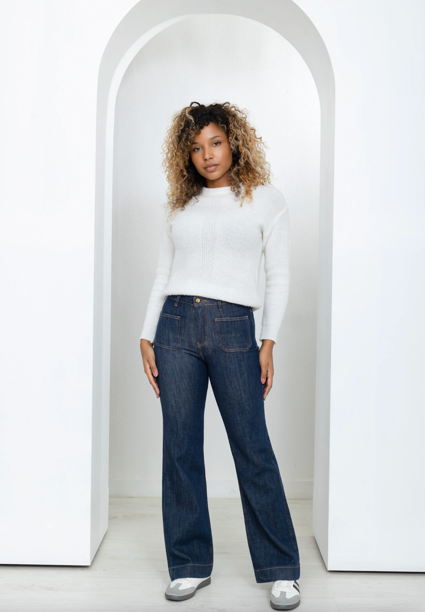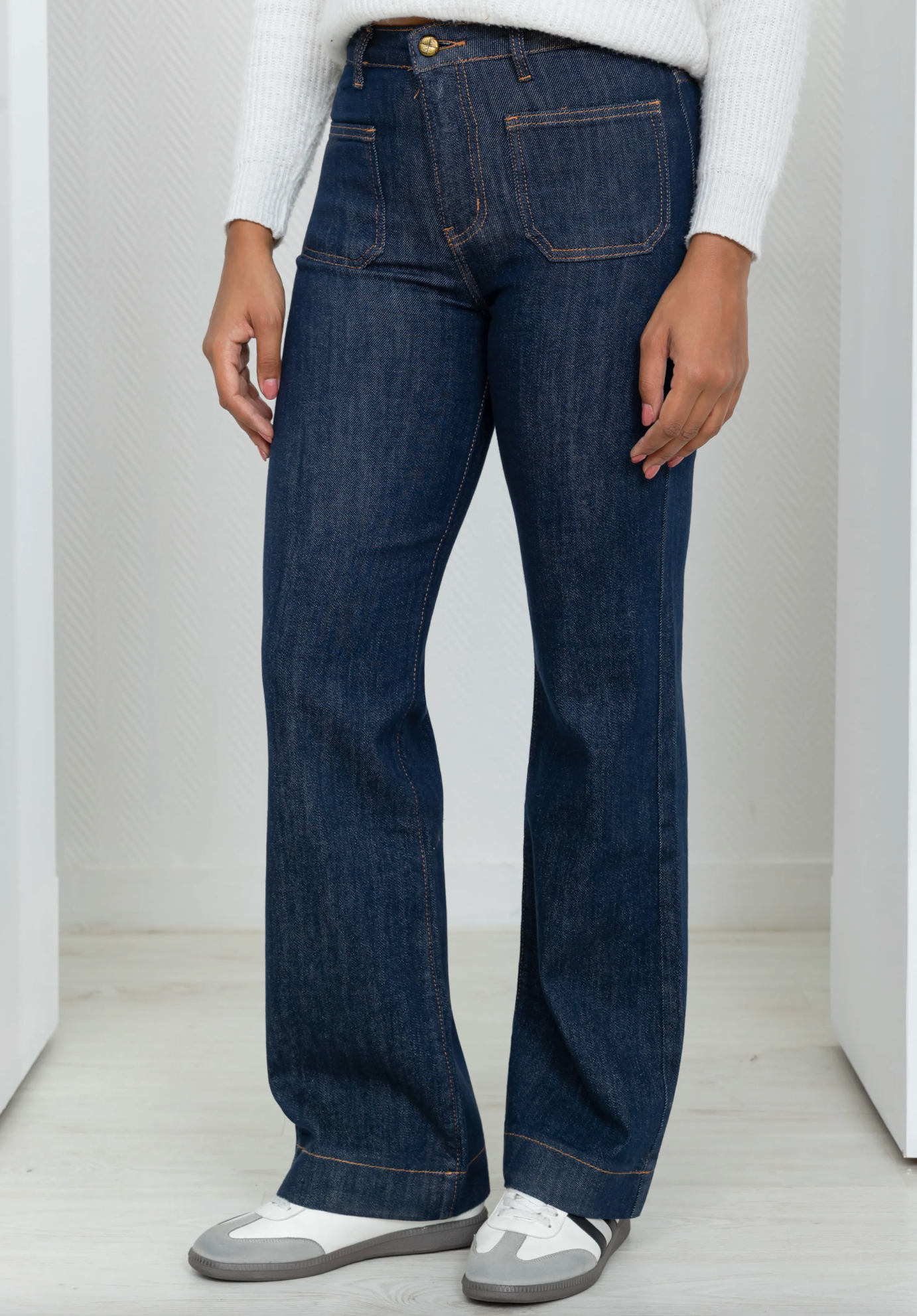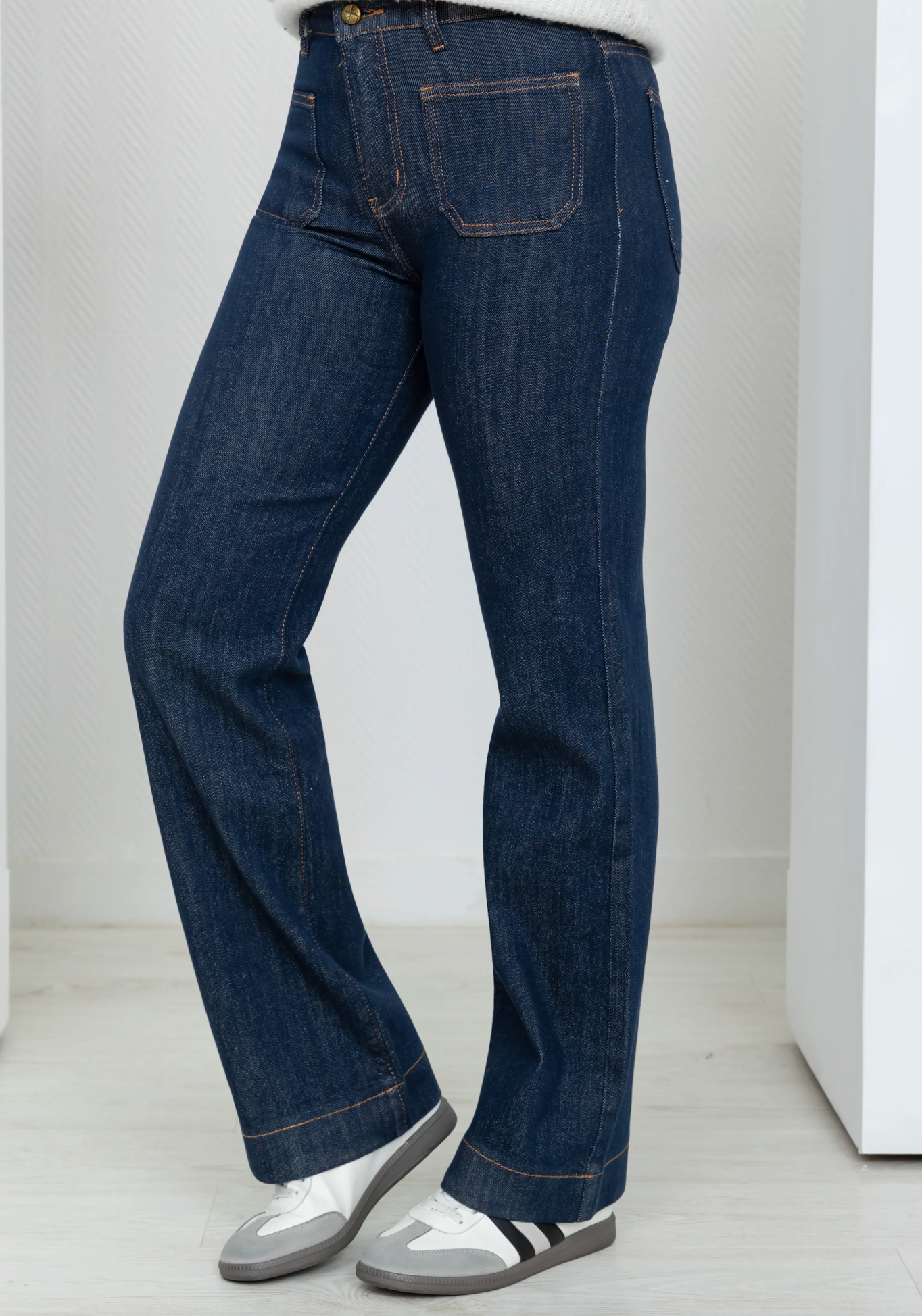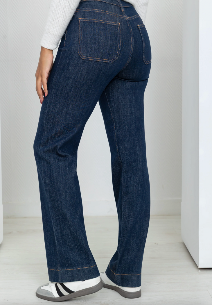 Sa taille haute et ses poches plaquées sur l’avant assurent un tombé impeccable et un confort absolu. Polyvalent et indémodable, ce jean se porte aussi bien avec des baskets pour un look casual chic qu’avec des bottines à talons pour une allure plus habillée. Le bleu brut profond se marie à merveille avec toutes les teintes de saison — du beige au bordeaux en passant par le blanc cassé.