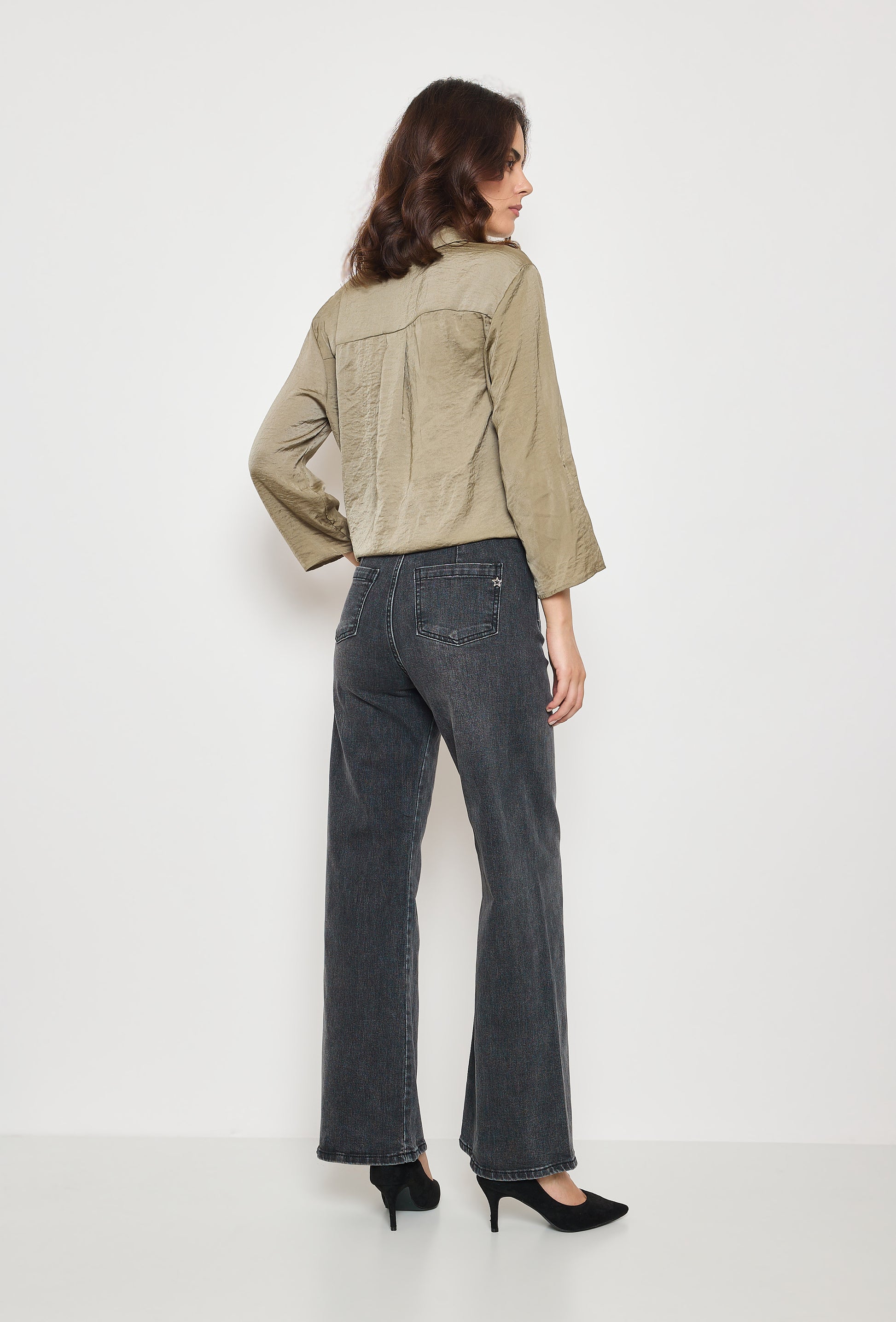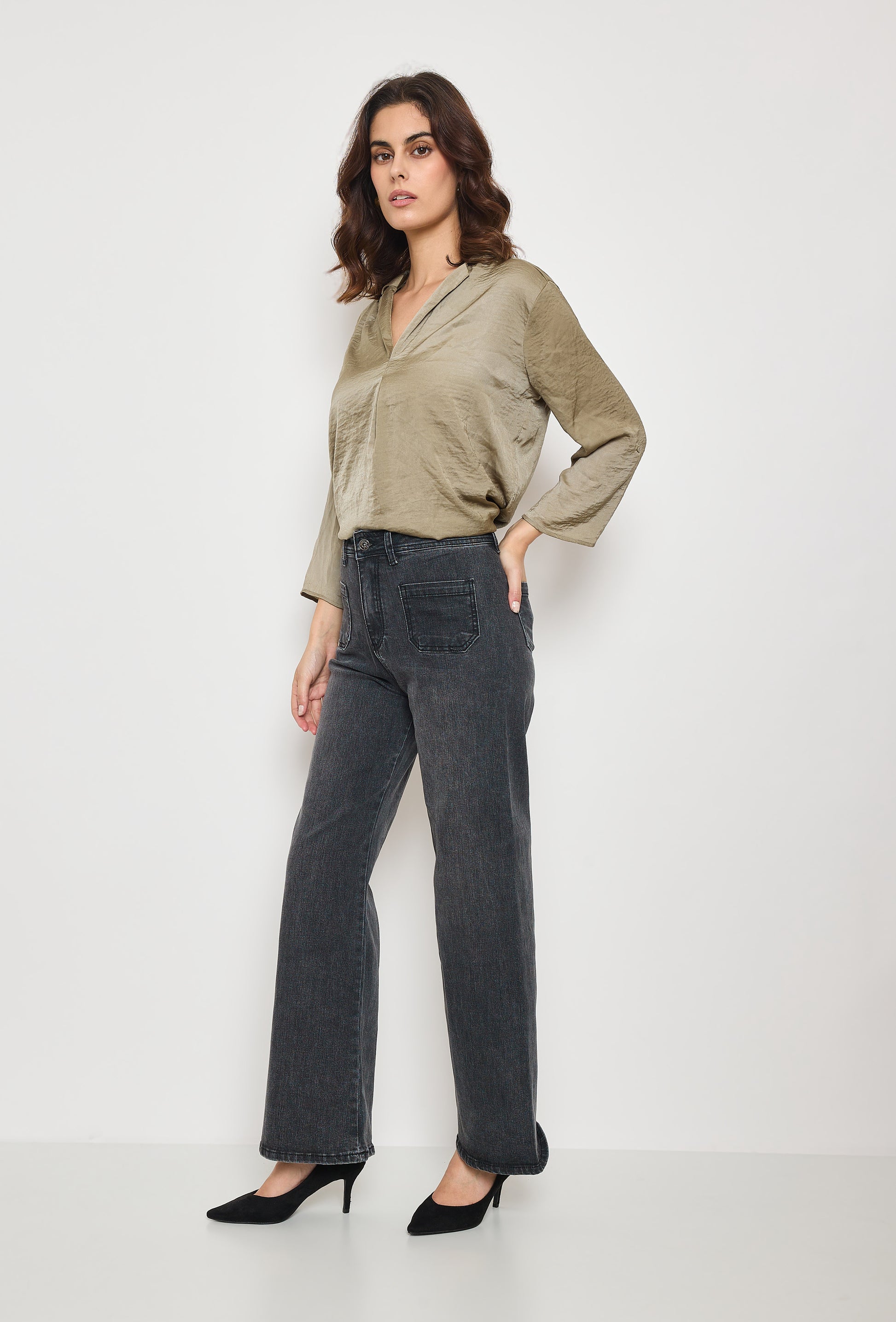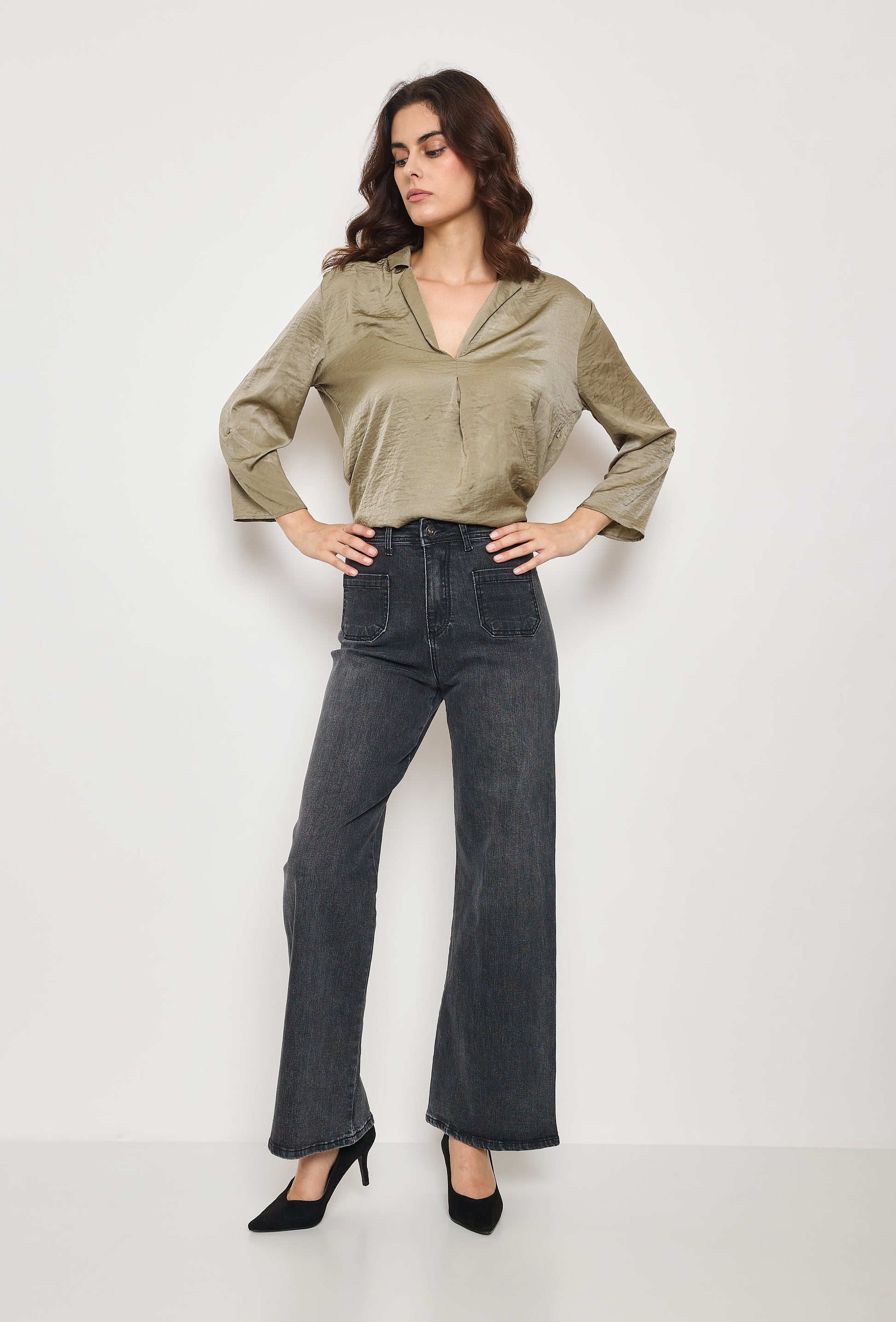 Avec ses poches plaquées à l’avant et sa coupe légèrement évasée en bas, ce jean associe modernité et inspiration rétro. Porté avec une chemise élégante ou un pull ample, il s’adapte aussi bien aux journées de travail qu’aux sorties décontractées. Sa taille haute souligne la silhouette et met en valeur la féminité.