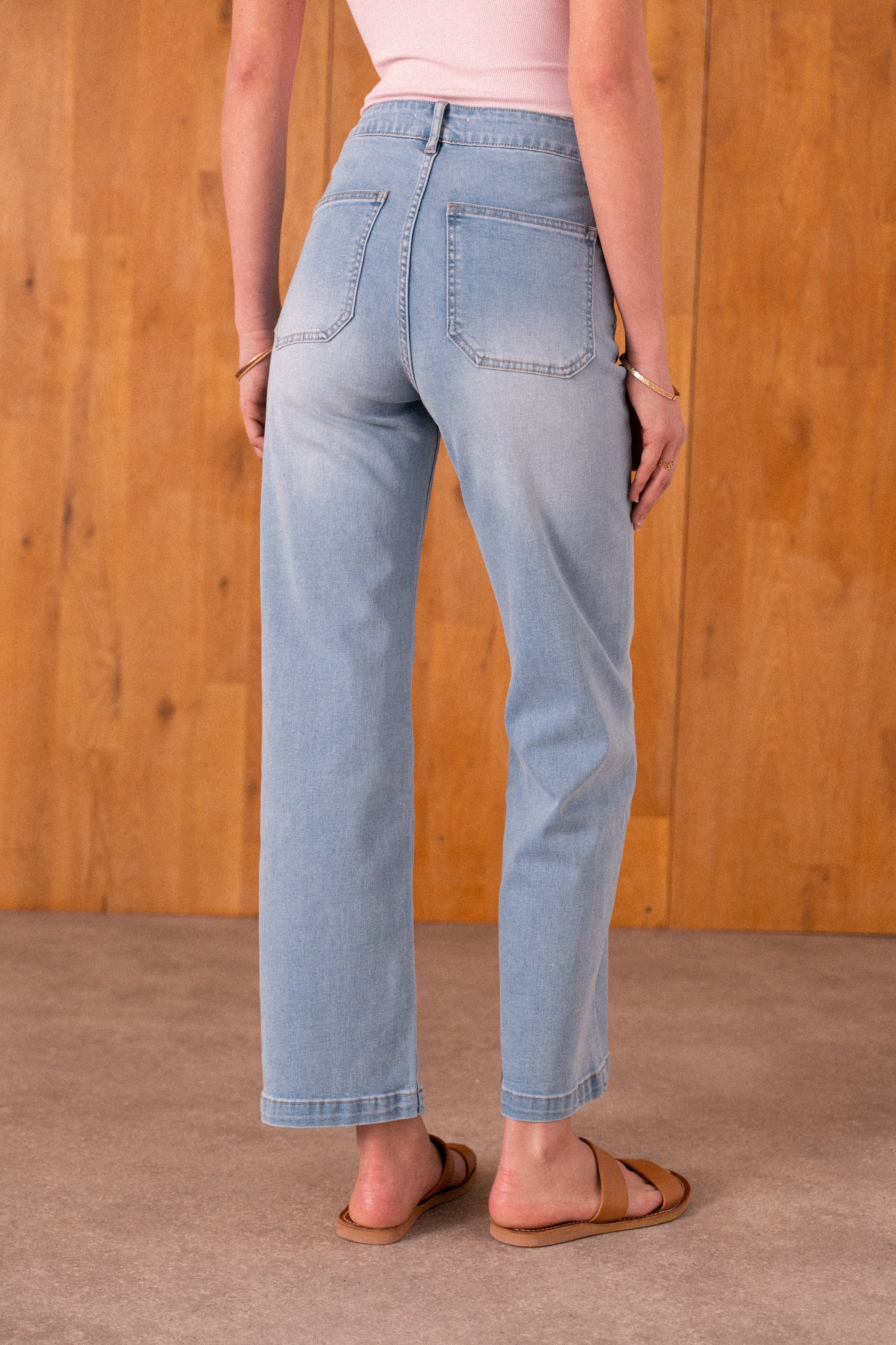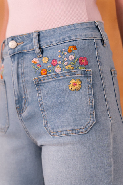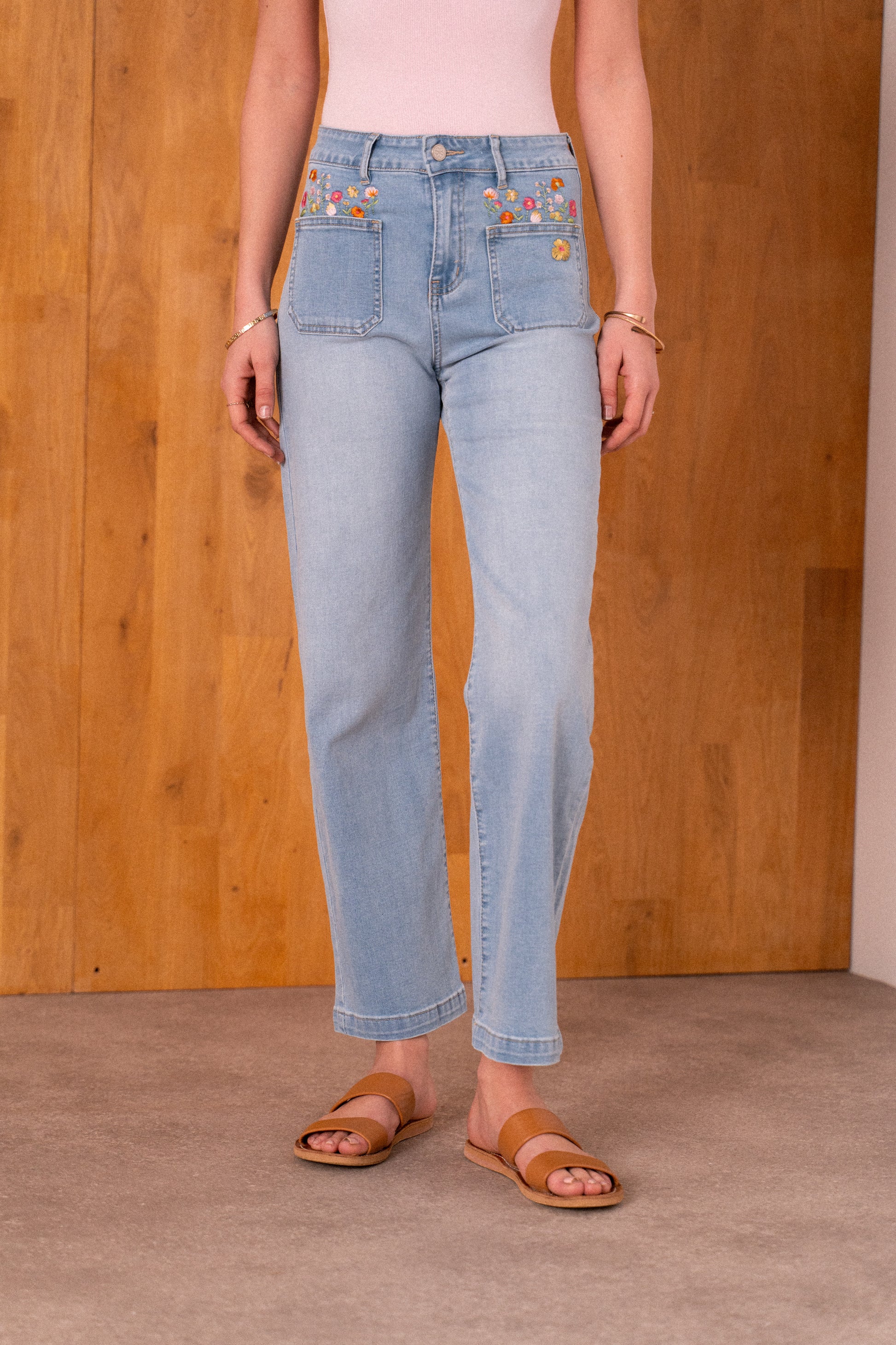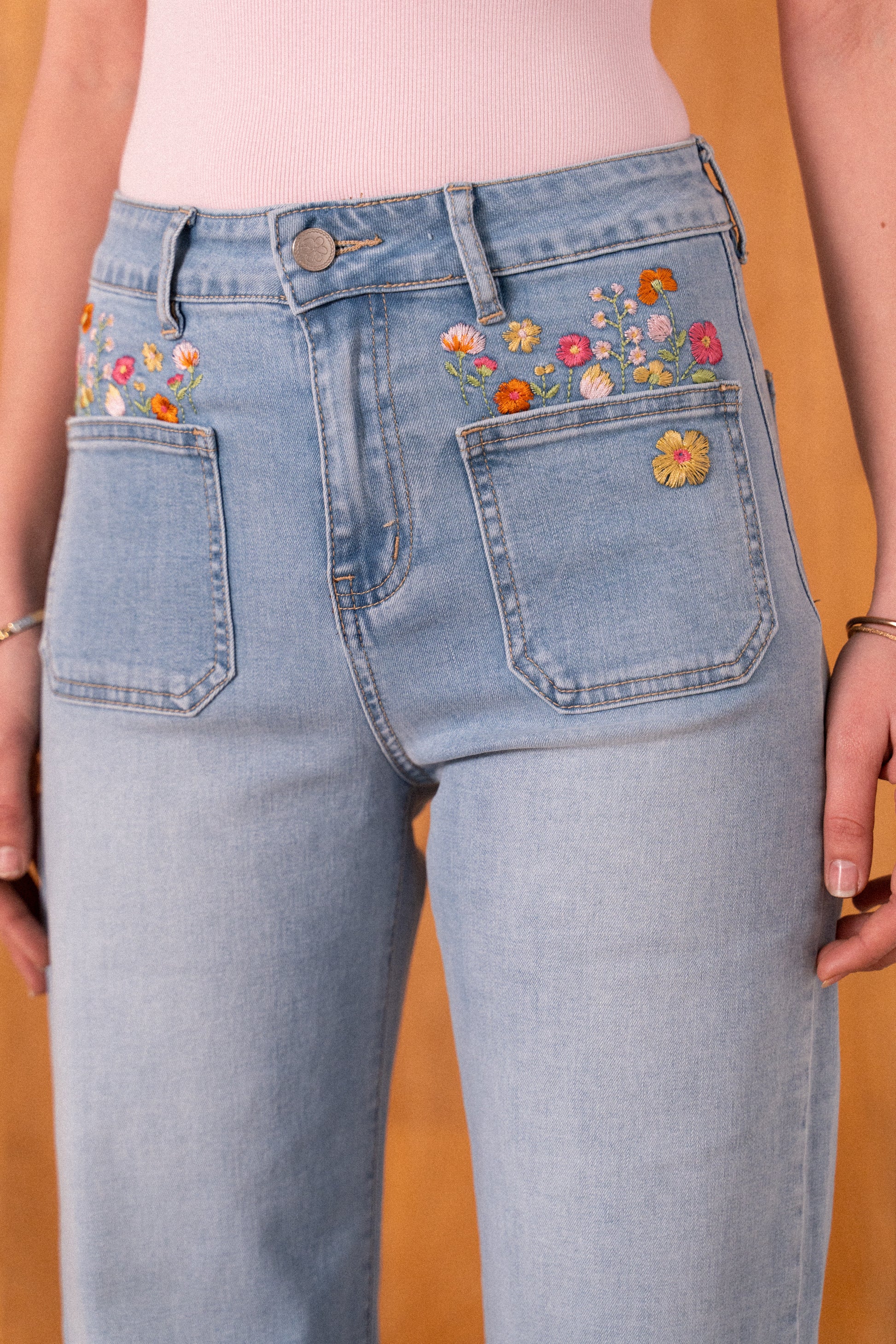 Ce jean brodé fleurs est la pièce idéale pour apporter une touche de fraîcheur et d’originalité à vos tenues. Son denim clair lumineux est délicatement décoré de broderies florales colorées sur les poches, qui lui donnent un charme bohème et féminin.