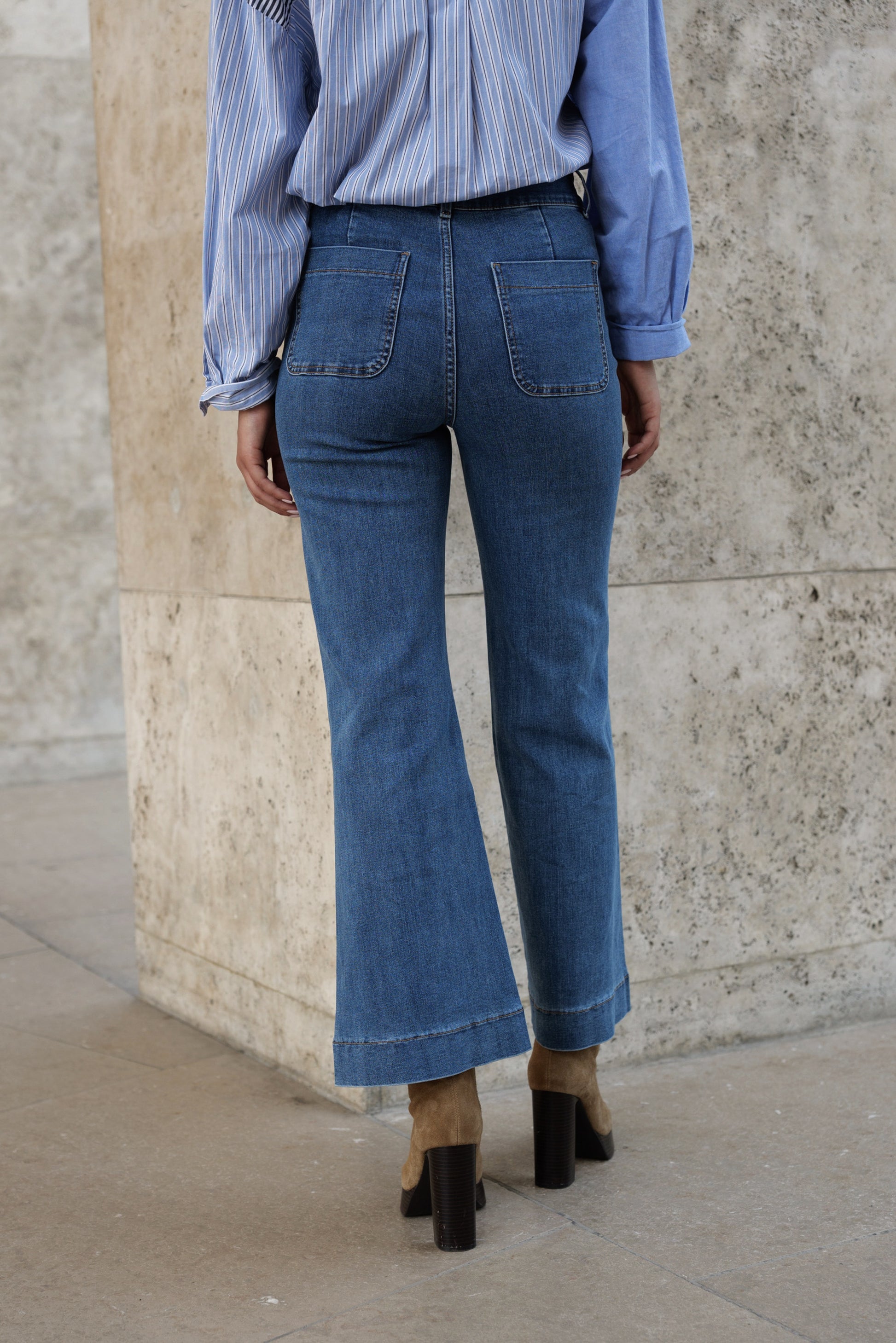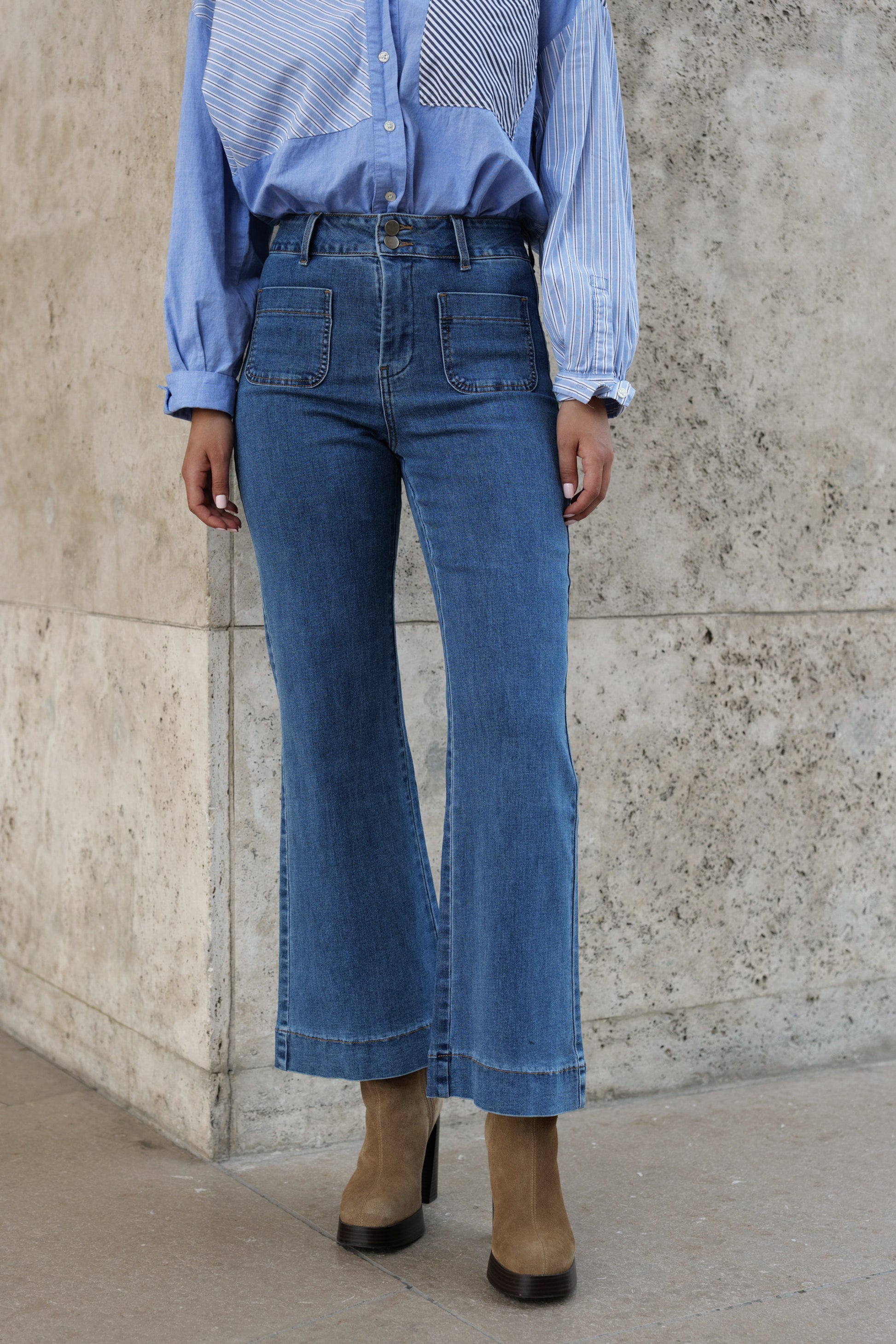 Ce jean femme taille haute est une pièce essentielle pour composer des tenues à la fois modernes et faciles à porter. Sa coupe droite légèrement évasée en bas structure la silhouette sans la contraindre, tout en apportant une allure élégante et actuelle.
