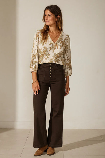 Chères clientes, ce jean wide leg est la pièce parfaite pour moderniser votre dressing tout en gardant un confort absolu. Avec sa coupe large et sa taille haute, il allonge naturellement la silhouette et met en valeur la taille. Sa couleur chocolat, très tendance cette saison, apporte une touche chaleureuse et élégante à vos tenues du quotidien.