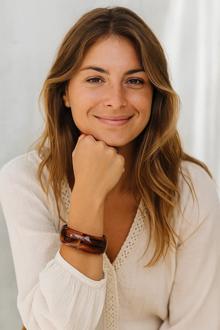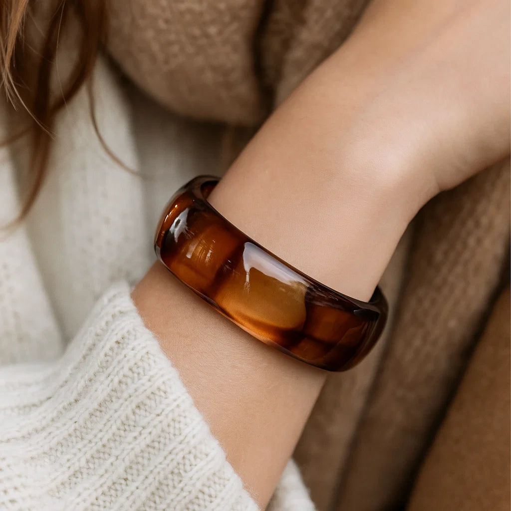 Sa forme large et arrondie offre une belle présence au poignet sans devenir lourde ou envahissante. La résine, douce et agréable au toucher, reflète joliment la lumière et met en valeur votre bronzage comme vos looks d’hiver. C’est un accessoire simple, efficace et résolument tendance, pensé pour accompagner votre dressing bohème, chic ou plus urbain.
