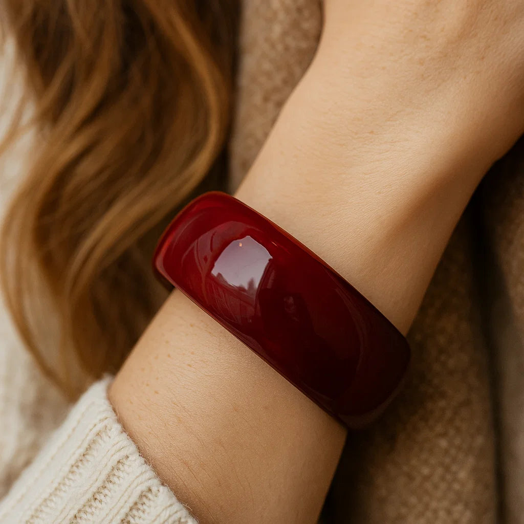 Ce bracelet jonc en résine est la pièce parfaite si vous aimez apporter une touche de couleur et de caractère à votre tenue. Léger, confortable et très féminin, il se porte facilement au quotidien et donne instantanément du style, que vous choisissiez la version rouge profonde ou l’ambre délicatement nuancé.