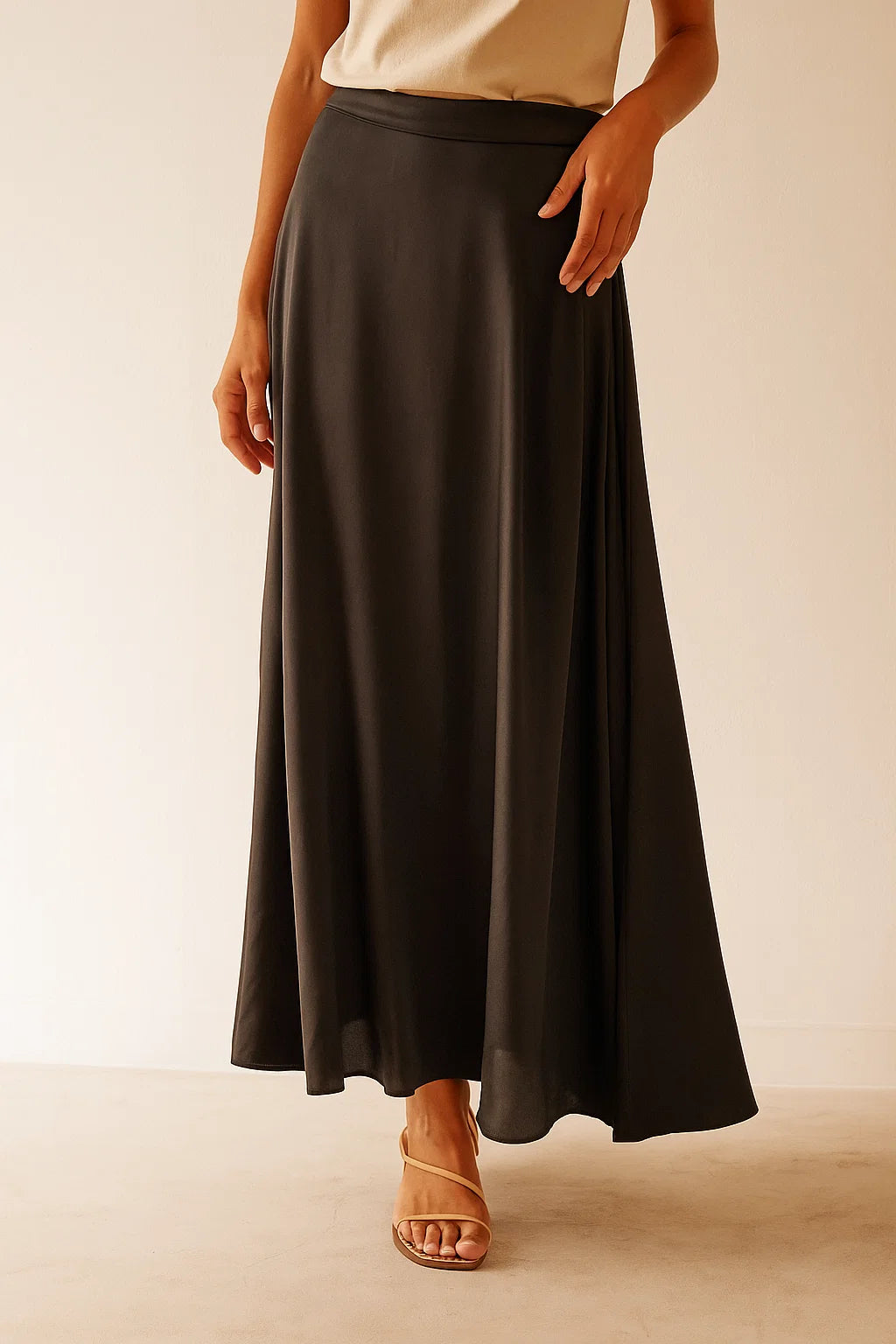 Dotée d’une ceinture élastiquée au dos et de poches discrètes, cette jupe allie praticité et élégance. Sa texture soyeuse et satinée capte la lumière, tandis que sa coupe ample met en valeur la silhouette sans la contraindre.