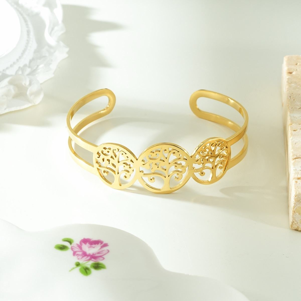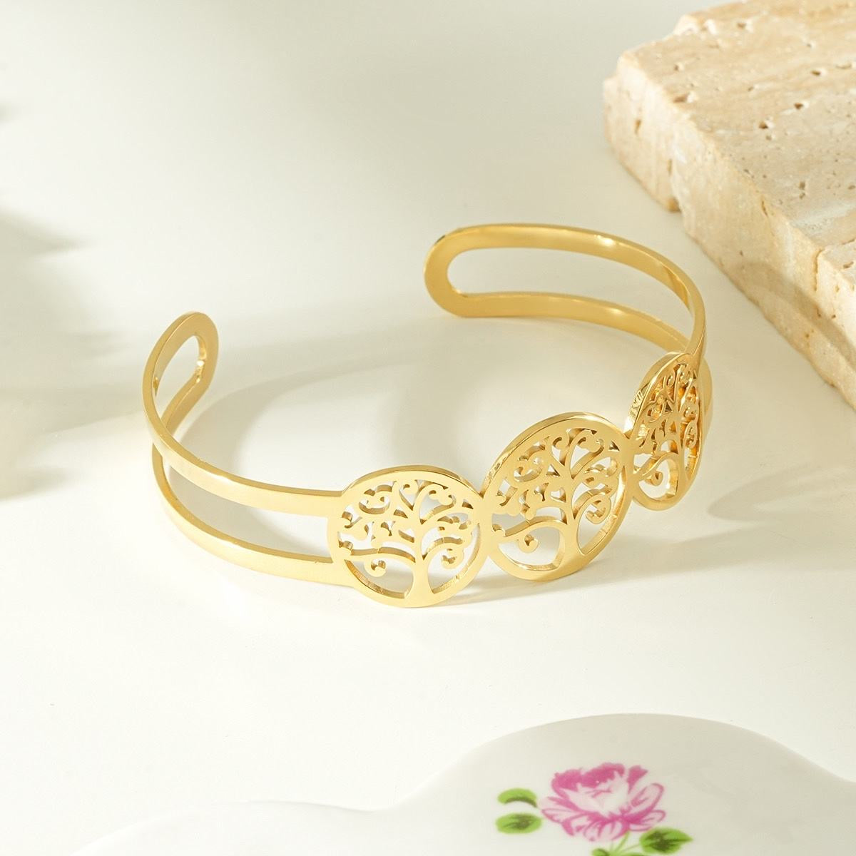 Chères clientes, ce bracelet manchette doré est une pièce raffinée et féminine qui apporte instantanément une touche sophistiquée à vos tenues. Sa découpe ajourée forme de délicates arabesques arrondies, créant un effet visuel travaillé tout en restant léger et confortable au poignet.