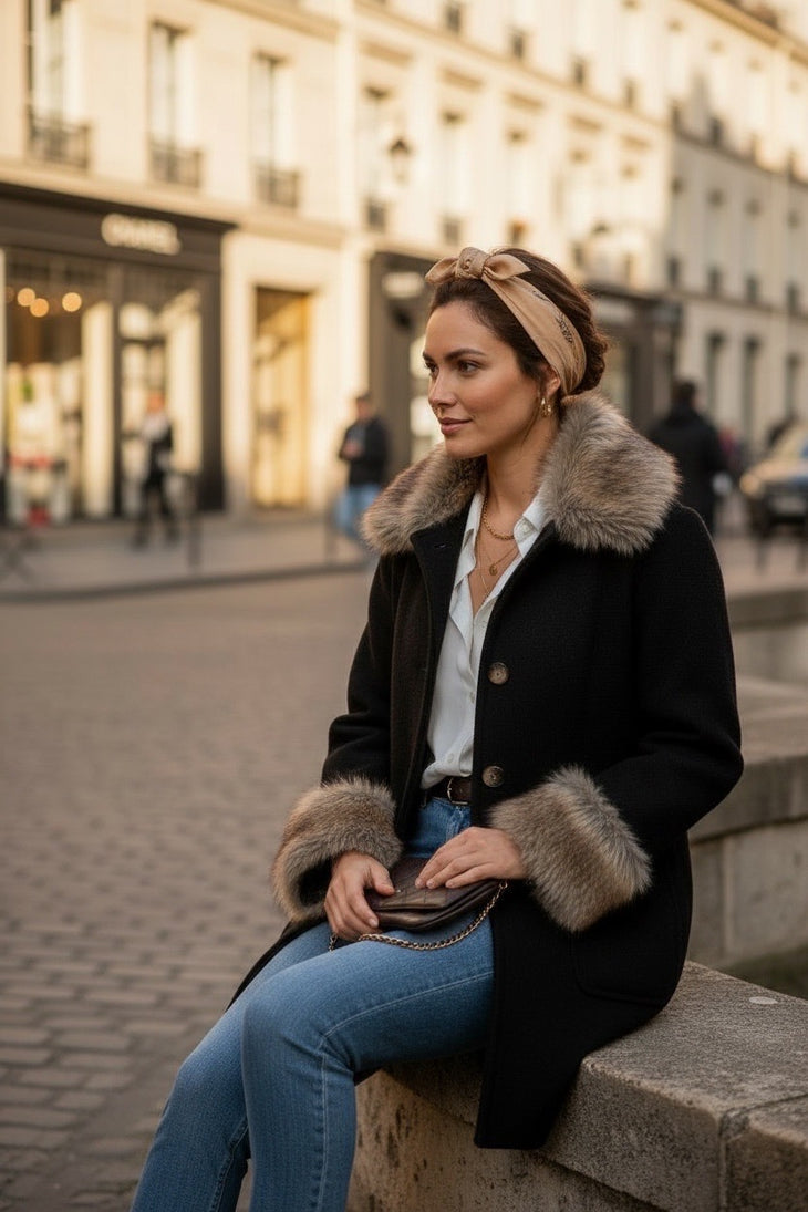 Sa coupe droite et structurée convient à toutes les morphologies (taille unique du 36 au 42) et met en valeur la silhouette sans contrainte. Doté de boutons dorés, de poches plaquées et d’une doublure satinée, ce manteau allie confort, style et praticité. Sa teinte brun-chocolat, réchauffée par les finitions fourrure, en fait une pièce maîtresse du dressing automne-hiver.