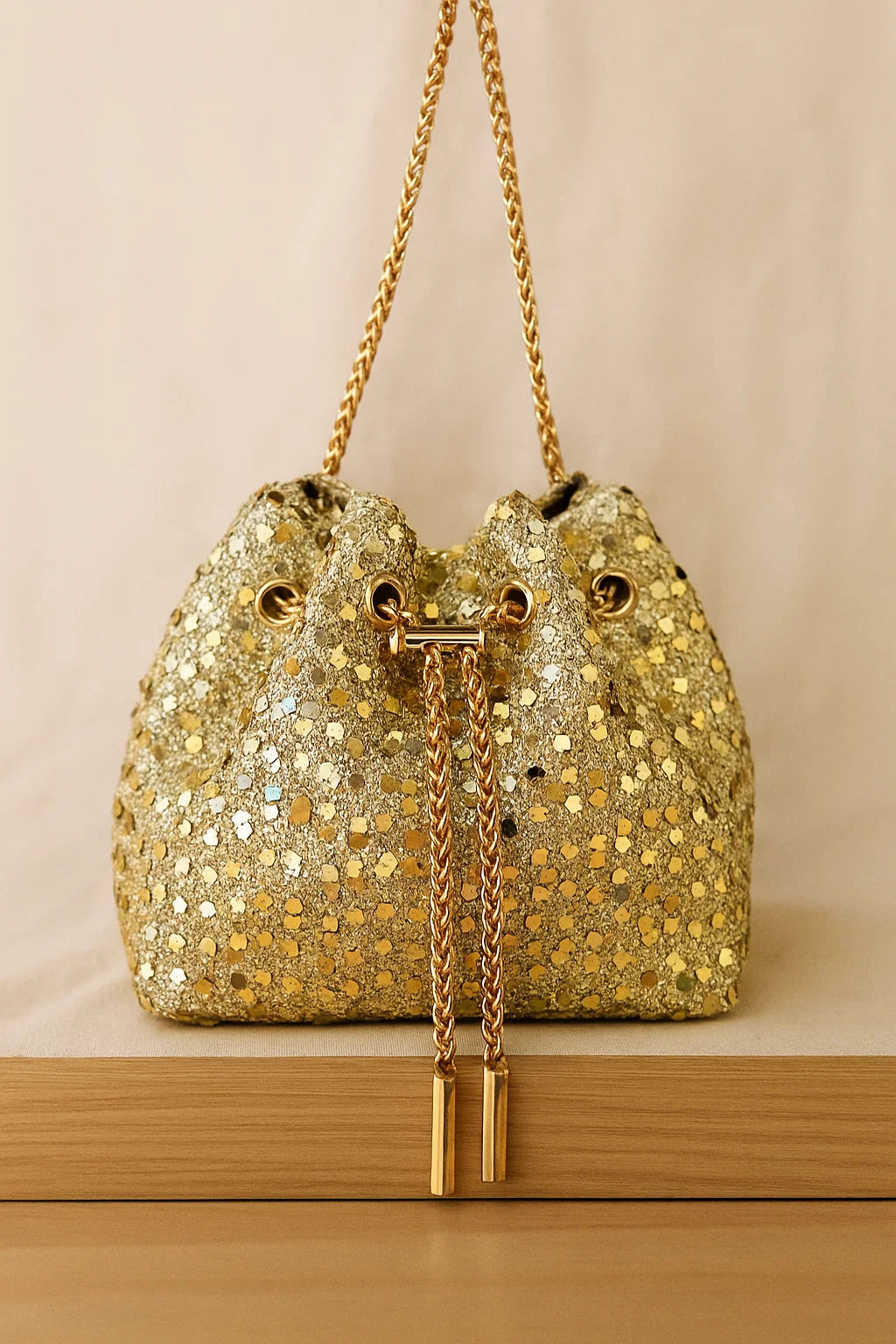 Le format est idéal pour accueillir l’essentiel : téléphone, petite trousse, clés et portefeuille. Léger, pratique et agréable à porter, il se resserre par un cordon métallique élégant qui assure une belle tenue du sac. C’est l’accessoire parfait pour vos soirées, fêtes de famille, réveillons… mais aussi pour booster une tenue simple avec un éclat subtil.