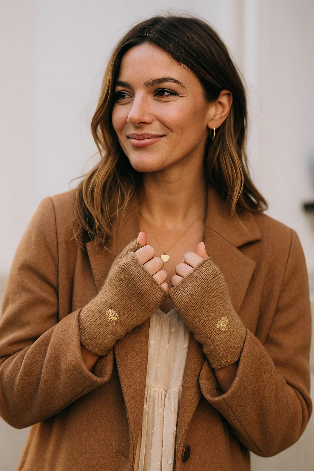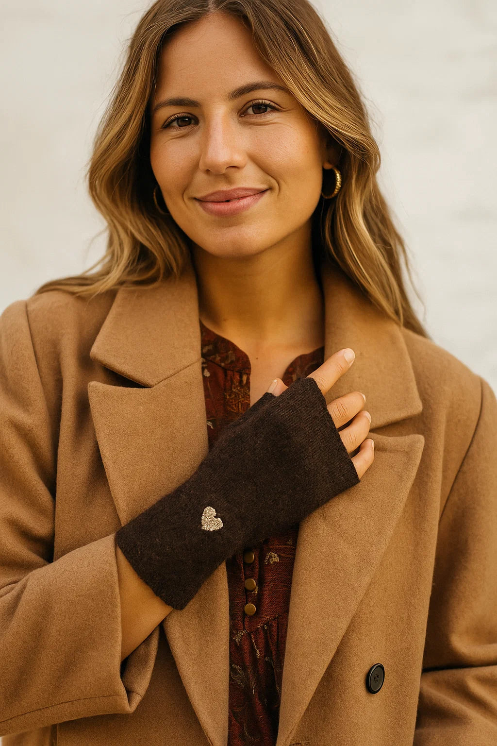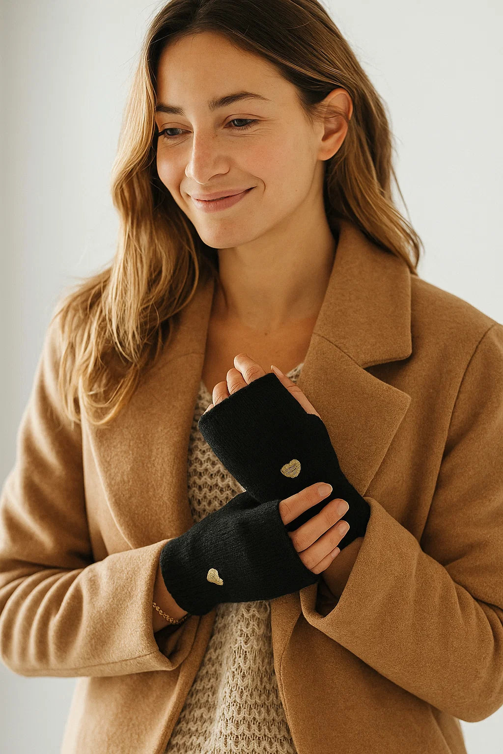 Chère cliente, si vous aimez garder les mains au chaud tout en continuant à utiliser votre téléphone ou à travailler facilement, ces mitaines vont devenir votre meilleur allié de l’hiver. Leur matière douce et moelleuse, agrémentée d’un petit cœur doré brodé, en fait une pièce à la fois pratique, chic et ultra féminine.