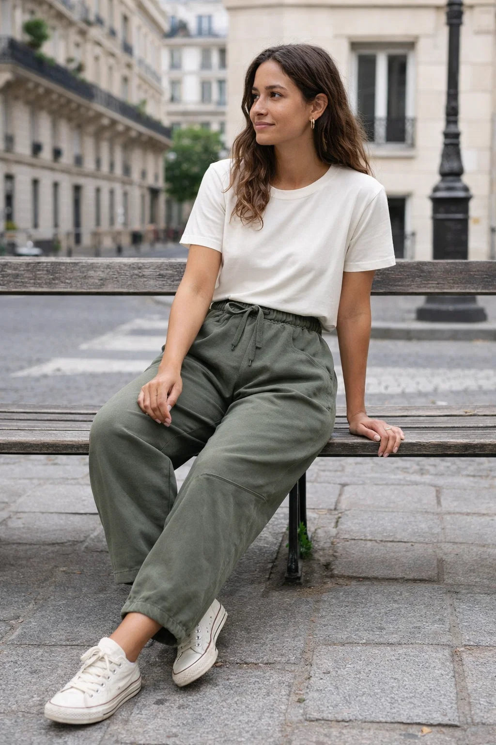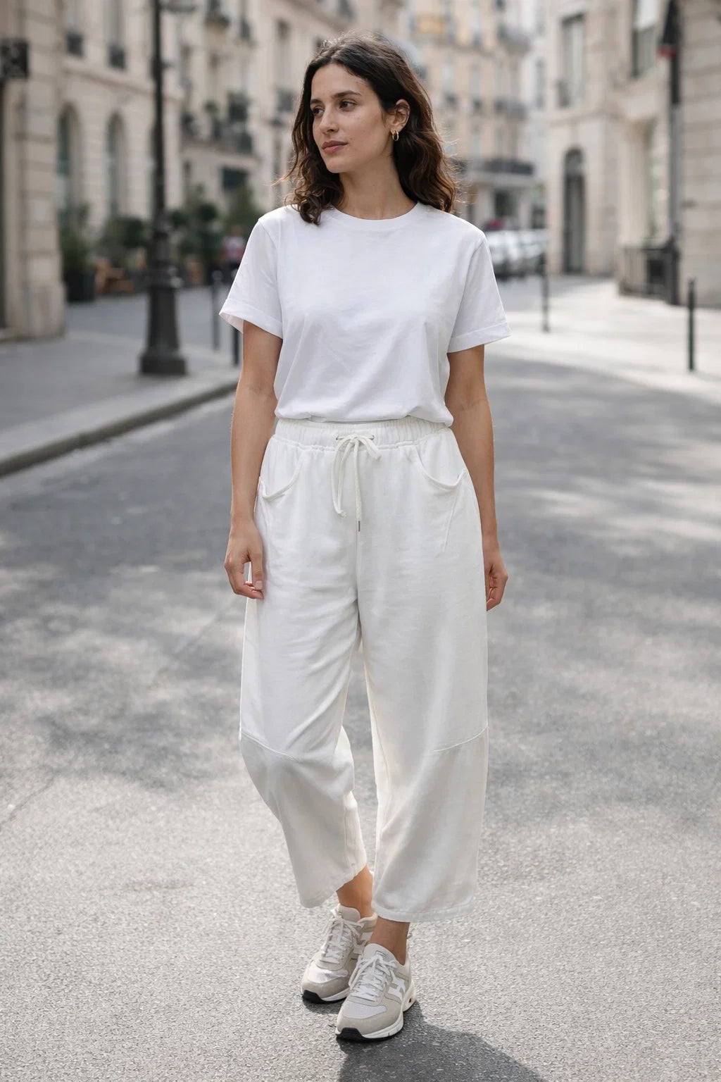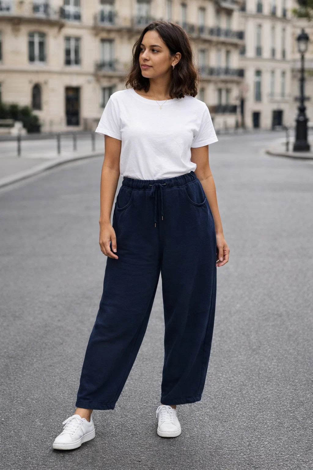 Sa taille élastiquée avec lien de serrage assure un ajustement parfait du 36 au 42. Les poches latérales ajoutent une touche pratique, tandis que la coupe barrel donne ce petit twist mode qui fait toute la différence. Ni trop ample, ni trop ajusté, il sublime la silhouette avec naturel.