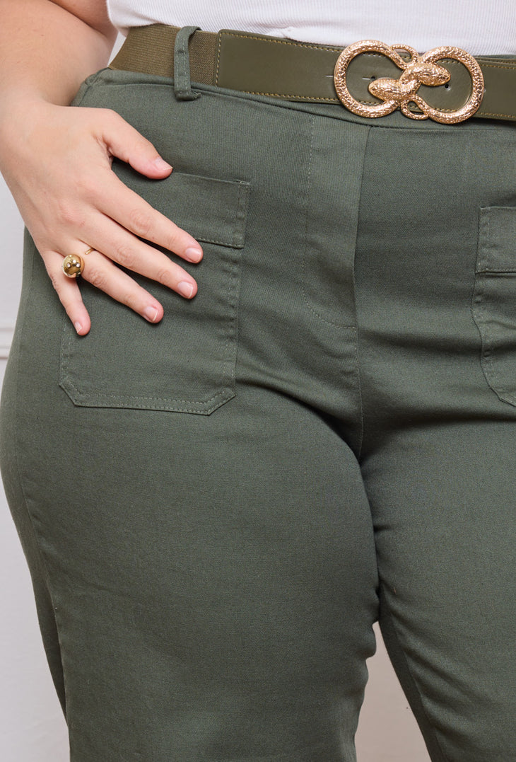 Ce pantalon kaki en coton stretch est un indispensable de la garde-robe féminine, pensé pour allier confort et style. Conçu en taille unique du 44 au 50, il s’adapte parfaitement aux morphologies généreuses grâce à sa composition de 95 % coton et 5 % élasthanne, garantissant souplesse et confort.