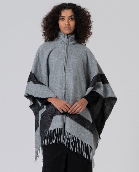 Ce poncho en acrylique Surkana est l’allié parfait pour affronter l’hiver avec style. Conçu dans une maille douce et chaude, il présente une coupe ample et un col montant zippé pour protéger efficacement du froid. Ses larges rayures contrastées et ses franges ajoutent une touche bohème chic qui se marie facilement à vos tenues.