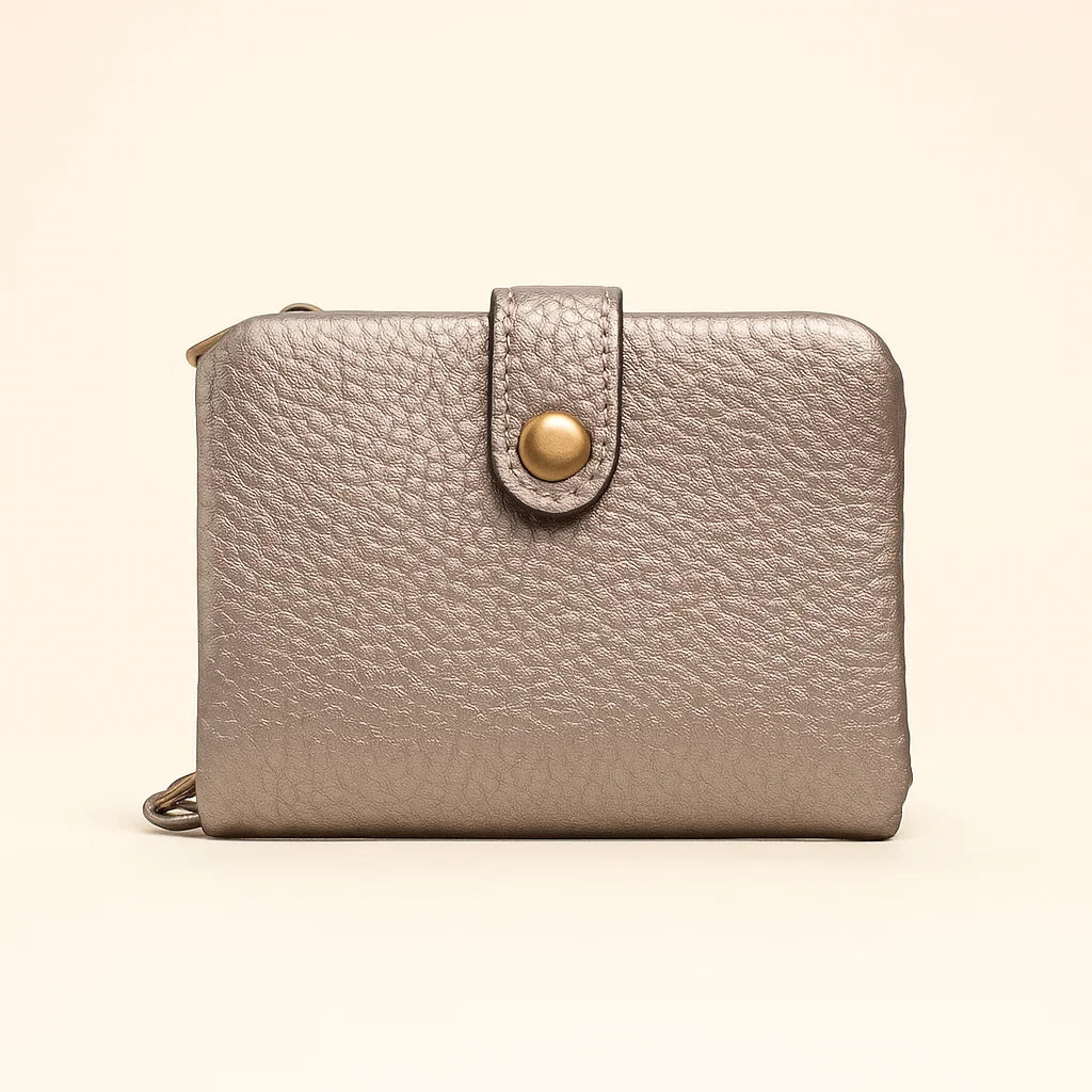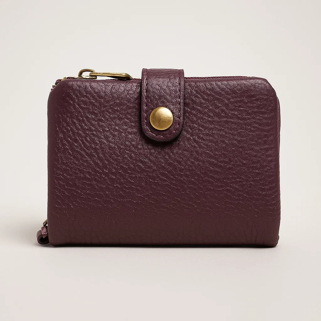 Doté de plusieurs compartiments, il permet de séparer monnaie et cartes pour un usage quotidien simplifié. Disponible en coloris taupe ou prune, il séduit par son allure moderne et son toucher agréable. Sa fermeture à pression et son zip garantissent sécurité et praticité.