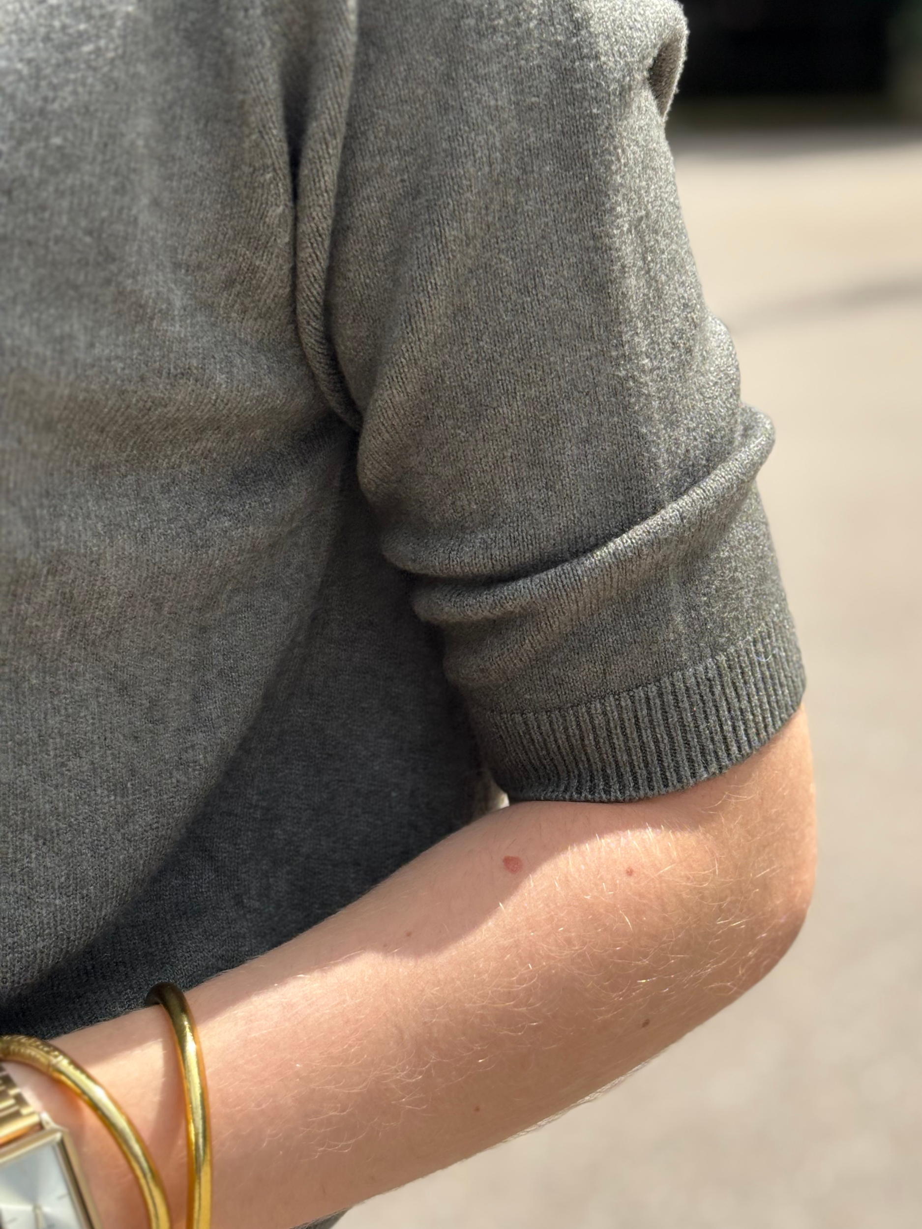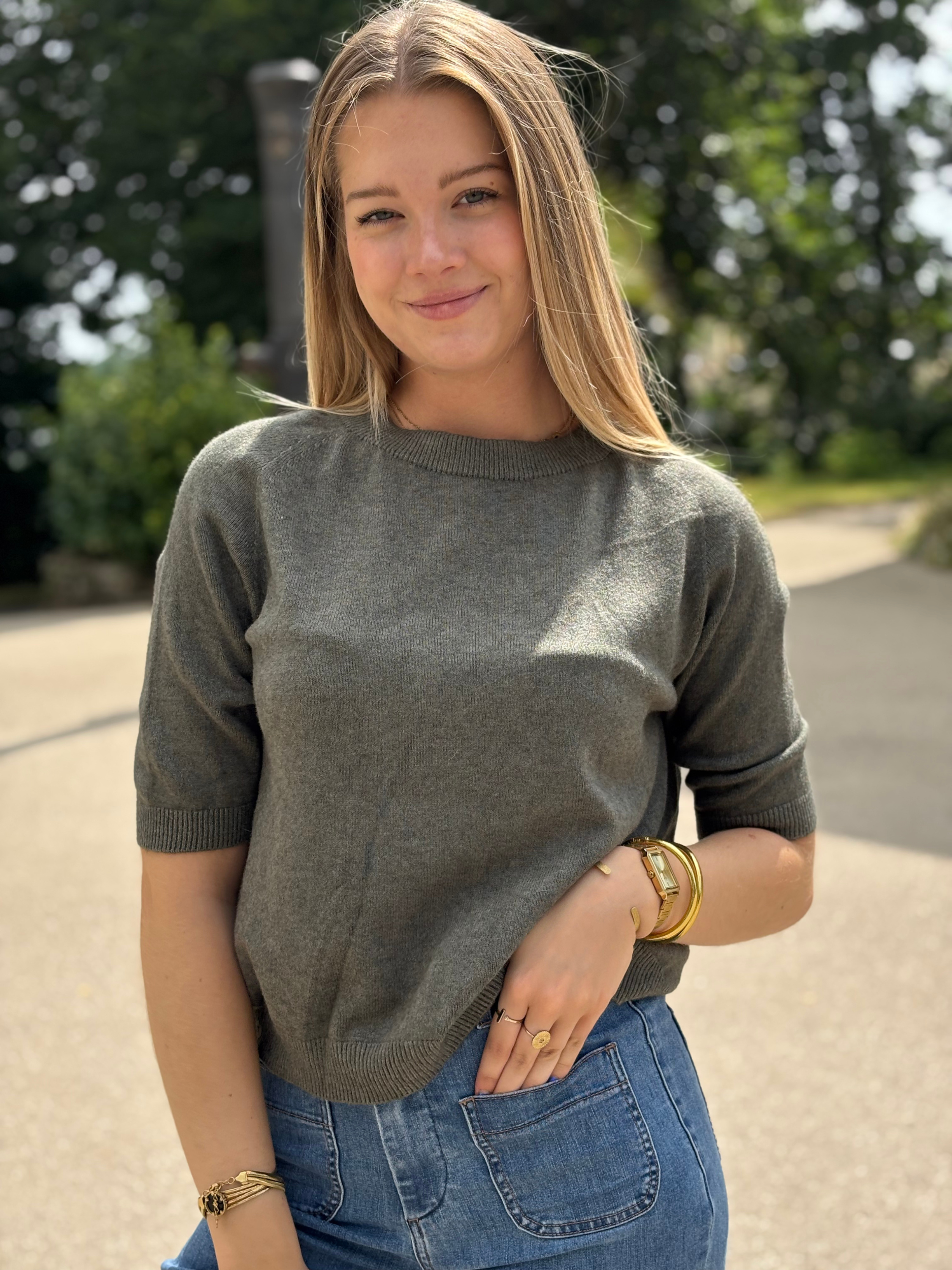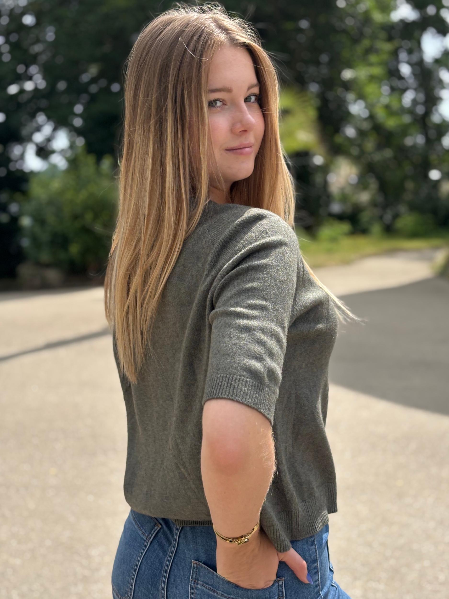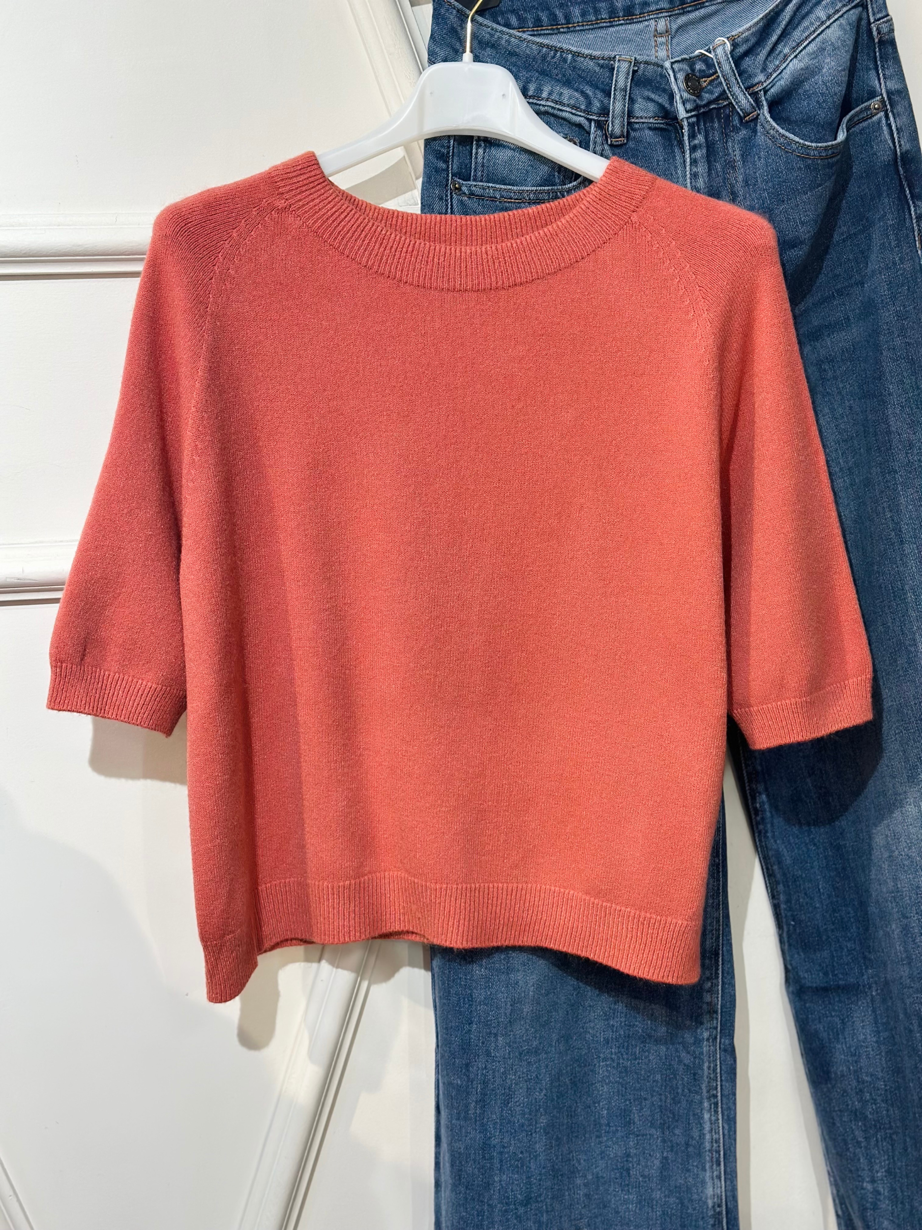 Avec une longueur de 59-60 cm et 55 cm de largeur environ, il offre une coupe droite légèrement ample, idéale pour toutes les silhouettes du 36 au 42. Le col rond structuré, les manches courtes et la finition bord-côte lui donnent une allure à la fois simple et élégante.