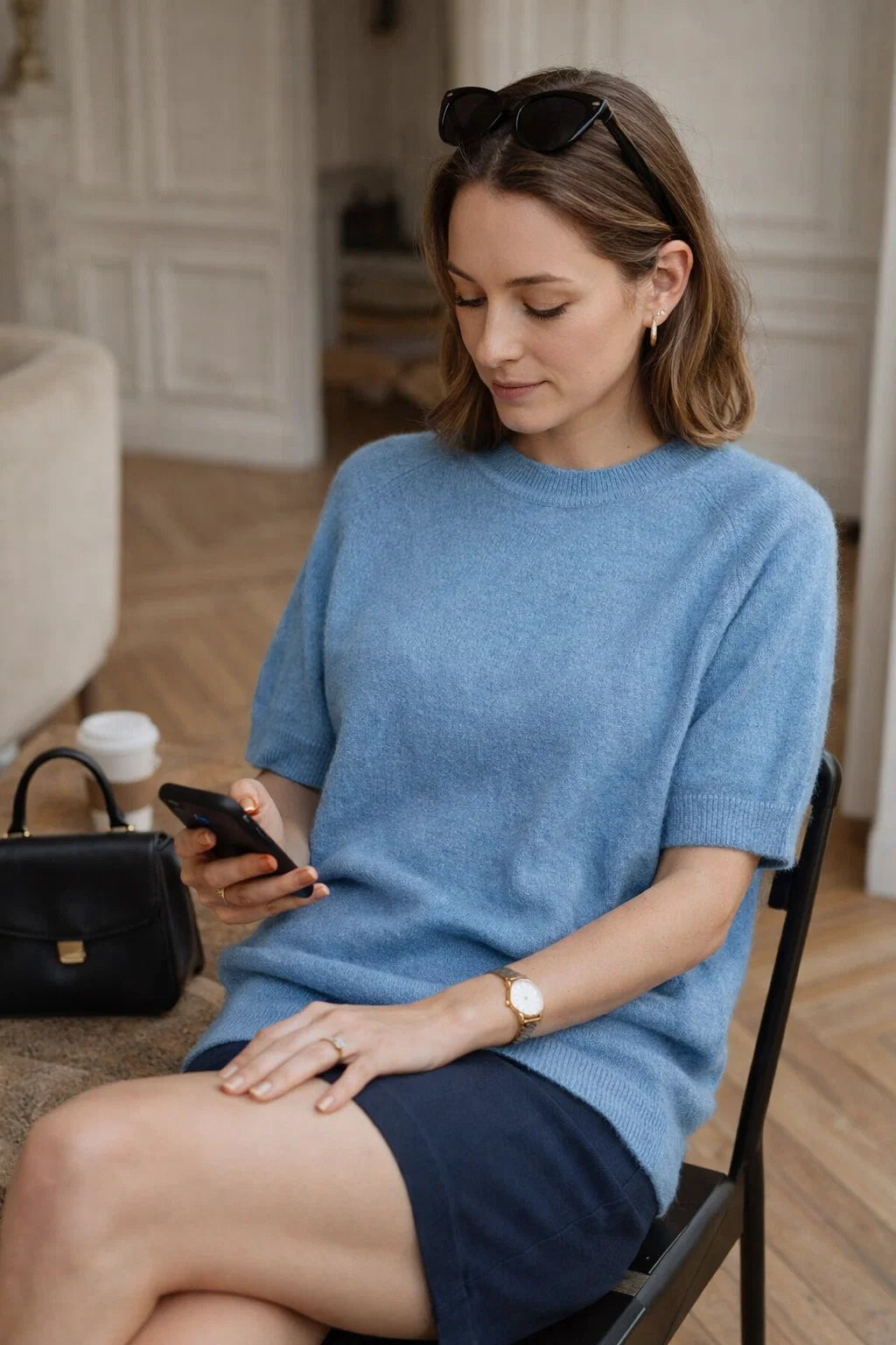 Sa coupe fluide met en valeur la silhouette sans la marquer, ce qui le rend particulièrement flatteur pour toutes celles qui recherchent à la fois confort et féminité. Les manches courtes apportent une touche moderne et permettent de le porter facilement sous un blazer ou un gilet.