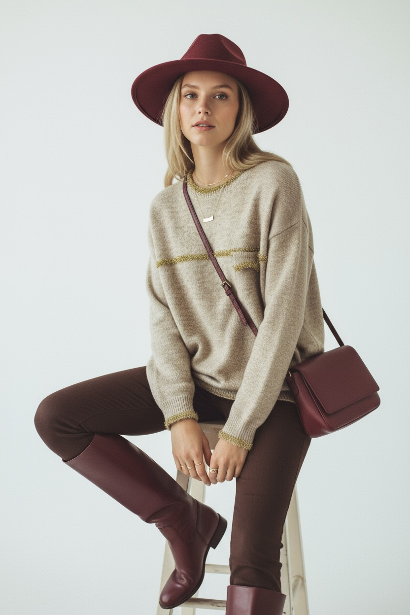 Ses finitions dorées sur le col, la poitrine et les poignets illuminent la silhouette avec subtilité, apportant une touche d’élégance moderne. Disponible en beige doux et noir profond, ce pull se porte aussi bien avec un pantalon fluide qu’avec un jean brut ou une jupe midi pour un look automnal chic et sophistiqué.