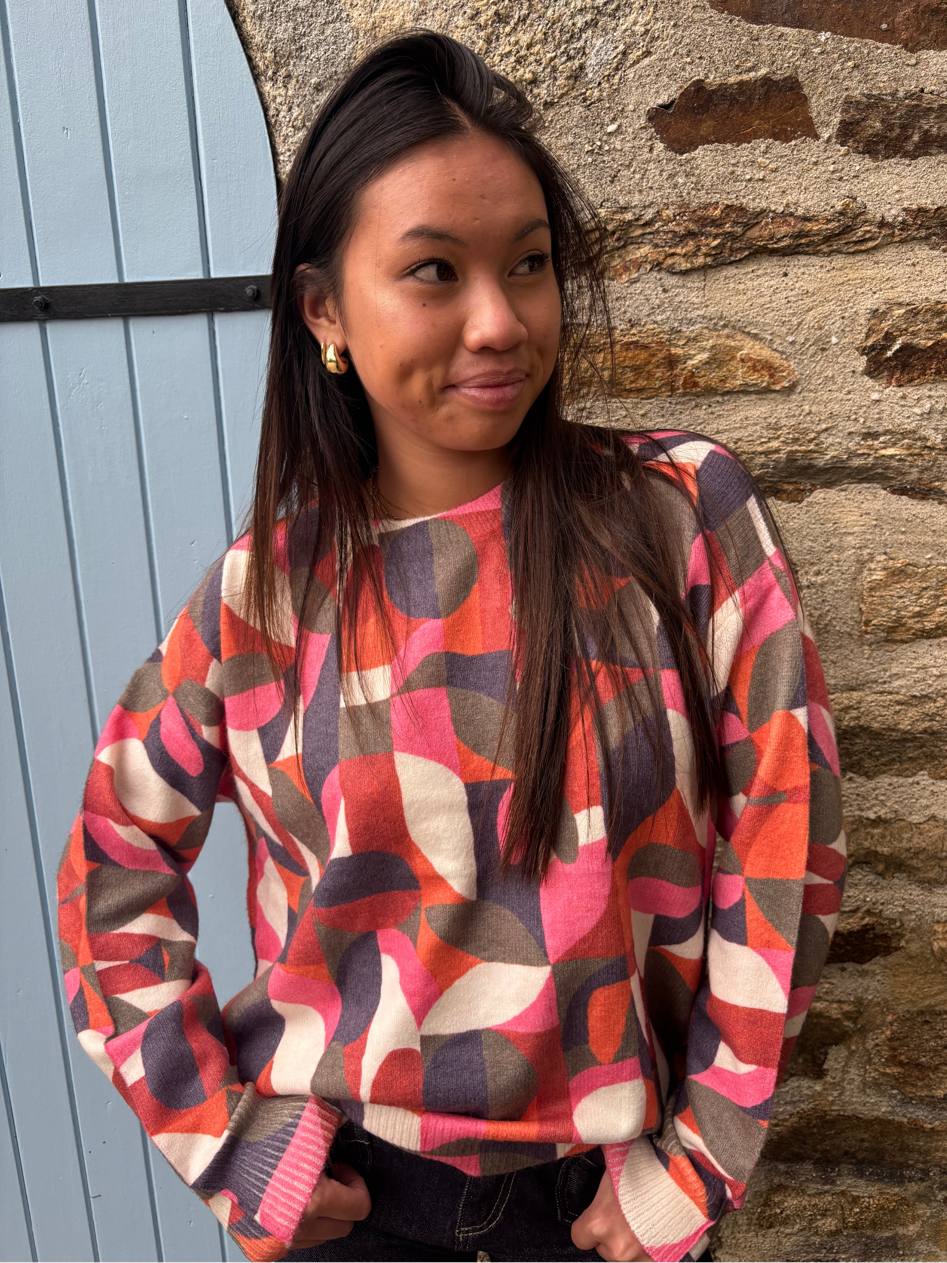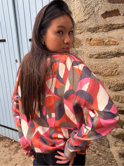 Ce pull se distingue par son motif géométrique multicolore aux tons chauds (orange, rose, crème et marron), son col montant discret, ainsi que sa coupe droite qui met en valeur la silhouette tout en restant décontractée.