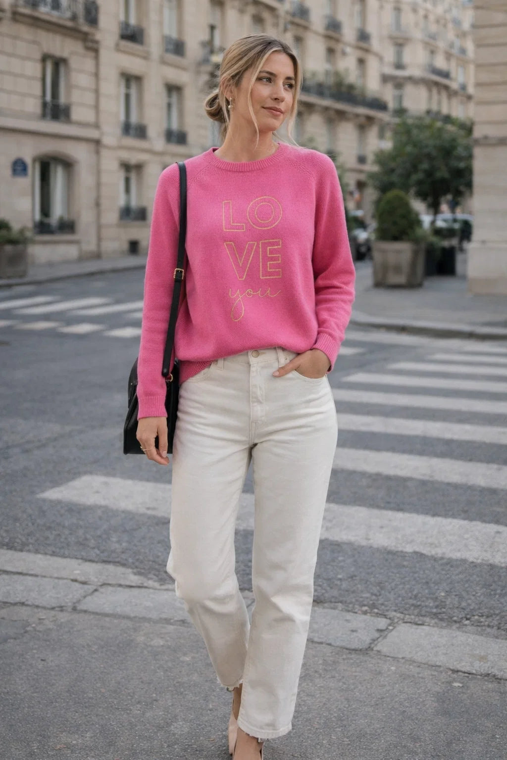 Ce pull en maille avec message “LOVE you” est une véritable déclaration de style et de positivité. Son inscription délicatement dorée apporte une touche lumineuse et féminine, tout en restant subtile et élégante. C’est le pull parfait pour celles qui aiment porter des pièces à message, pleines de sens et de bonne humeur.