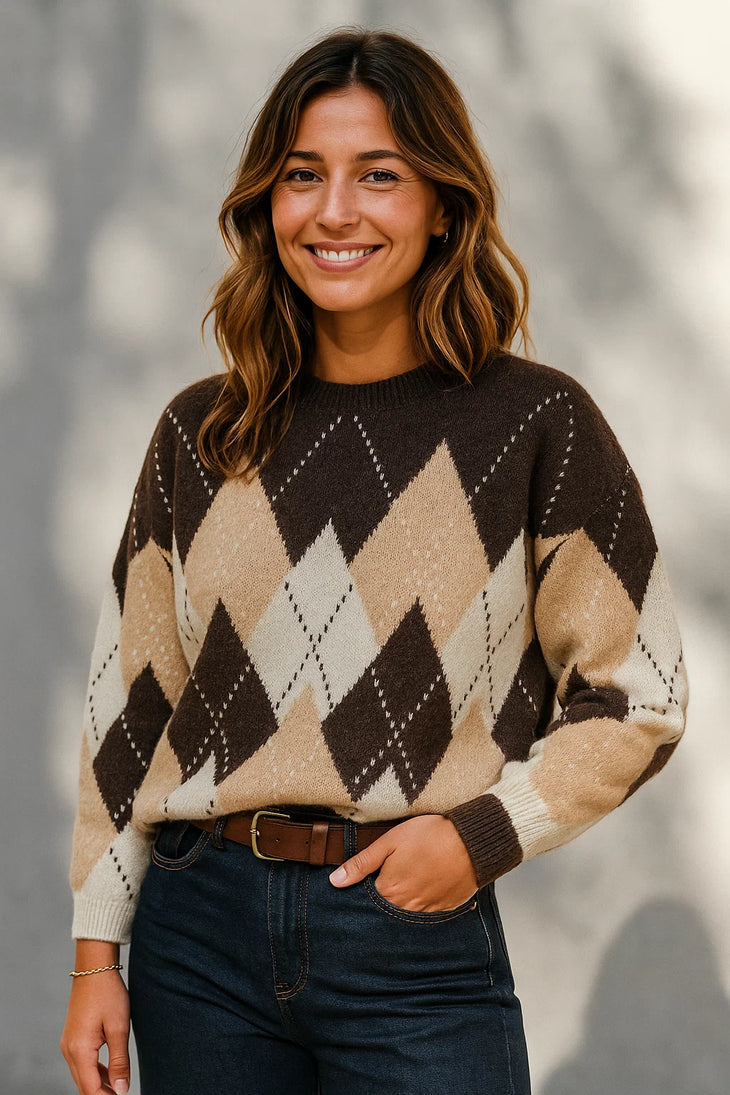 Chère cliente, si vous aimez les pulls doux, chauds et pleins de charme, ce pull jacquard aux tons marron, beige et écru va devenir votre allié de saison. Son motif losanges iconique revisité dans une palette naturelle apporte une touche rétro chic très tendance. Sa coupe légèrement oversize lui donne ce côté cosy et confortable que l’on adore porter en hiver.