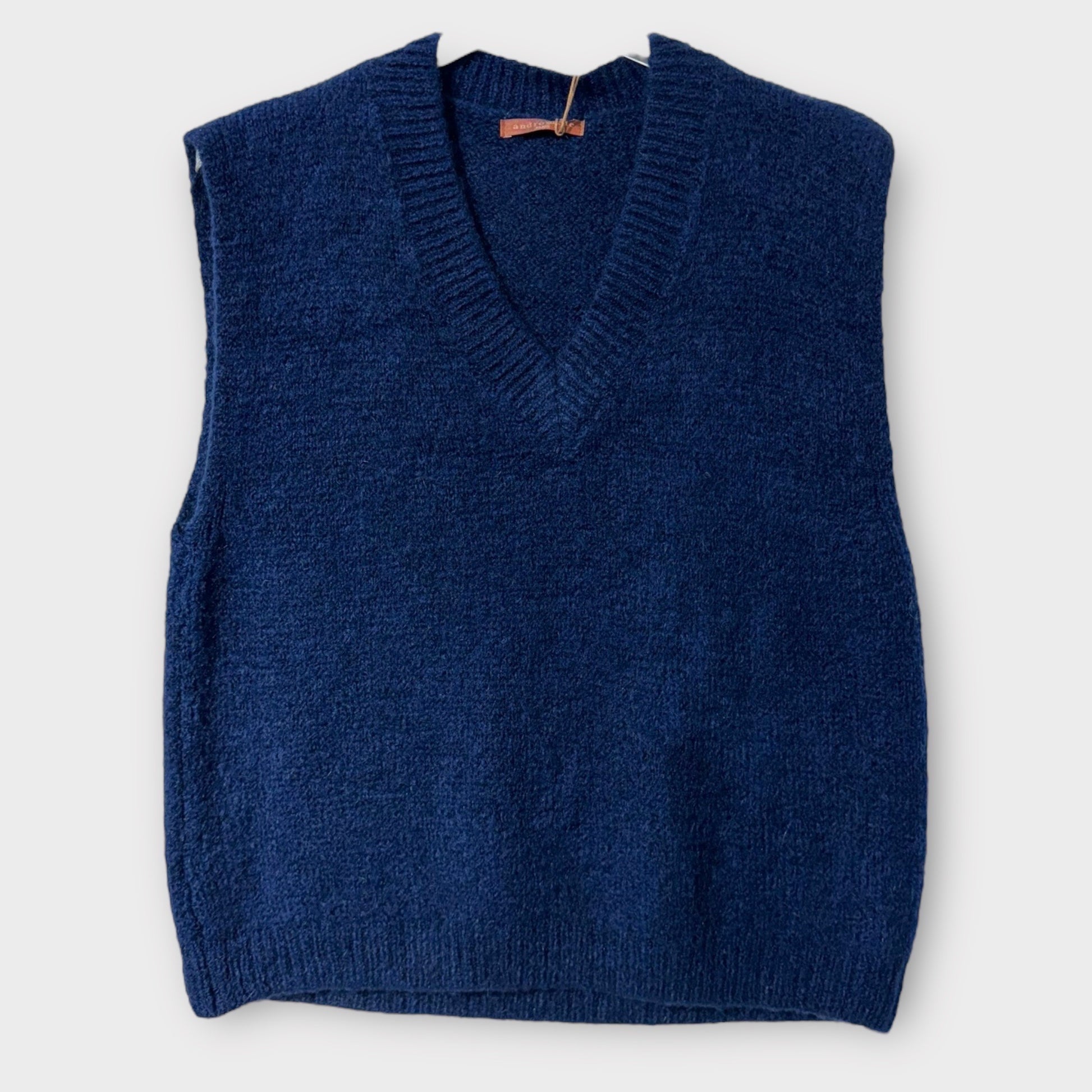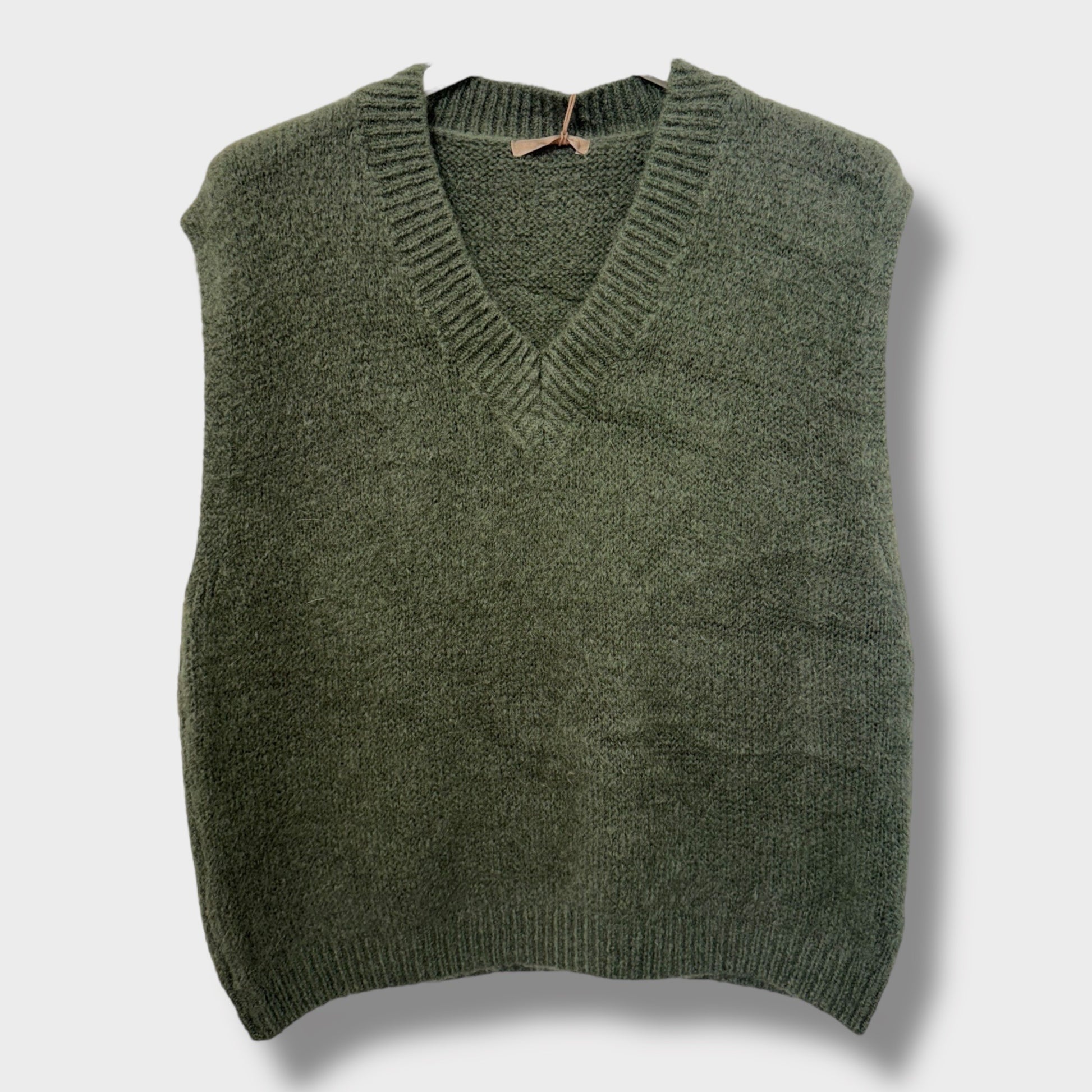 Ce pull sans manches col V est une pièce douce et confortable à intégrer dans vos looks bohème chic. Conçu en mélange haut de gamme de kid mohair, laine et fibres mélangées, il allie chaleur, légèreté et élégance. Sa coupe ample et moderne en taille unique convient du 36 au 42 environ.