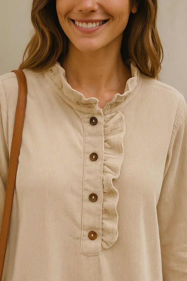 Cette robe en coton séduit par sa coupe fluide et son style bohème plein de charme. Confectionnée en 100 % coton, elle offre un confort absolu et une matière respirante, idéale pour les journées douces d’automne. Son col montant à volants et sa patte boutonnée sur le devant lui confèrent une allure romantique et féminine, tandis que les manches longues resserrées aux poignets ajoutent une touche de raffinement.