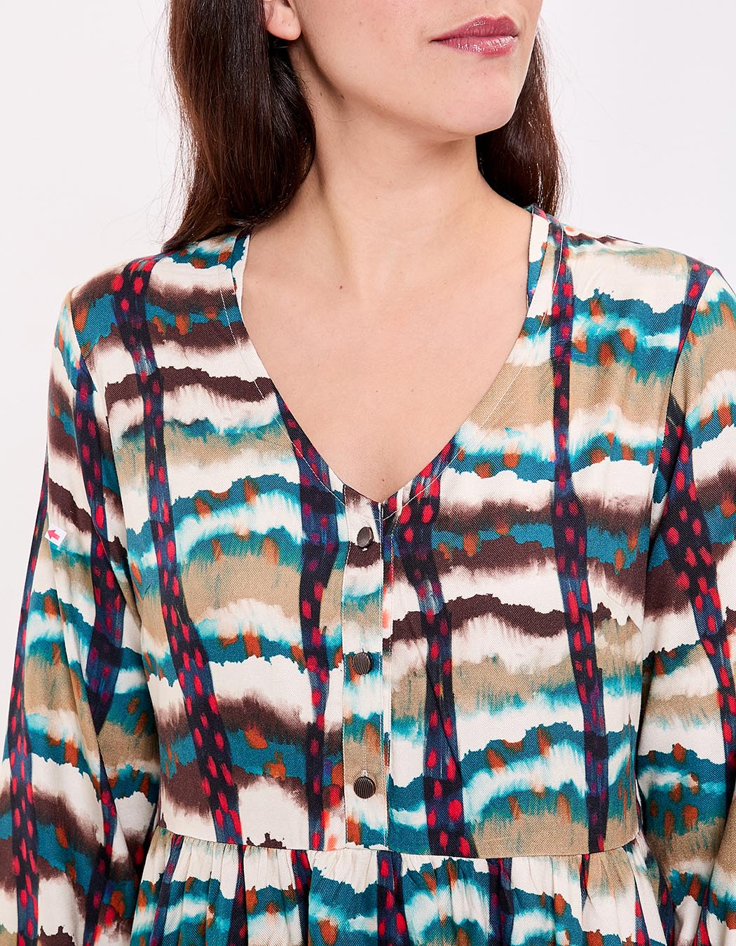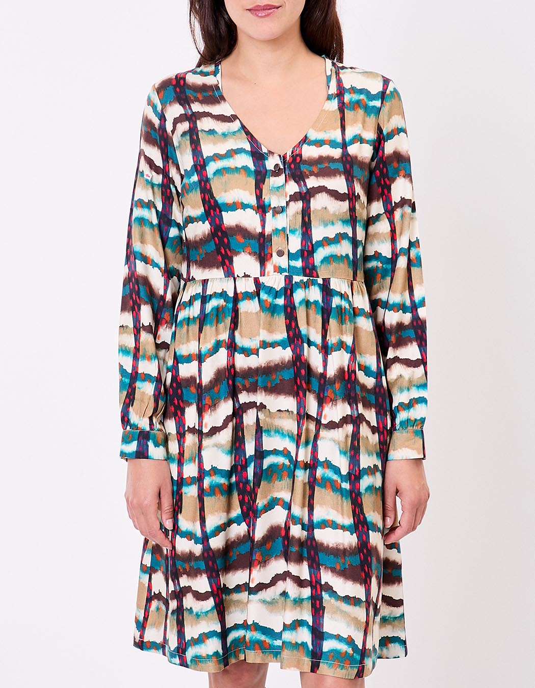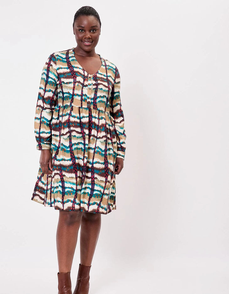 Cette robe d’hiver imprimée est une pièce féminine et confortable, idéale pour les journées fraîches. Confectionnée en 100 % viscose LENZING™ ECOVERO™, une fibre écoresponsable issue de sources durables, elle offre une matière fluide, douce et agréable à porter.