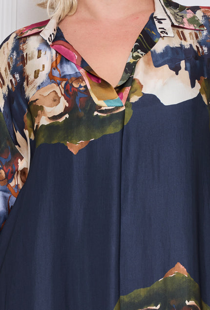 Son imprimé multicolore, entre touches abstraites et nuances profondes de bleu, vert et rose, fait de cette robe une pièce unique qui attire le regard. Sa longueur mi-mollet permet de la porter aussi bien en journée avec des sandales plates qu’en soirée avec des escarpins.