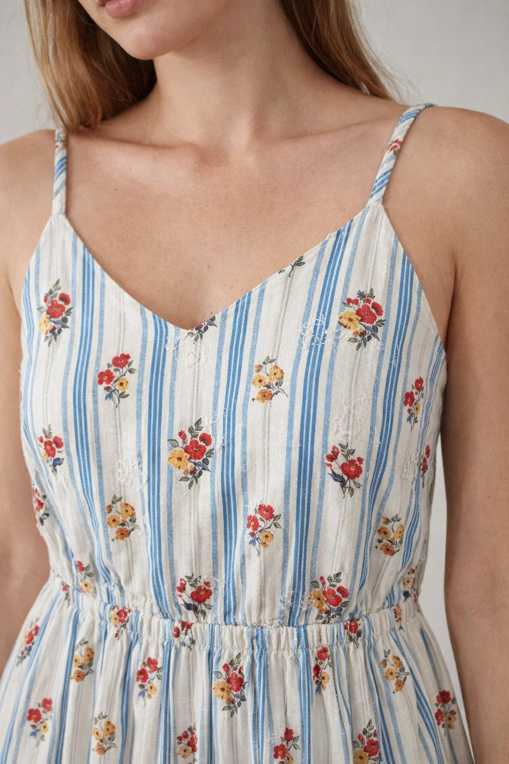 Son décolleté en V avec fines bretelles apporte de la légèreté à la silhouette et met délicatement le haut du corps en valeur. La taille légèrement marquée permet de structurer la robe tout en conservant une coupe fluide et confortable.