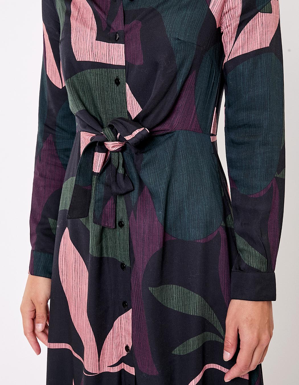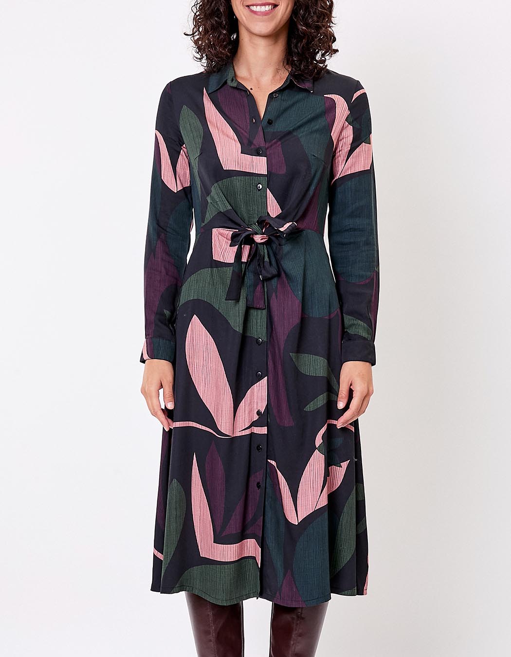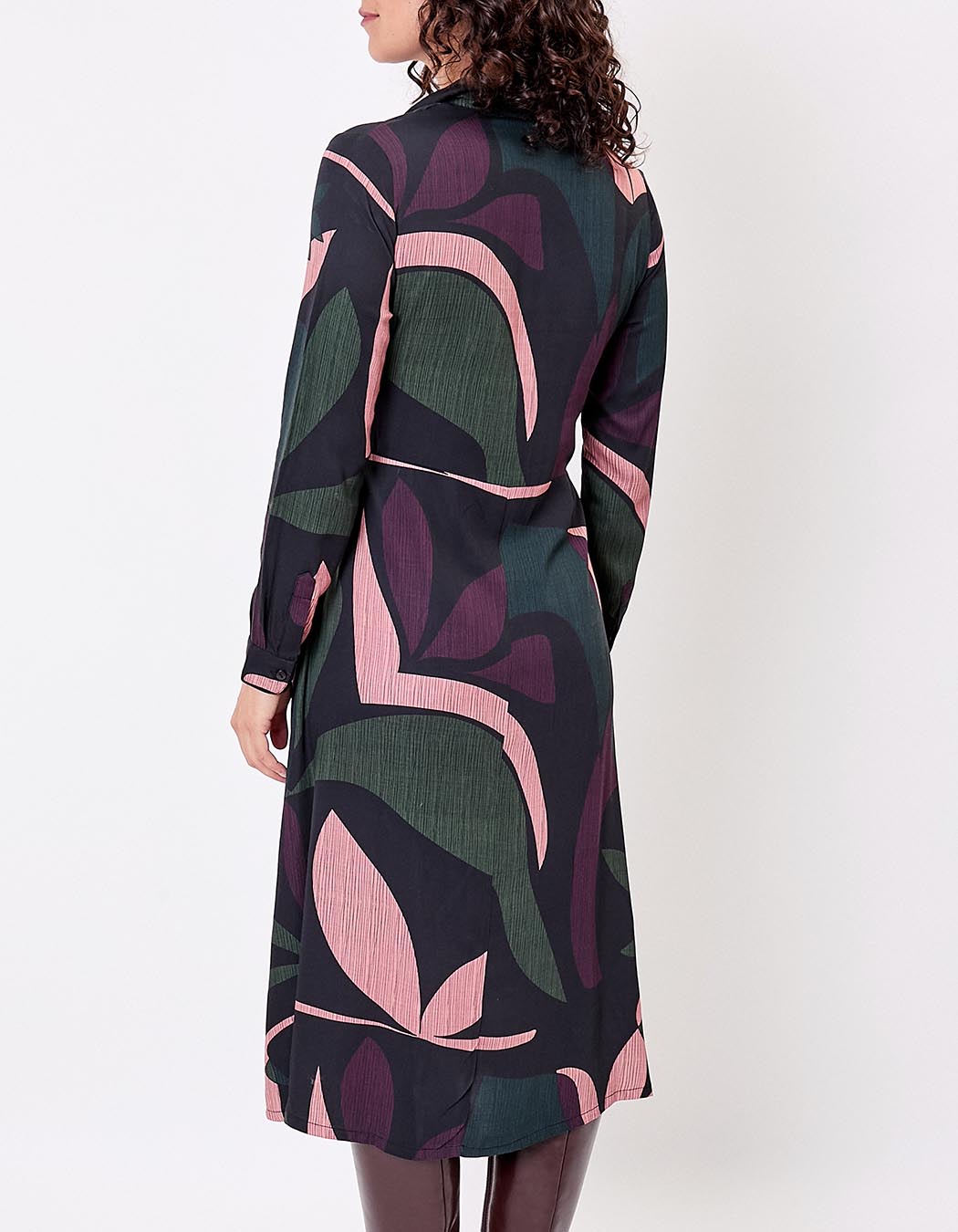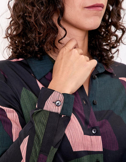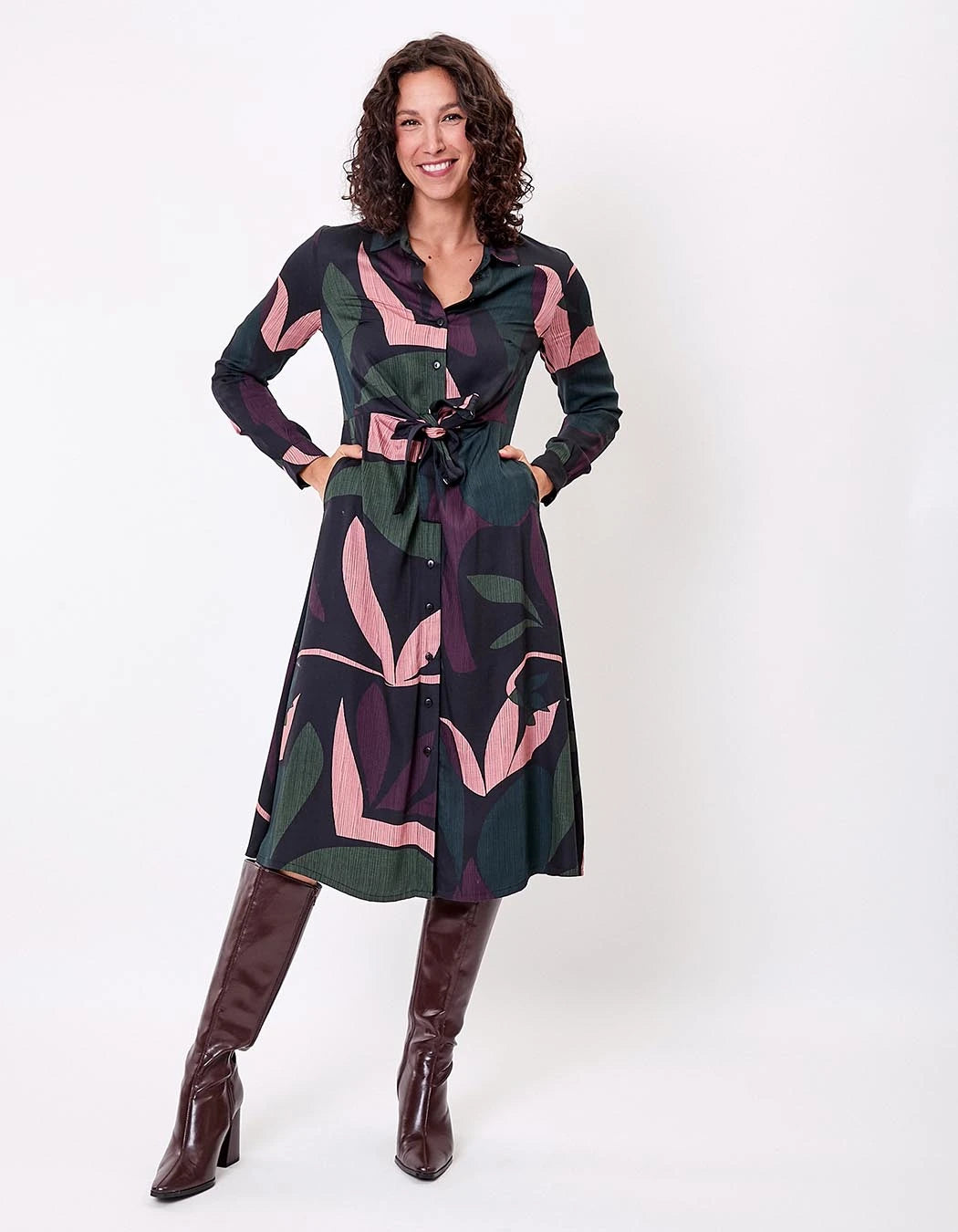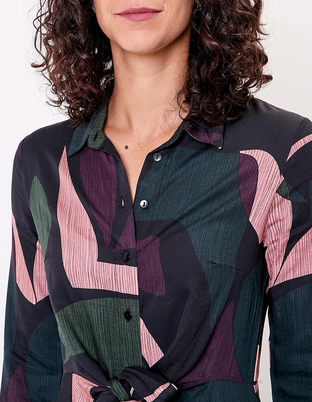 Cette robe chemisier midi associe confort et élégance dans un style bohème chic, parfait pour les femmes en quête de singularité. Conçue en 100 % Viscose Lenzing™ Modal™, elle se distingue par sa matière douce et fluide qui accompagne vos mouvements au quotidien. Son imprimé Carson Black, graphique et coloré, apporte une touche artistique facile à porter en toutes saisons.