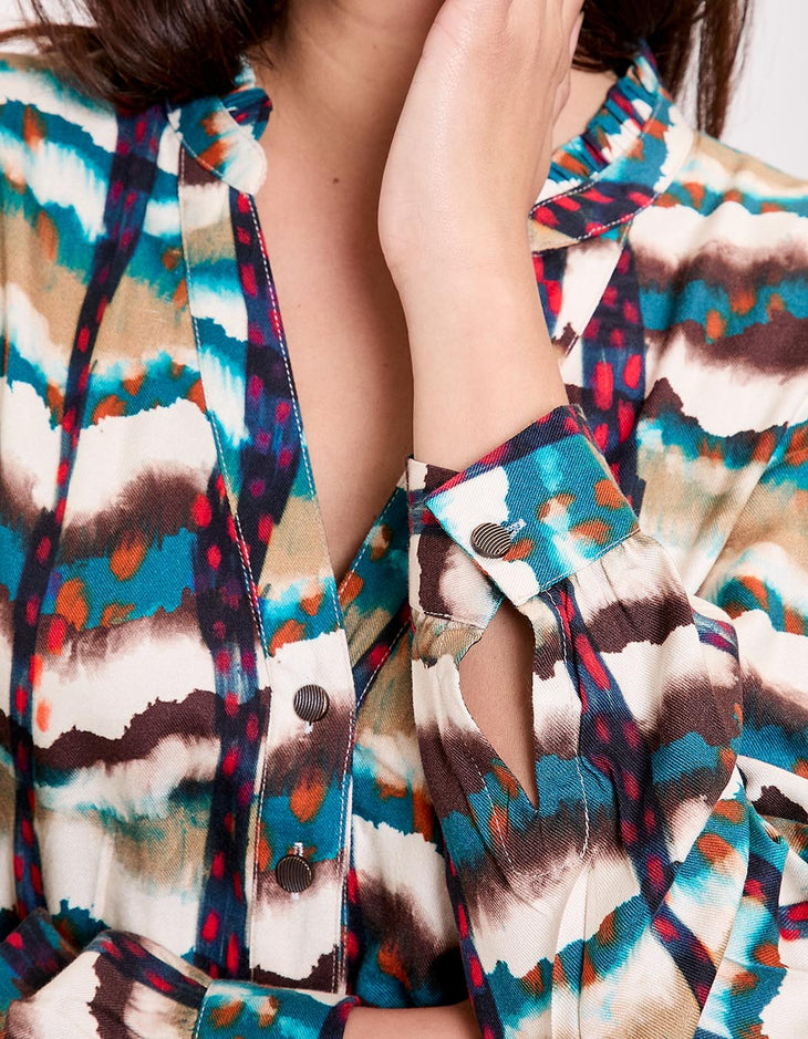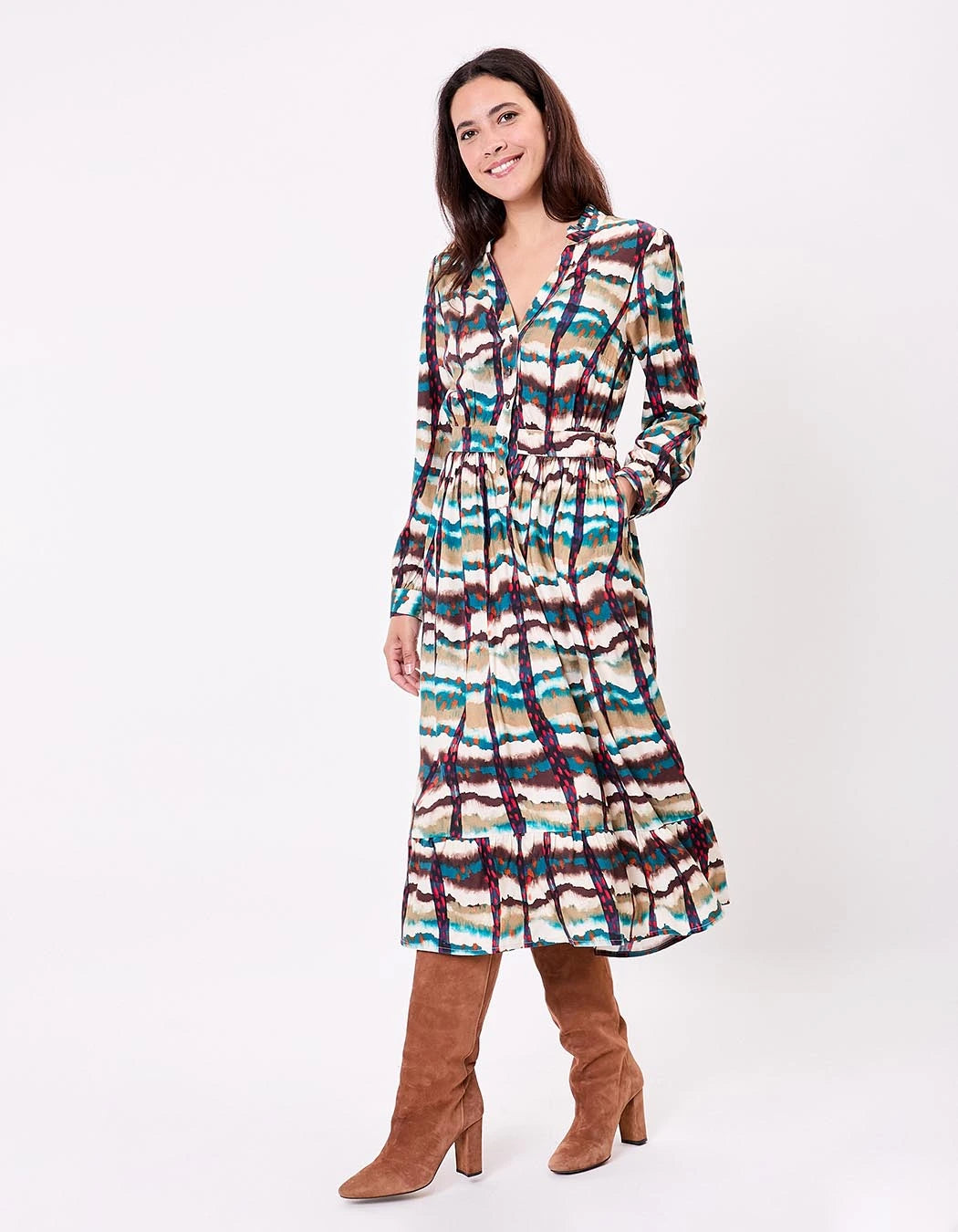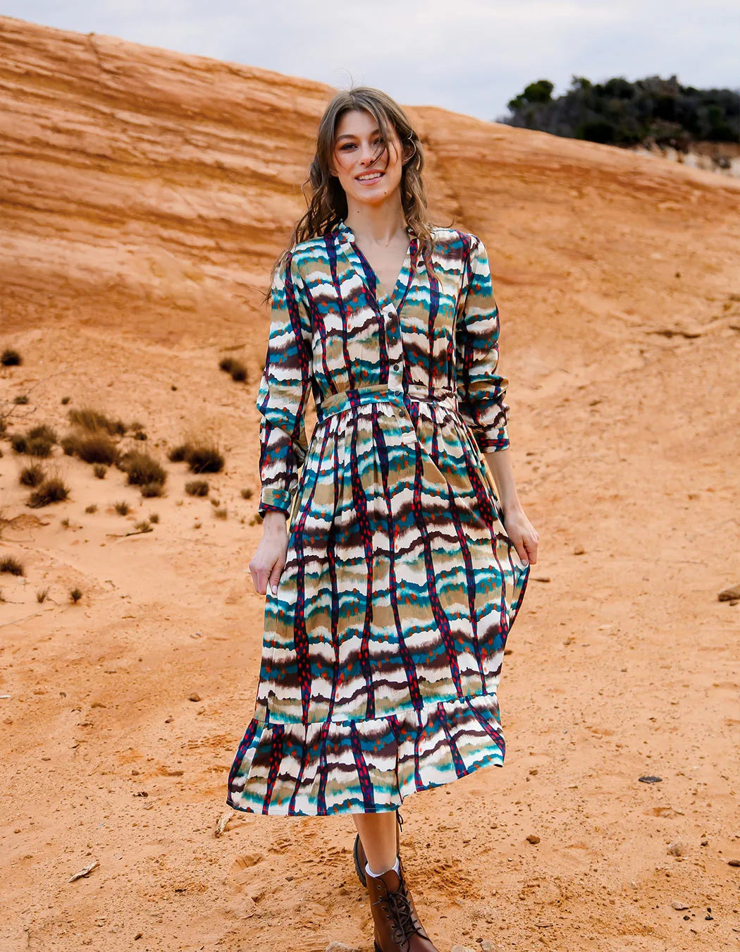Cette robe midi à l’imprimé Asha incarne l’esprit bohème chic avec sa coupe fluide et ses détails raffinés. Confectionnée en 100 % viscose LENZING™ ECOVERO™, elle offre une matière douce, légère et éco-responsable, idéale pour celles qui recherchent à la fois style et confort.