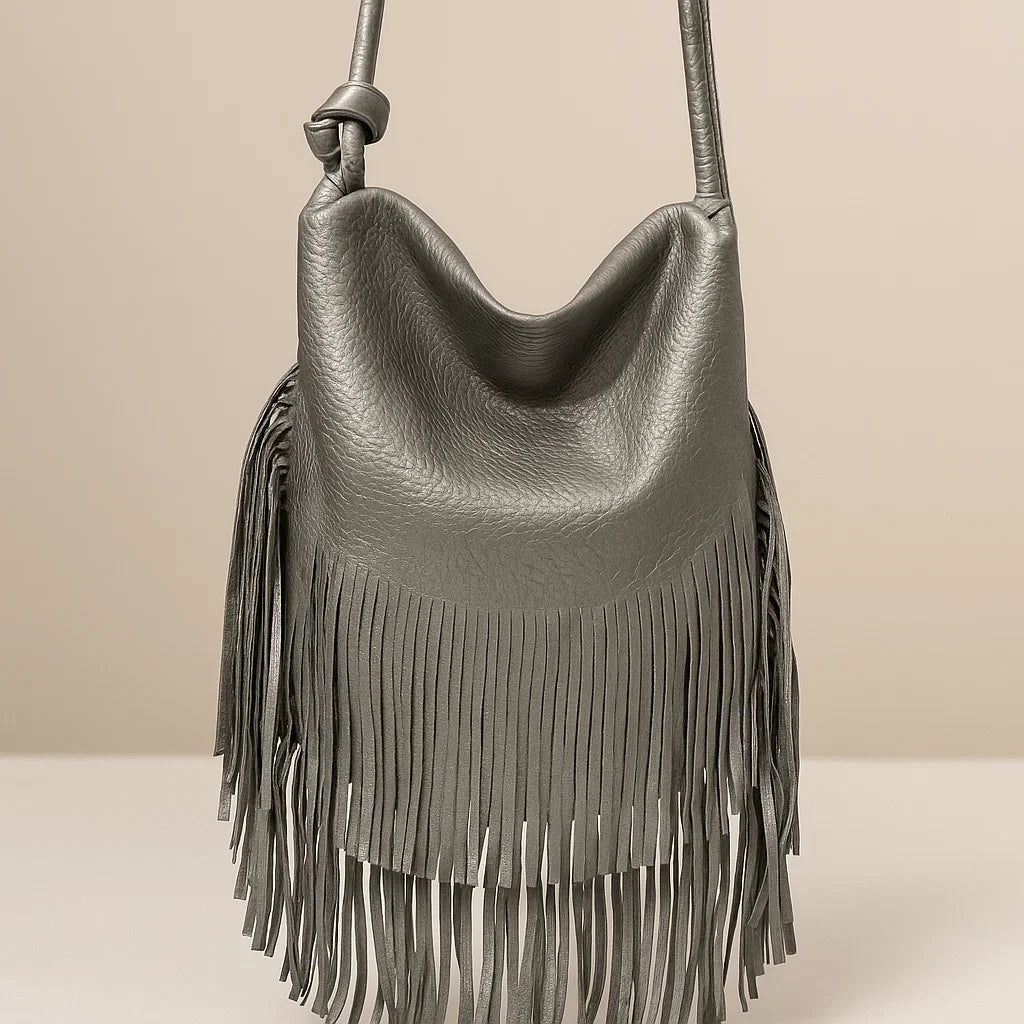 Apportez une touche bohème chic à vos tenues avec ce sac à franges grand format. Disponible en vert intense et en bronze lumineux, il allie style, originalité et praticité.
