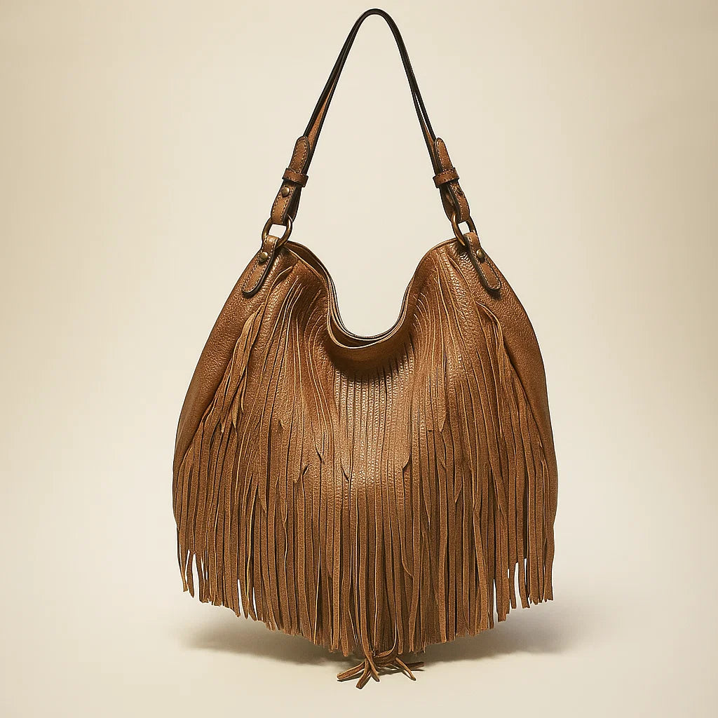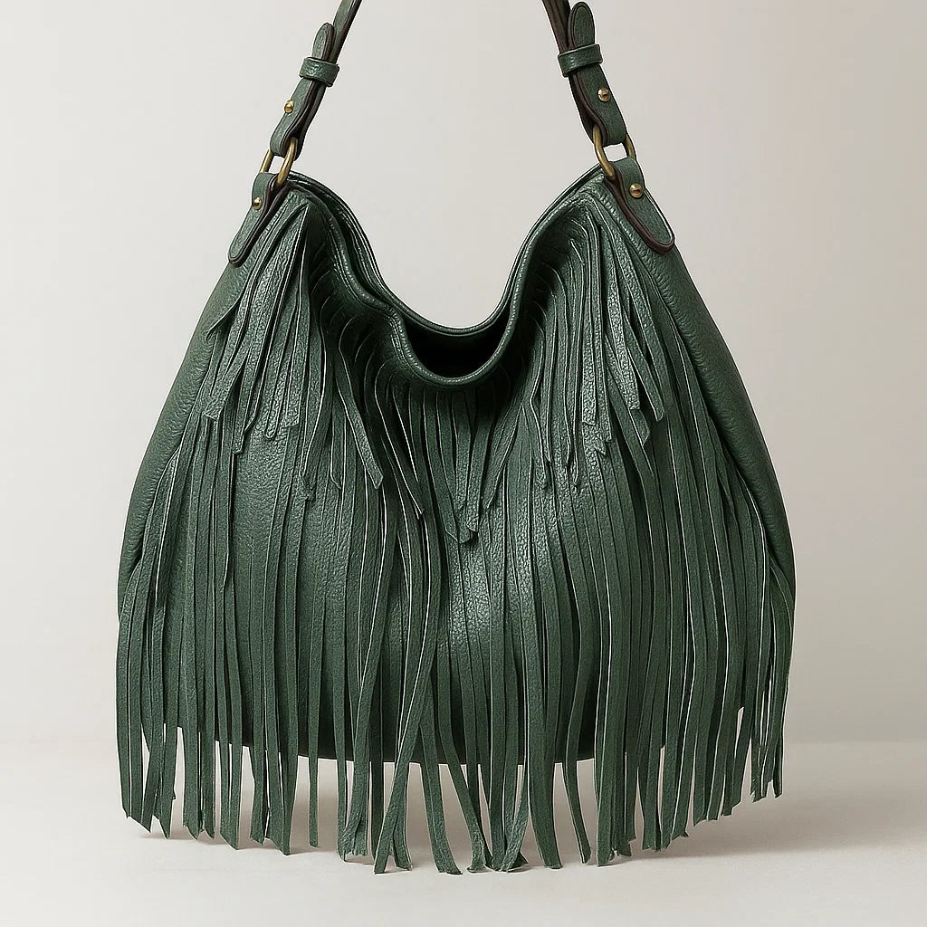 Ce sac à franges grand format est la pièce idéale pour toutes celles qui souhaitent affirmer un style bohème chic au quotidien. Disponible en vert profond et en bronze lumineux, il séduit par son design unique et ses finitions travaillées.