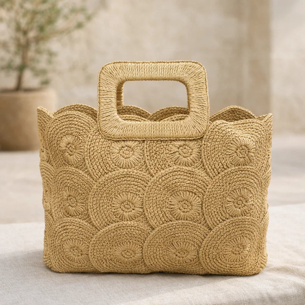 Ce sac en raphia est l’accessoire parfait pour accompagner vos tenues estivales avec style et naturel. Son tressage délicat formant de jolis motifs circulaires lui donne un charme artisanal unique qui s’inscrit parfaitement dans l’esprit bohème chic.