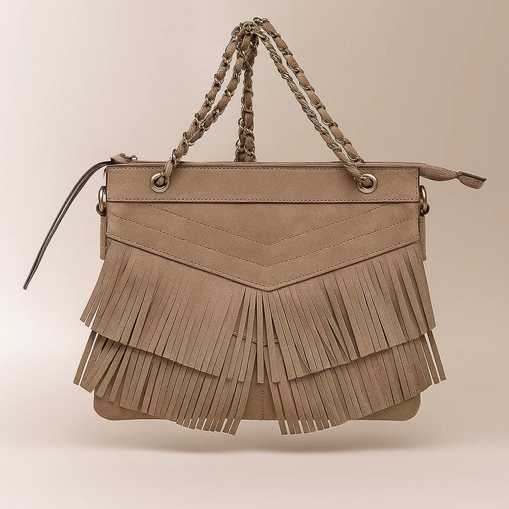 Craquez pour ce sac à franges taupe, un accessoire parfait pour compléter vos looks bohèmes avec élégance. Compact et pratique, son format 29x22x2 cm vous accompagne au quotidien sans compromettre votre style.