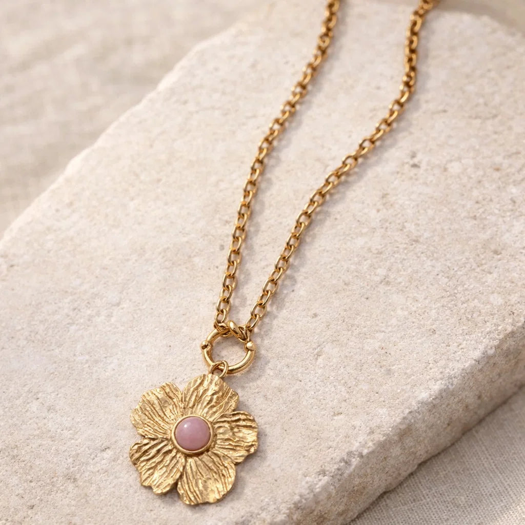 Ce sautoir en acier inoxydable est la pièce parfaite pour apporter une touche bohème chic à vos looks. Avec son pendentif en forme de fleur texturée et sa pierre colorée, il attire le regard tout en restant élégant et facile à porter.