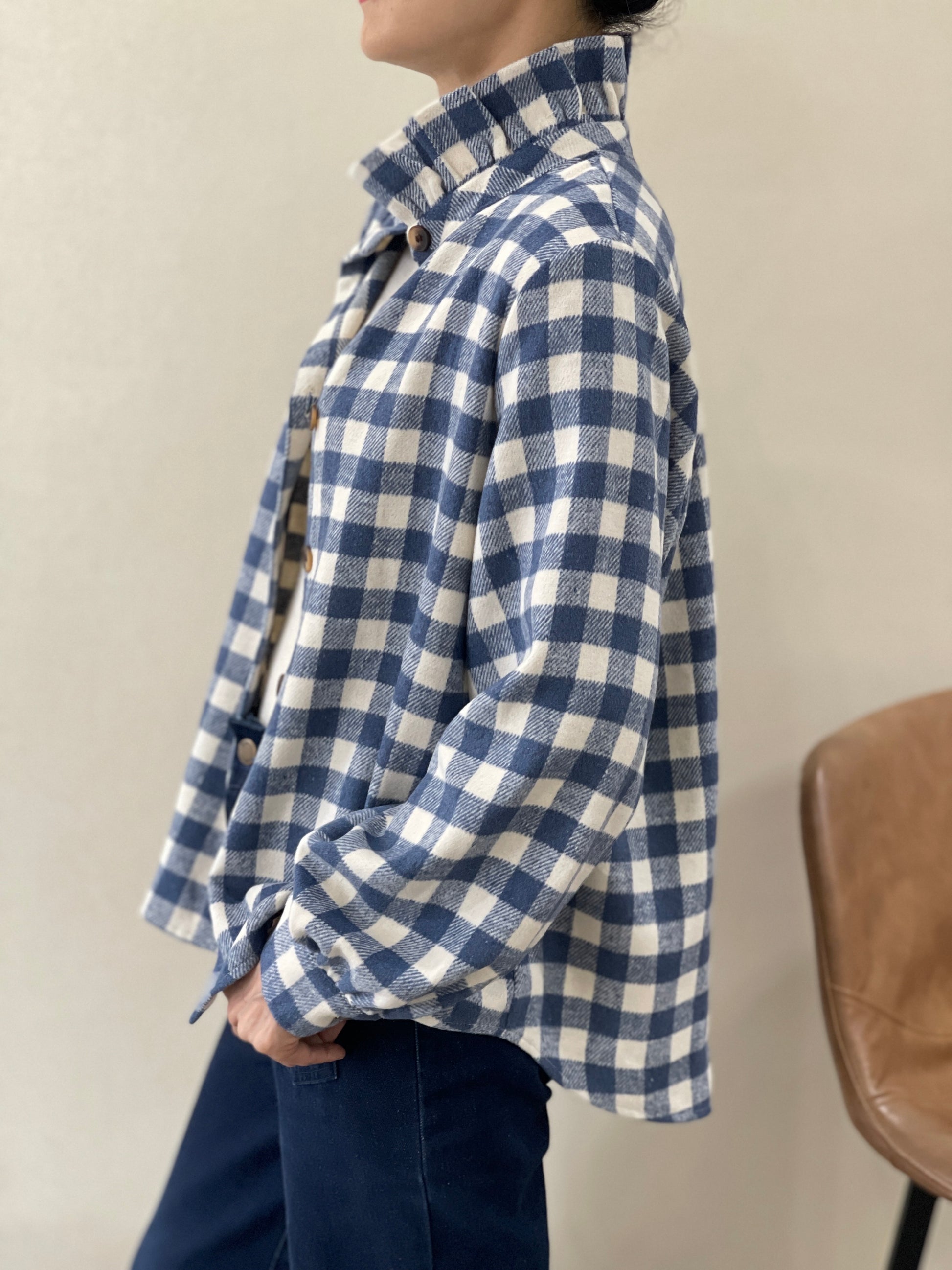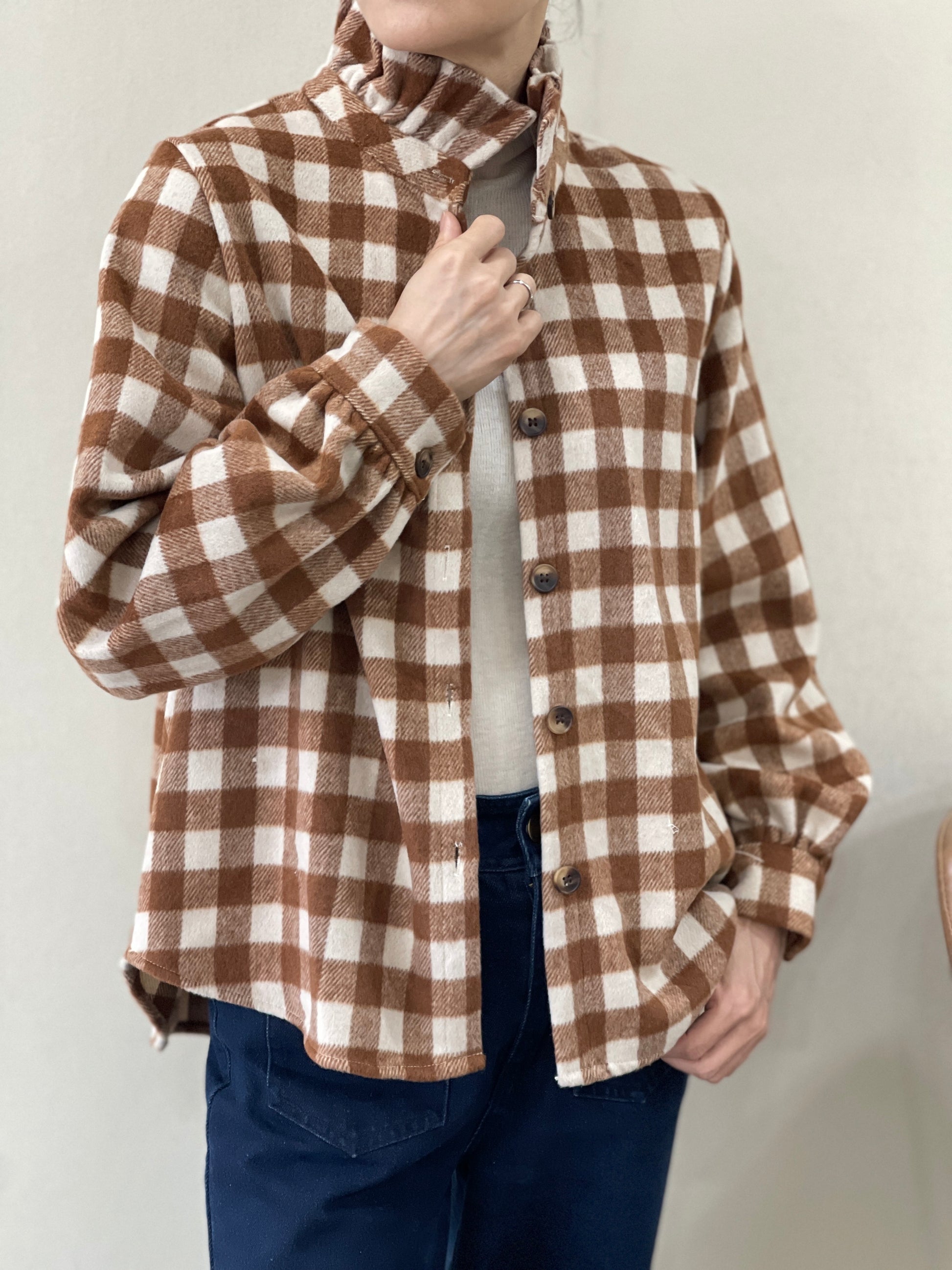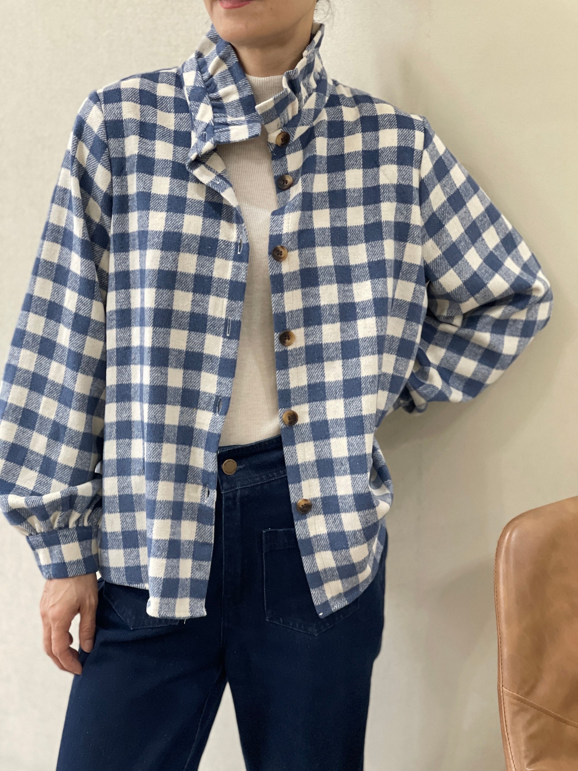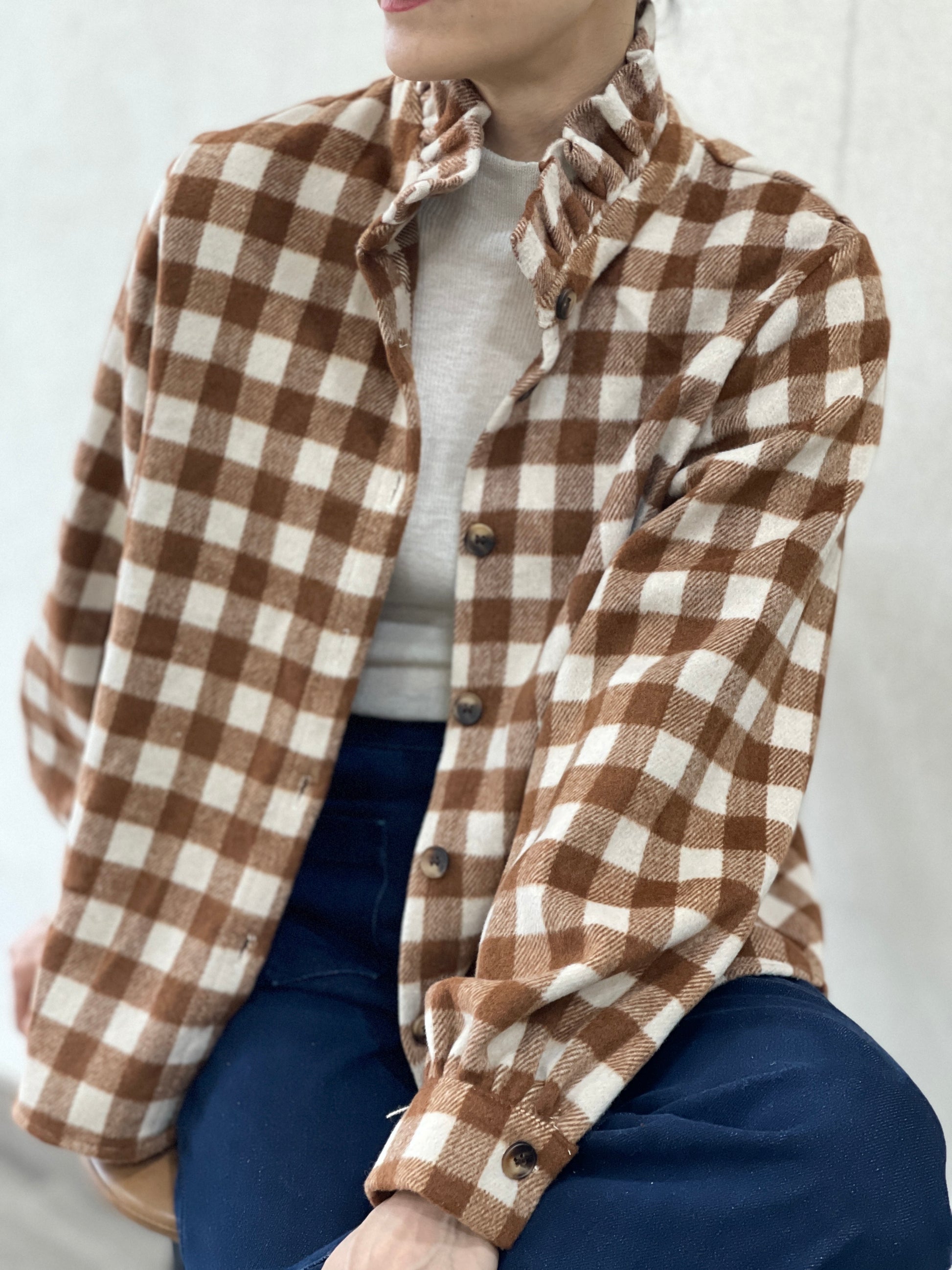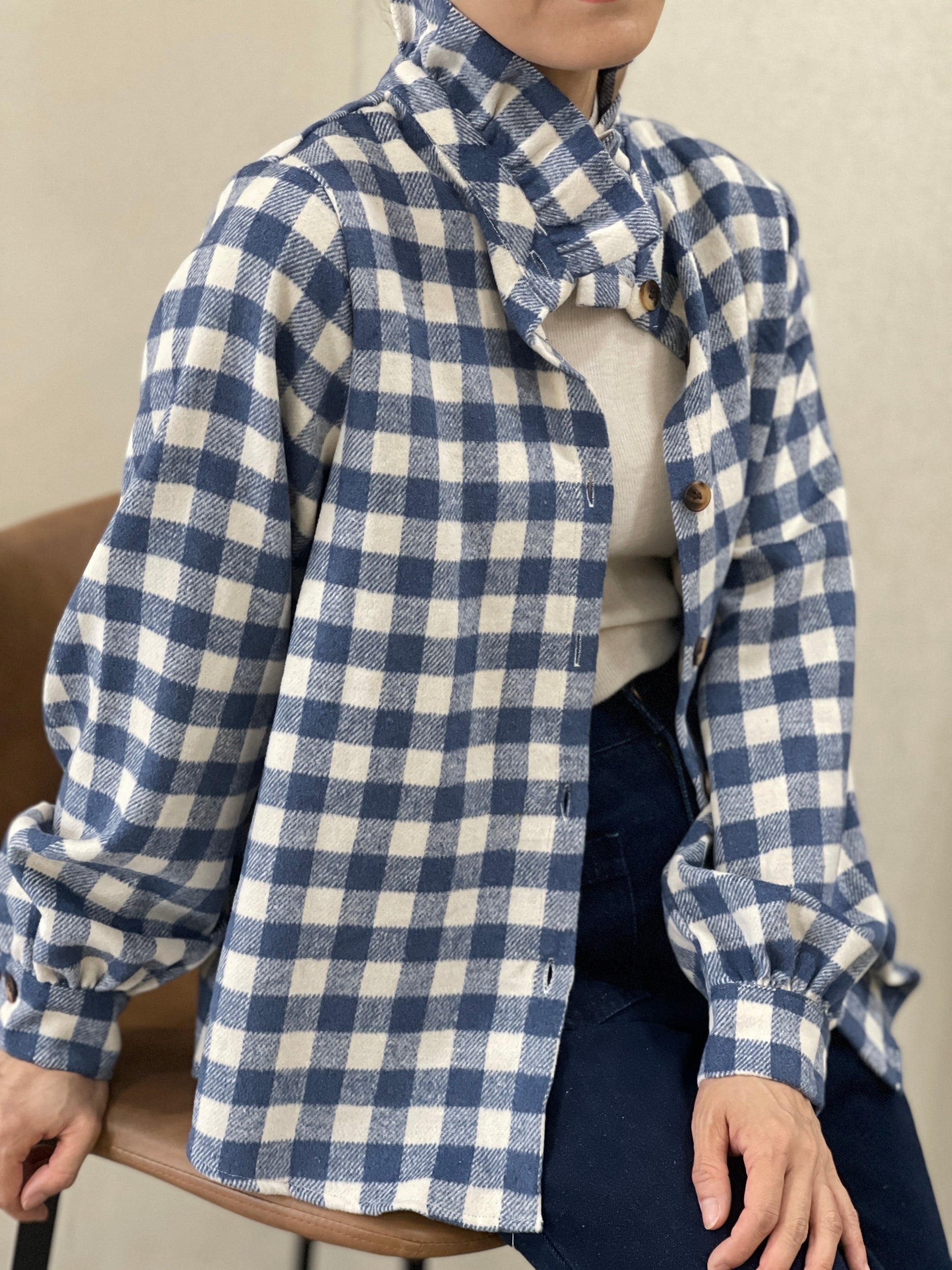 Son motif à carreaux, décliné en marron ou en bleu, apporte une touche rétro revisitée et se marie facilement avec vos tenues quotidiennes. Sa coupe droite, ses boutons contrastés et son col montant lui donnent une allure moderne et décontractée, parfaite pour un look casual chic.