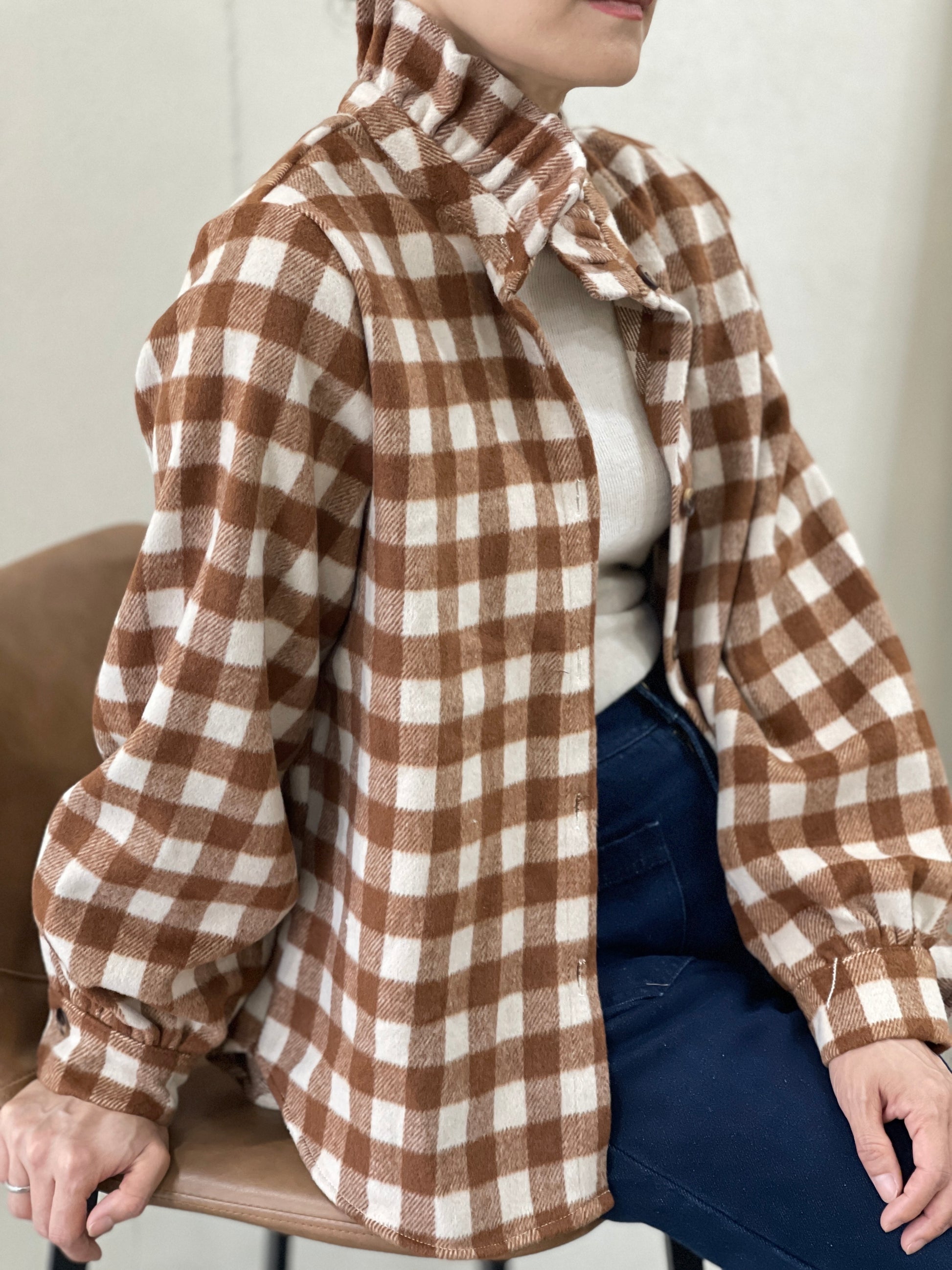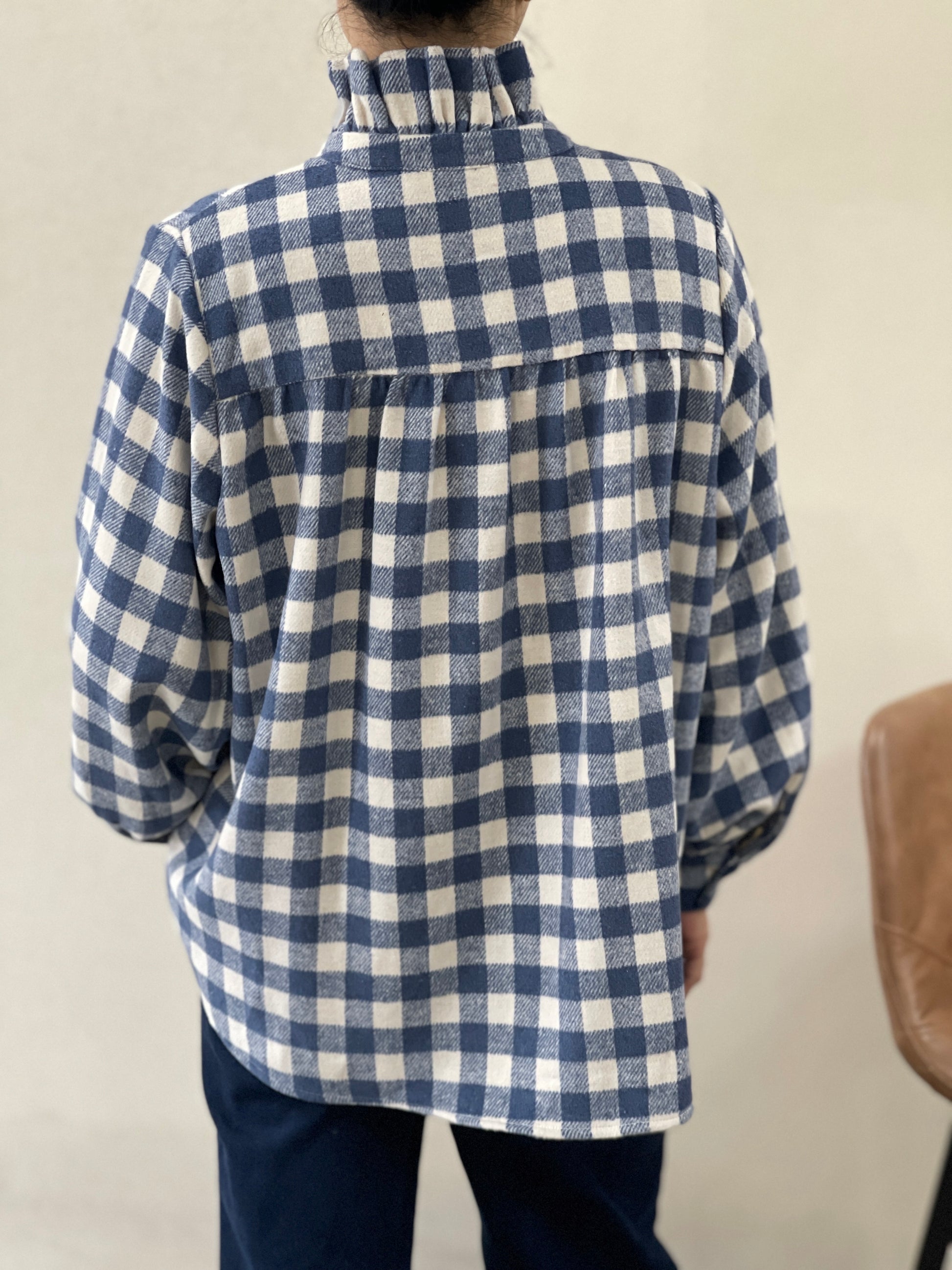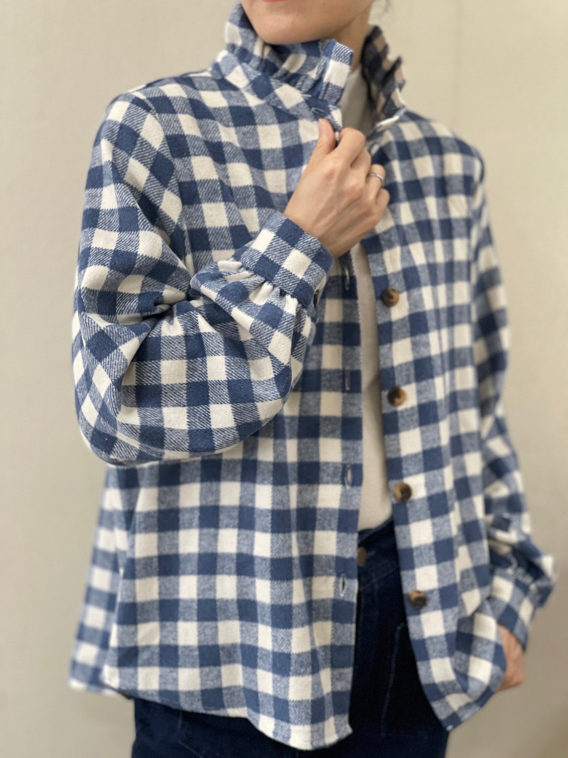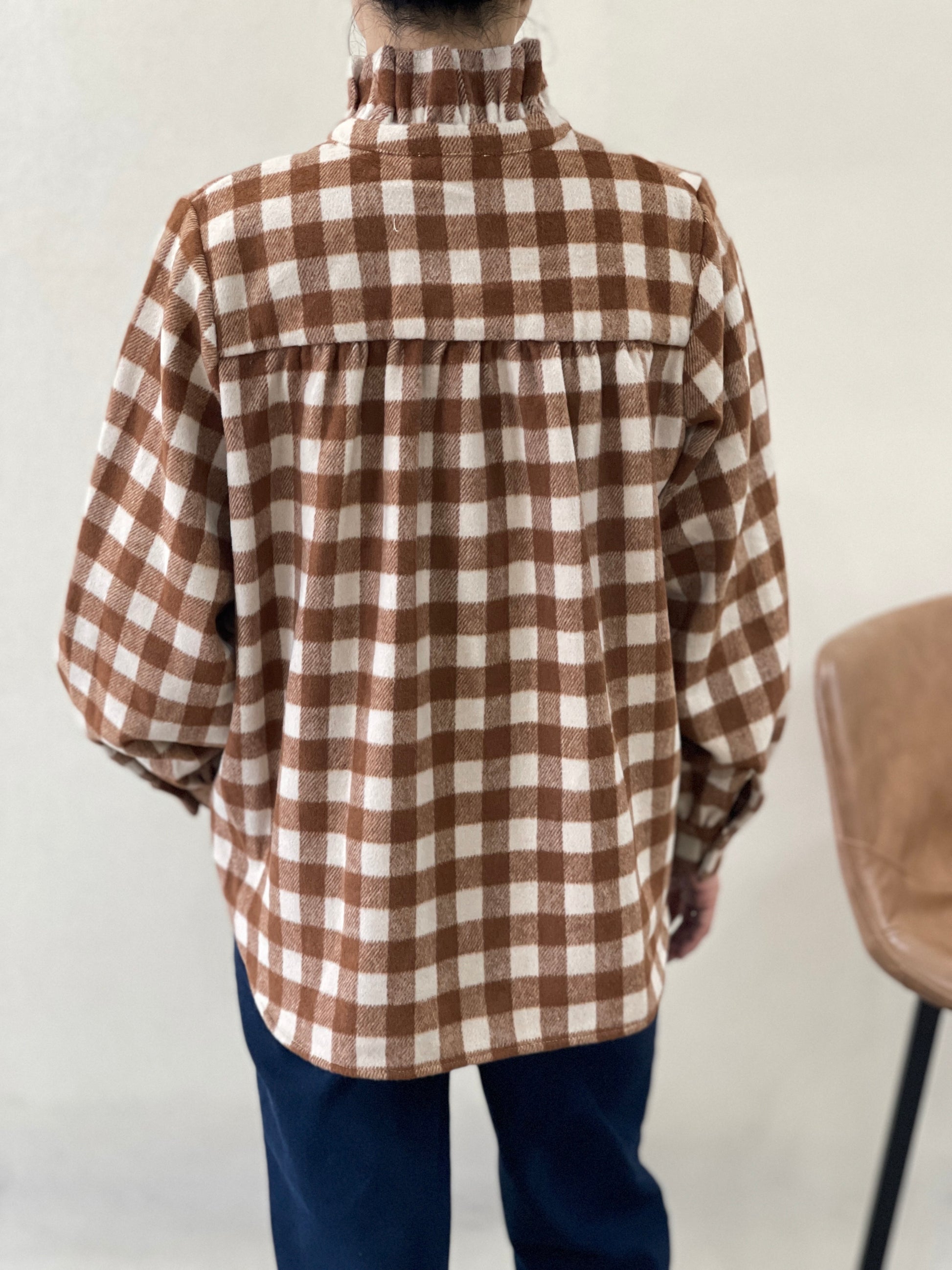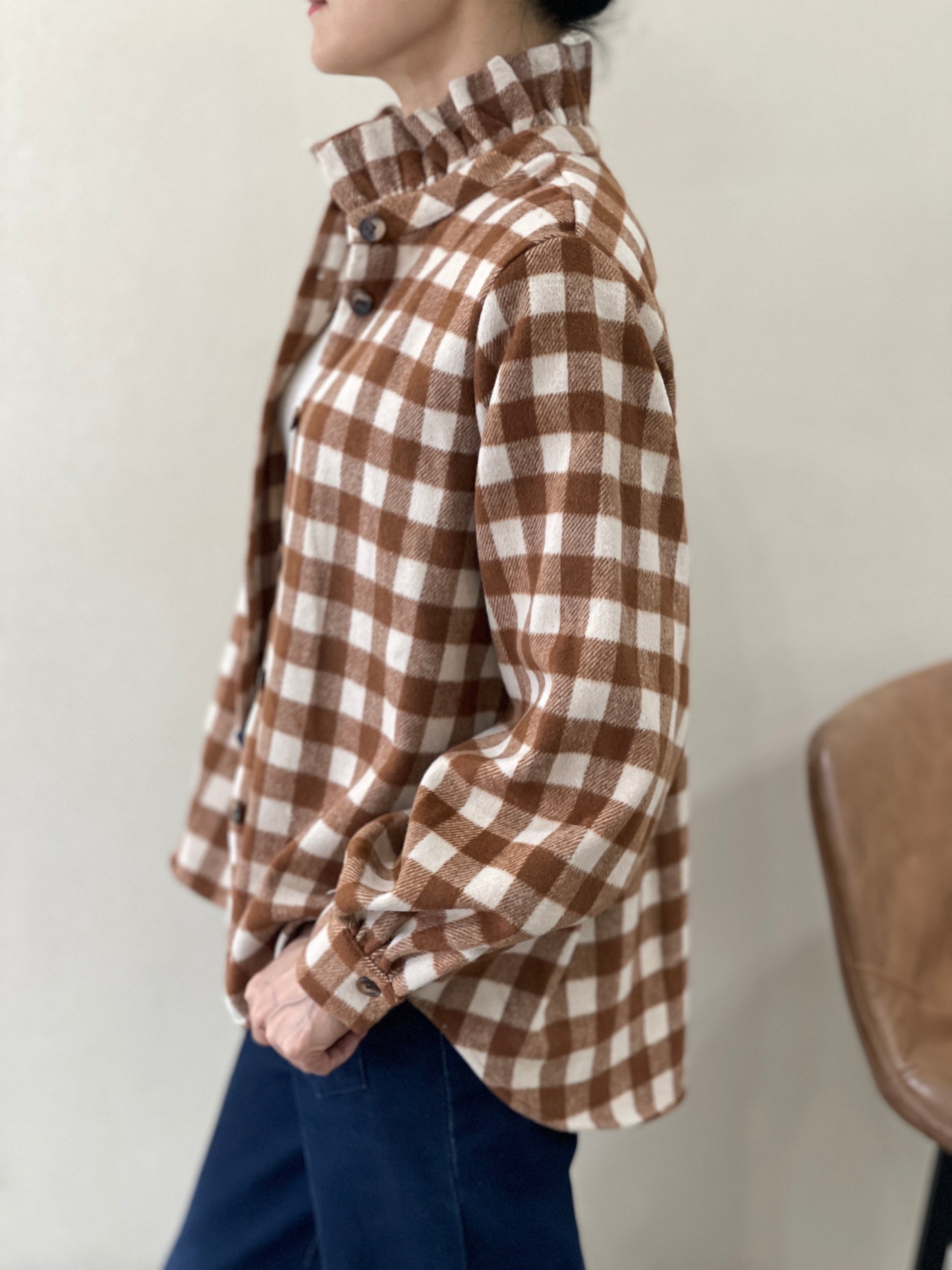 Son motif à carreaux, décliné en marron ou en bleu, apporte une touche rétro revisitée et se marie facilement avec vos tenues quotidiennes. Sa coupe droite, ses boutons contrastés et son col montant lui donnent une allure moderne et décontractée, parfaite pour un look casual chic.