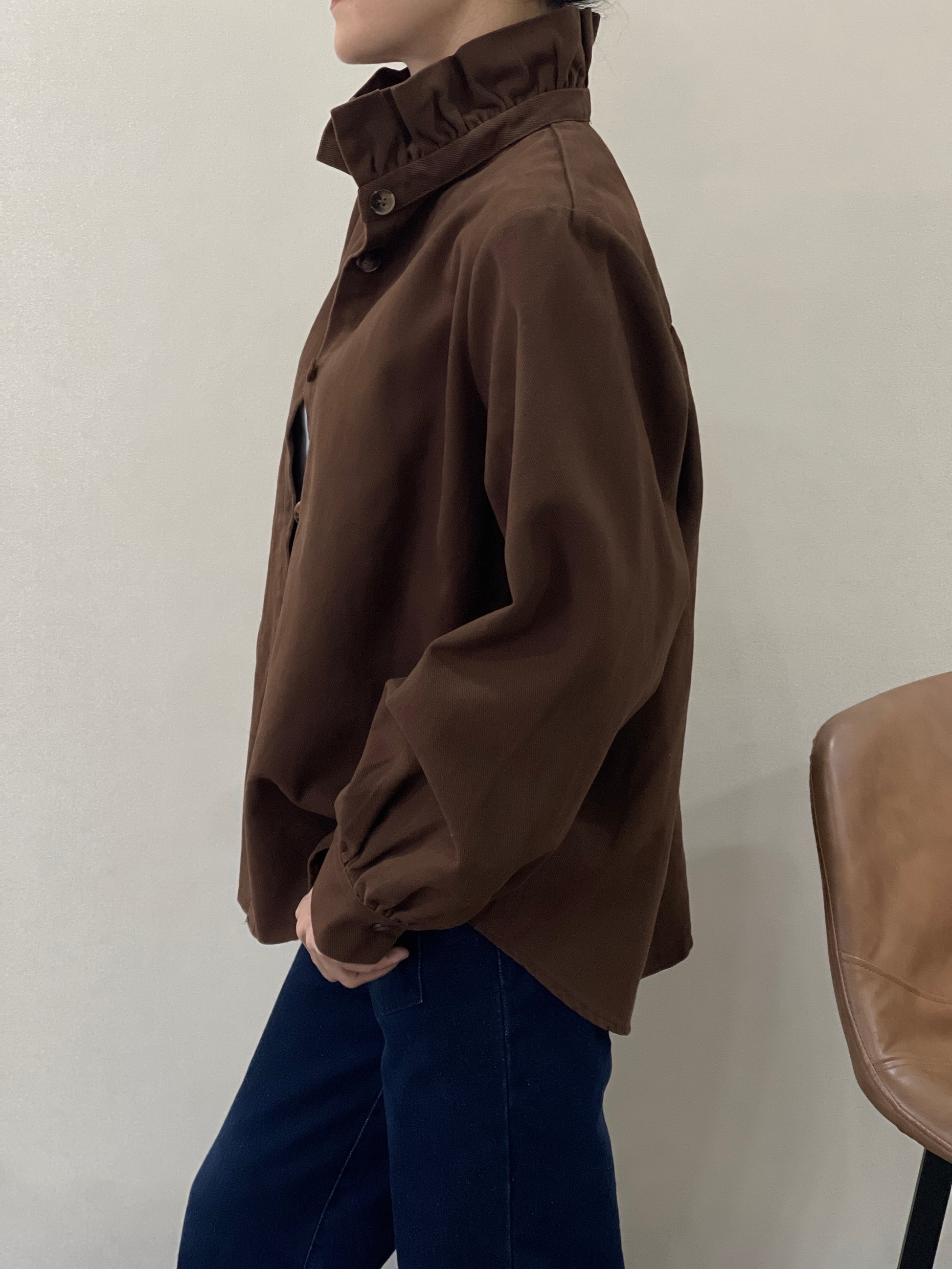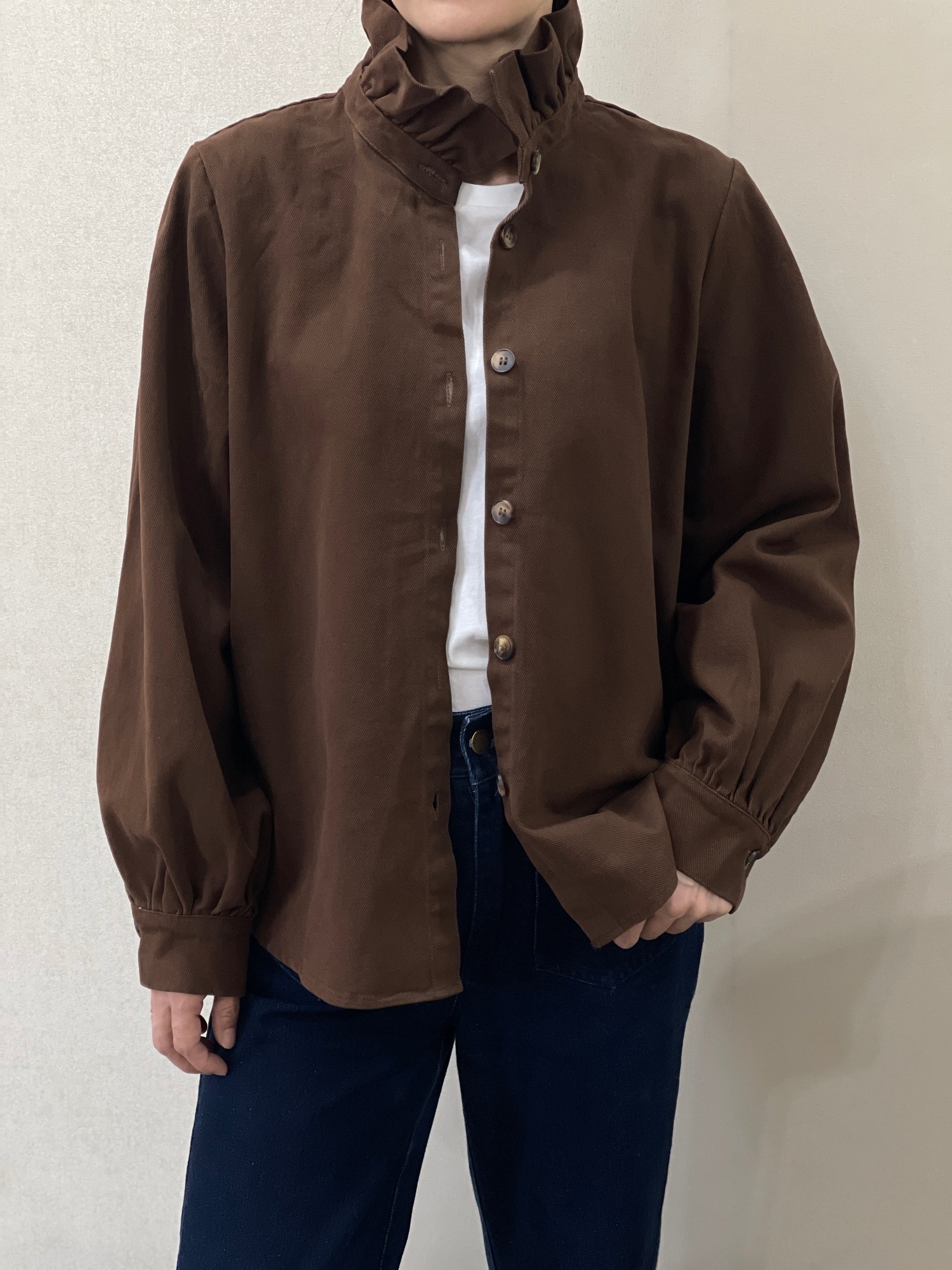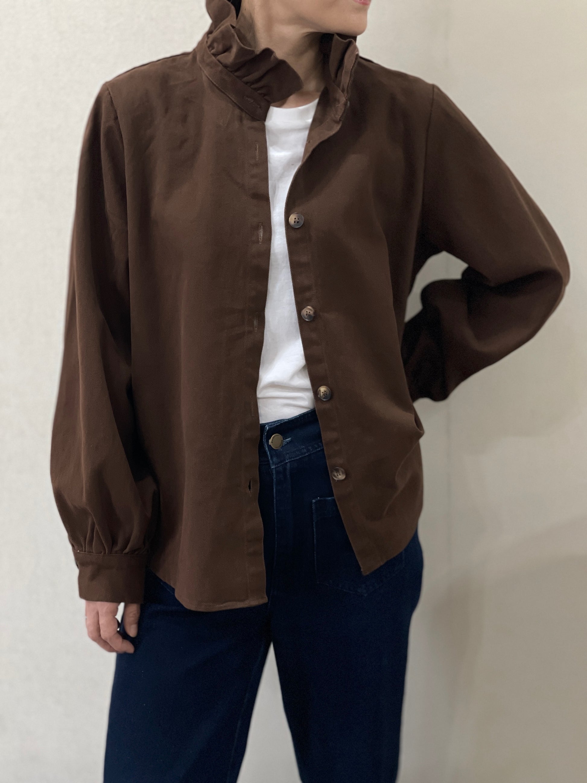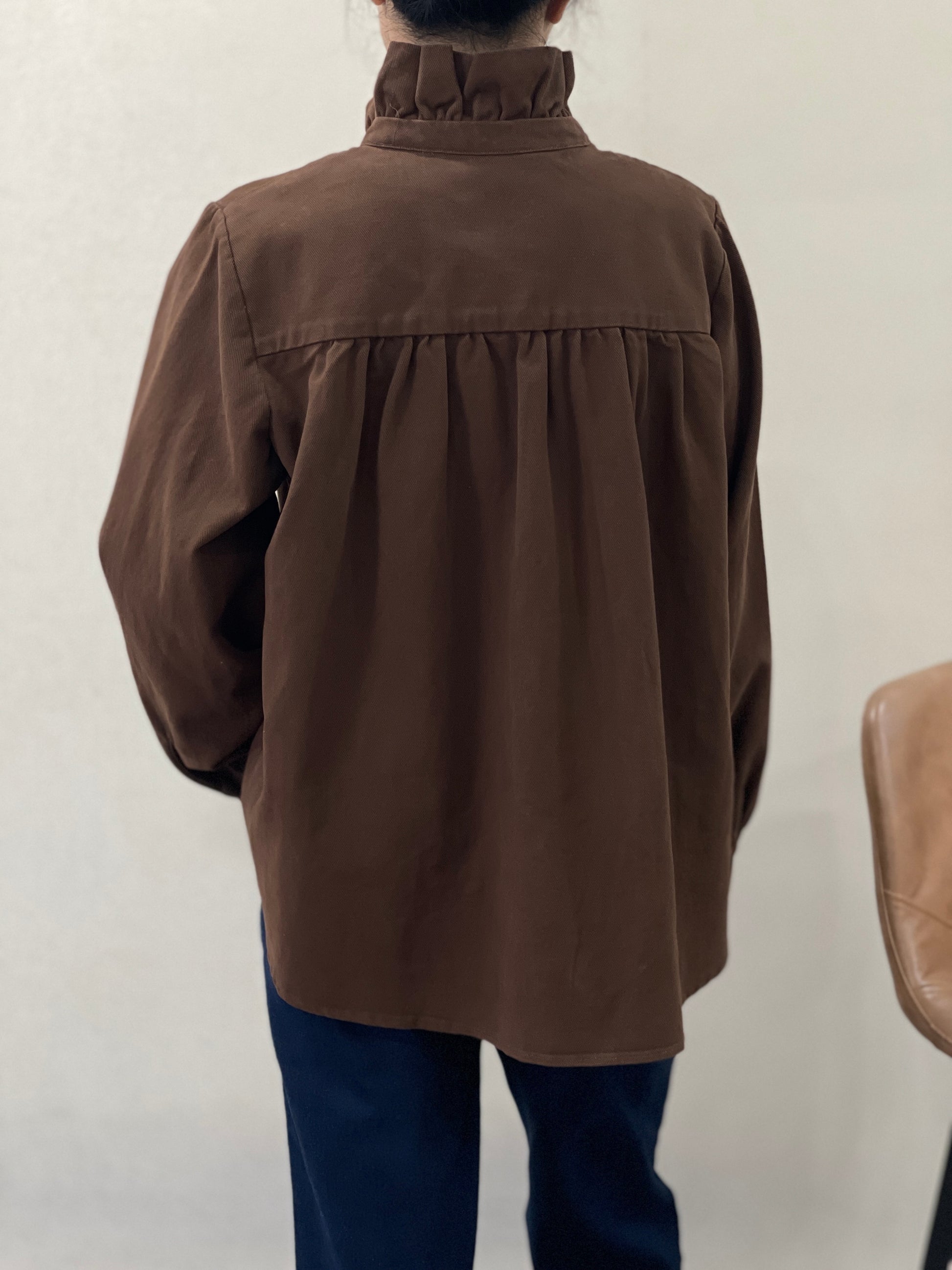 Confectionnée en coton de qualité, elle se distingue par son col montant froncé et ses manches longues légèrement bouffantes resserrées aux poignets. Sa fermeture boutonnée et sa coupe ample en font une pièce pratique et agréable à porter. Sa teinte kaki, intemporelle et facile à assortir, lui permet de s’intégrer parfaitement à un dressing bohème chic comme à une garde-robe plus urbaine.