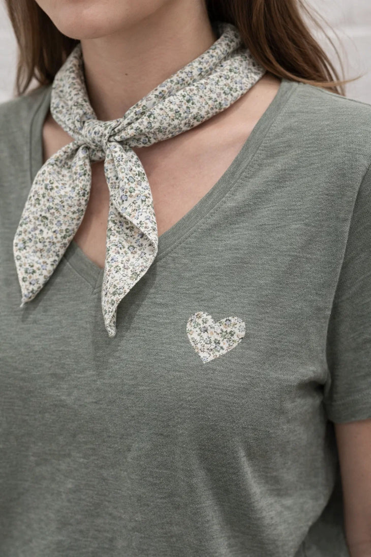 Ce tee-shirt en coton est bien plus qu’un basique. Avec son foulard assorti et son petit cœur délicatement placé sur la poitrine, il apporte immédiatement une touche chic et féminine à votre tenue.