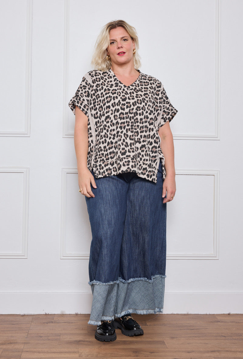 Avec son encolure en V flatteuse et ses manches courtes à revers, ce tee-shirt combine féminité et décontraction. L’imprimé léopard, intemporel et audacieux, s’adapte à toutes les saisons et se porte facilement, que ce soit pour une allure casual chic ou pour un look plus affirmé.