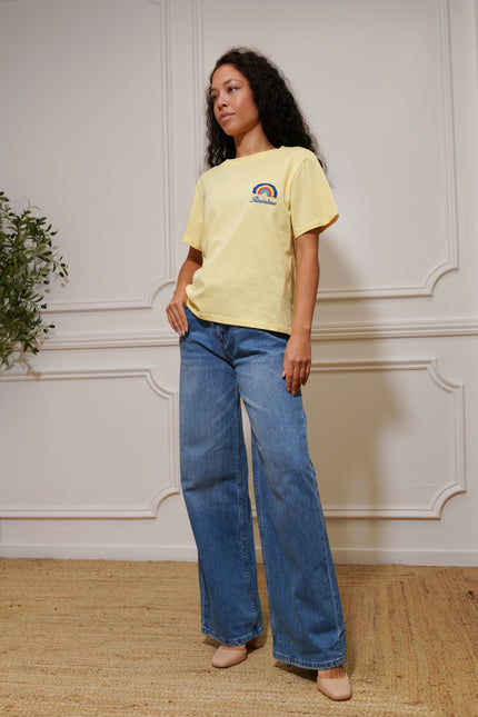 Conçu pour être porté facilement au quotidien, ce tee-shirt s’inscrit parfaitement dans l’univers Hippie Chic, mêlant simplicité, douceur et esprit feel good. Sa teinte jaune pastel illumine le teint et apporte de la fraîcheur à toutes vos tenues.