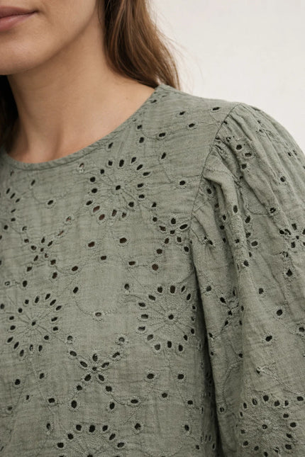 Son motif ajouré façon broderie anglaise lui donne ce petit côté bohème chic que l’on adore. Les manches légèrement volumineuses apportent du caractère tout en restant faciles à vivre au quotidien.