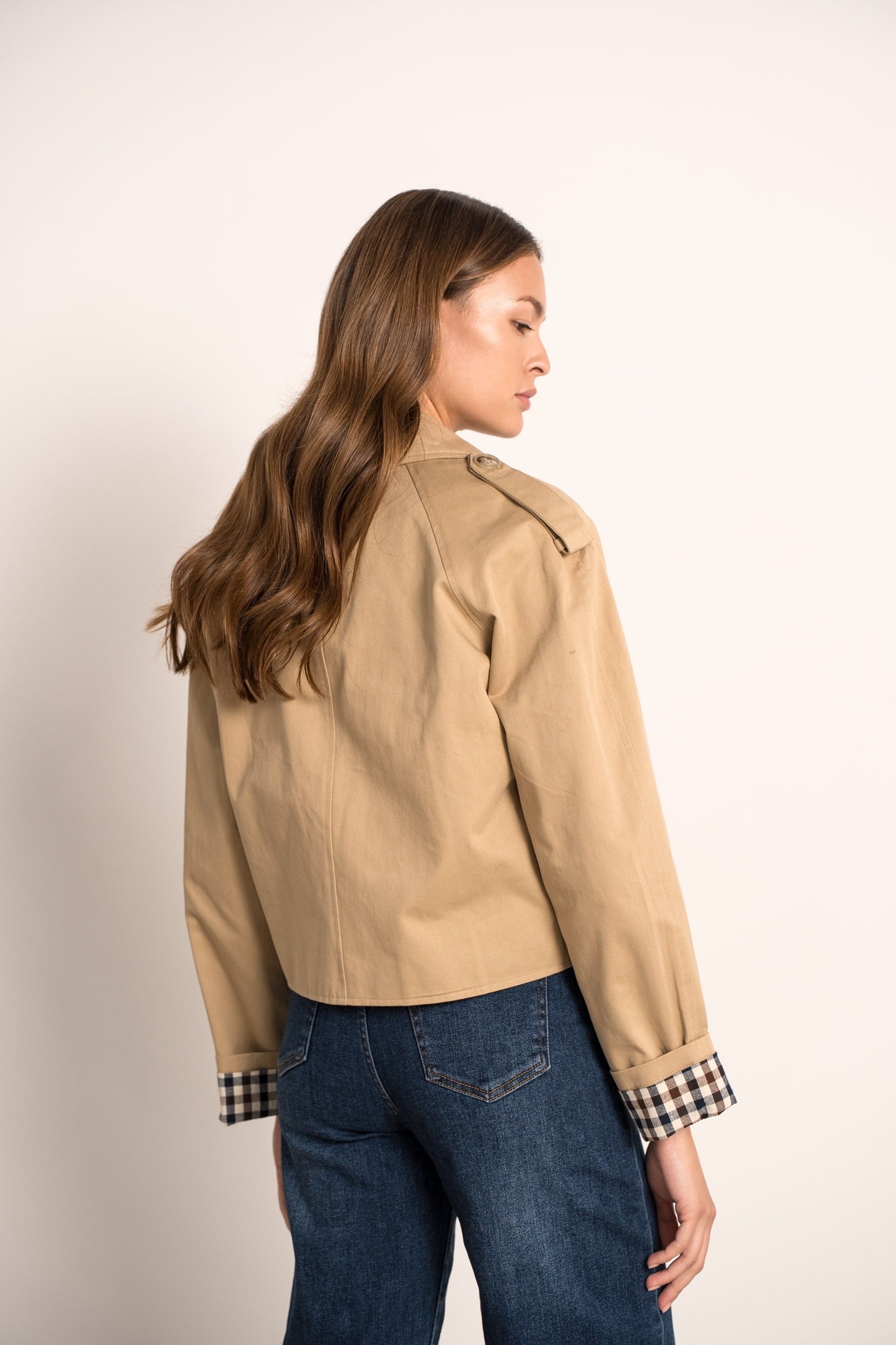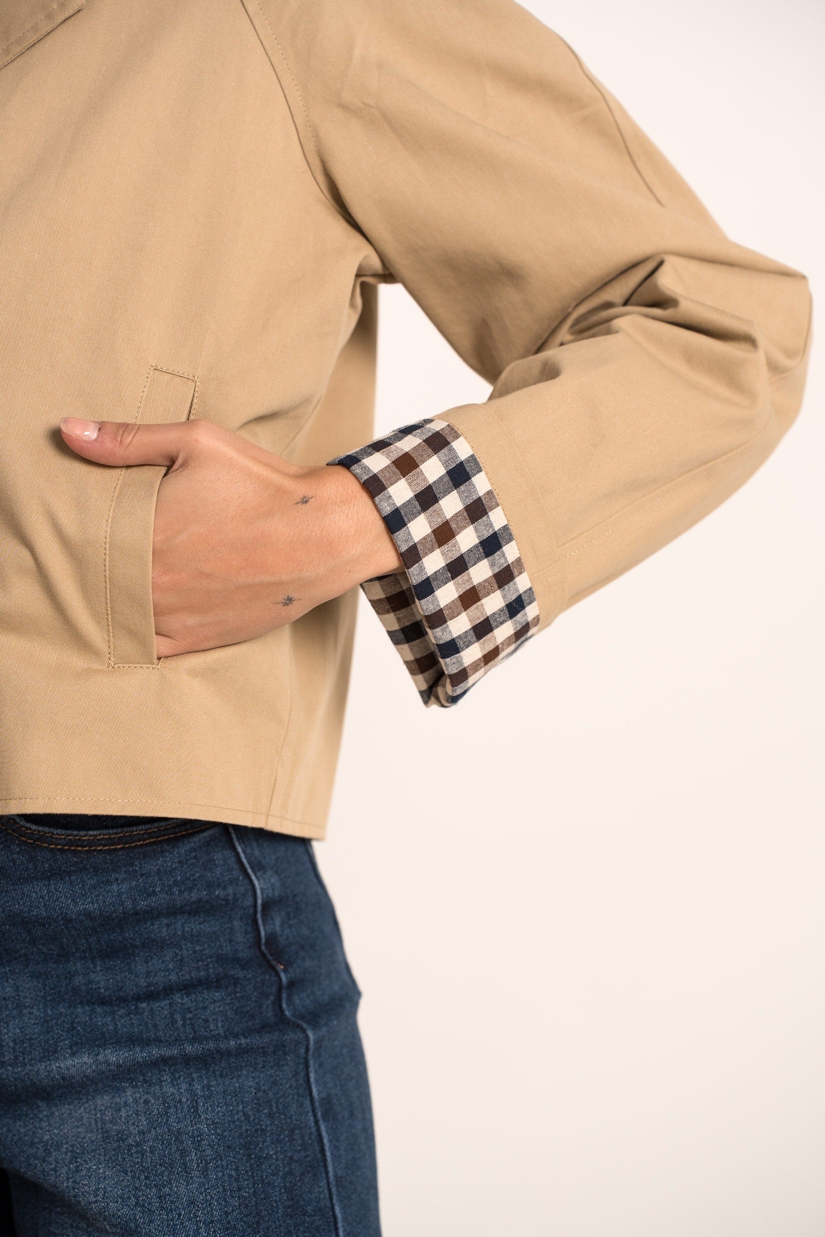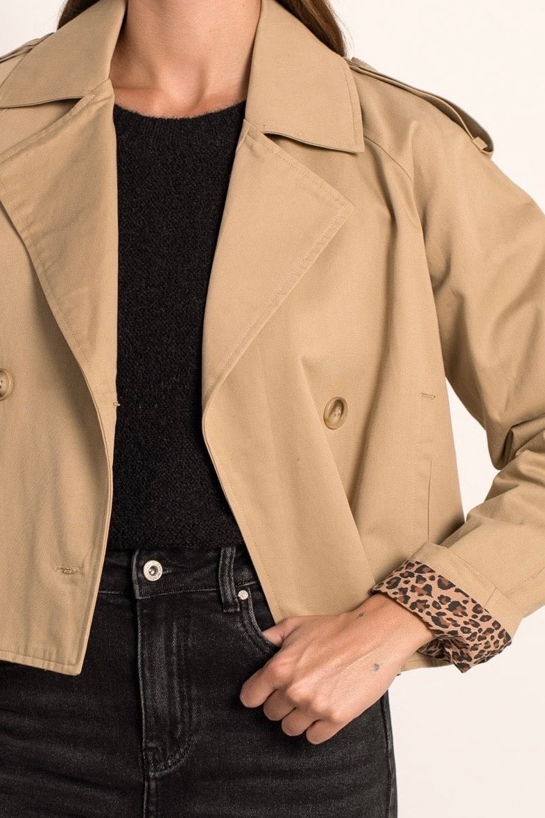Avec ses épaules boutonnées, son double boutonnage et sa doublure imprimé léopard ou Carreaux visible au revers des manches, cette veste associe subtilement le style classique du trench et une touche audacieuse. Léger et agréable à porter, il est confectionné en coton pour un confort optimal au quotidien, idéal pour la mi-saison.
