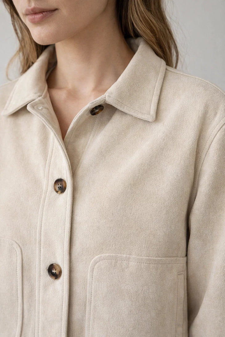 Confectionnée en 100 % polyester, elle offre un toucher doux façon suédine et une belle tenue. Les boutons effet écaille apportent une touche chaleureuse et raffinée. Les grandes poches plaquées renforcent son esprit casual chic tout en restant pratiques.